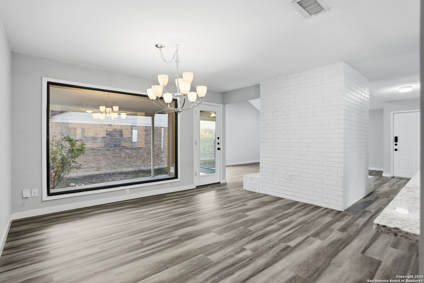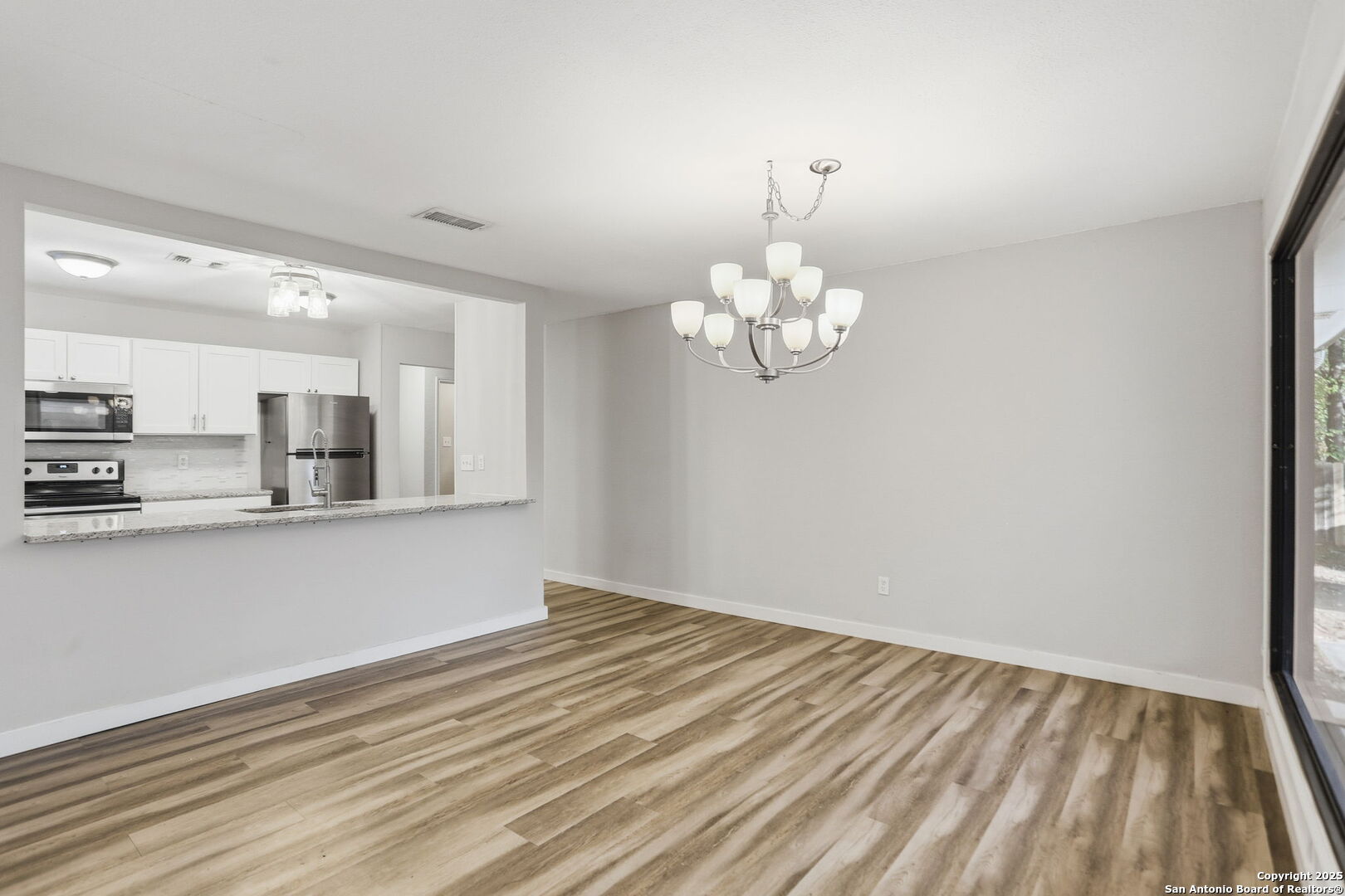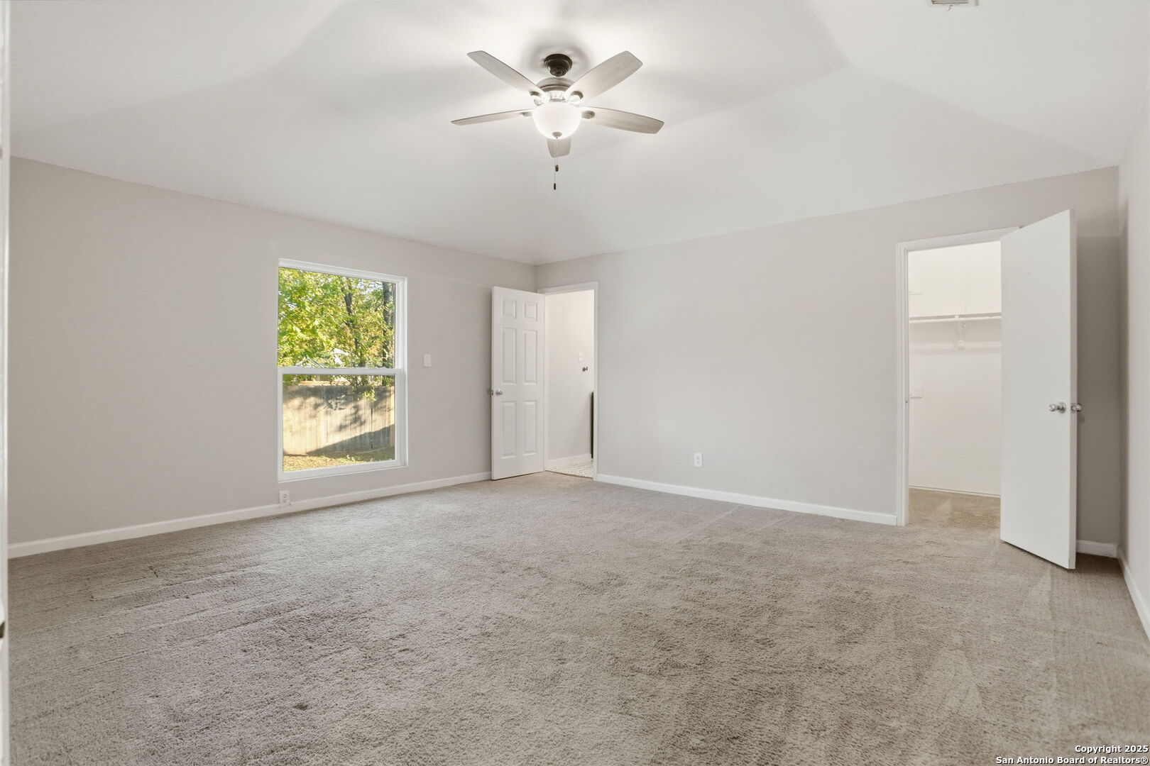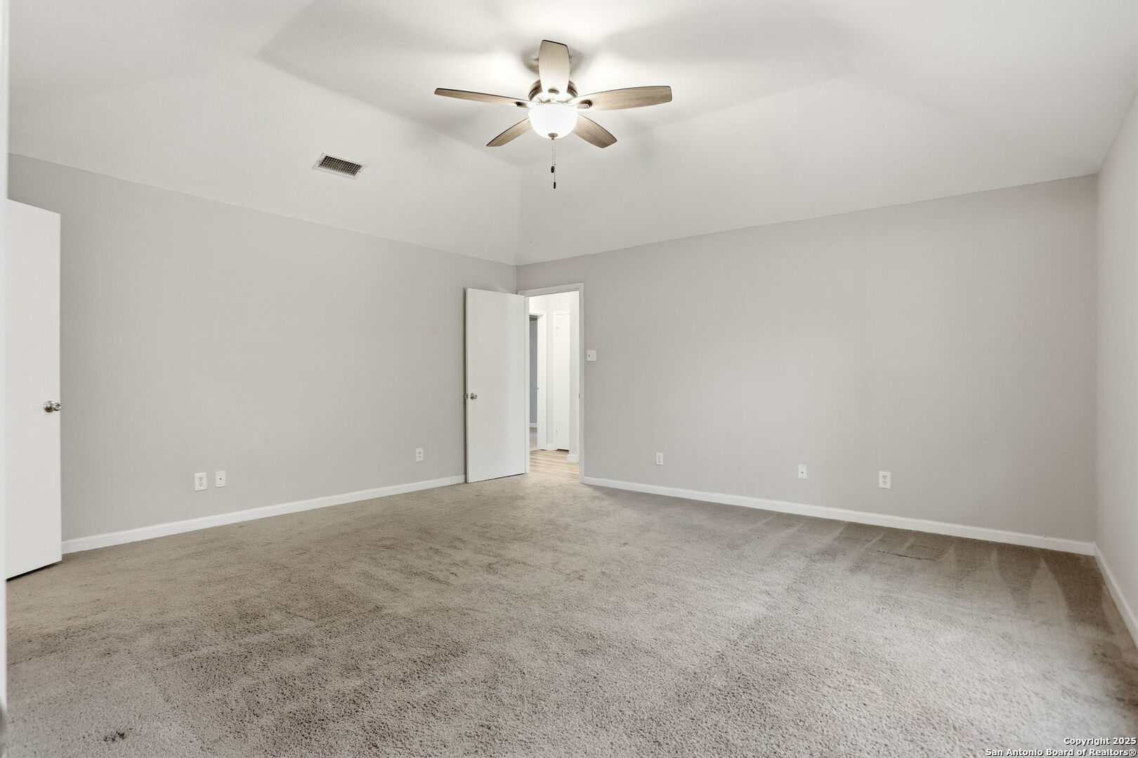 Single-story living * Greenbelt lot * Courtyard + covered patio * Near Culebra Rd and Loop 1604. This 3-bedroom, 2-bath home offers 1,798 square feet of single-story living on a fully fenced lot backing to a greenbelt. Built in 1983, the interior was remodeled in 2020 and features luxury vinyl plank flooring in the main living areas and kitchen, carpeted bedrooms, and neutral finishes throughout. Mature trees frame both the front and backyard, providing established outdoor space and privacy. The main living area includes a vaulted ceiling with exposed beam detail and a brick, wood-burning fireplace with gas starter. A separate dining area connects to the living space, while sliding glass doors provide access to the covered patio and backyard. The kitchen features white shaker-style cabinets, granite countertops, a tile backsplash, stainless steel appliances, an electric range, a built-in microwave, a dishwasher, and a deep basin sink with gooseneck faucet. The breakfast area opens to a private courtyard, creating an additional outdoor seating or dining space. The primary bathroom includes a dual vanity with stone countertop and a walk-in shower with glass enclosure. Secondary bedrooms include ceiling fans and standard closets. Additional features include a two-car garage, level lot, and a roof replaced approximately seven years ago. Located near Culebra Road and Loop 1604 with convenient access to Alamo Ranch shopping and dining. Situated in the highly regarded Northside ISD and close to parks, shopping, and dining, this home combines location, functionality, and access to community amenities. The HOA includes a pool, park and playground, sports court, BBQ grill, jogging trails, bike trails, clubhouse, tennis court, and basketball court. Includes a 3D tour or floor plan viewer. Don't miss the opportunity to make this single-story home your next move in Northwest San Antonio!