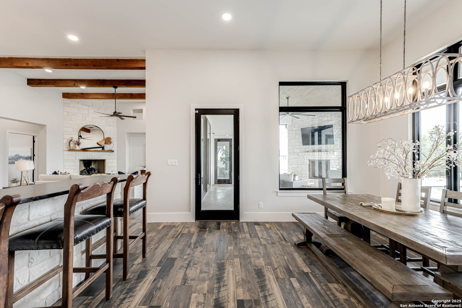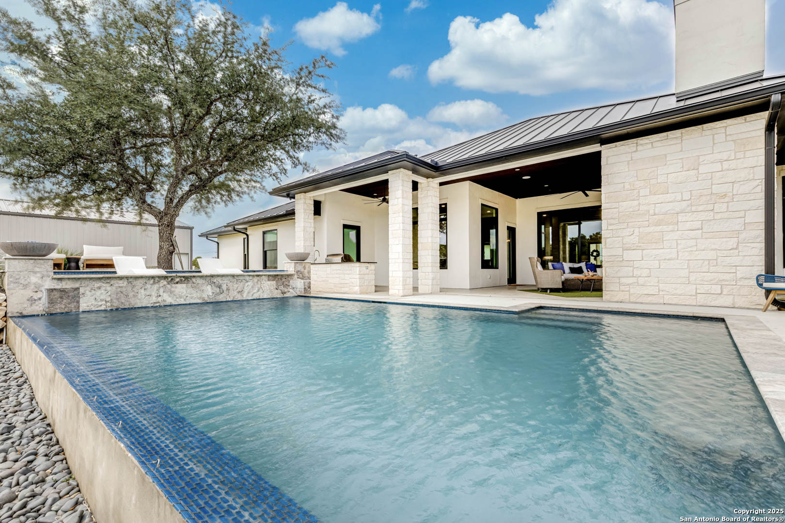 Set on 3.27 acres along a quiet creek, this custom single-story home offers privacy and thoughtful design just minutes from Boerne's top schools, dining, and conveniences. The main living area features beamed ceilings, a gas fireplace, and sliding glass doors that open to the covered patio. Outside, a second fireplace, full outdoor kitchen, pool, and outdoor half bath create a seamless space for relaxing or entertaining. The kitchen includes marble surfaces, a large island, built-in appliances, and a 6-burner gas cooktop, along with a wet bar and spacious butler's pantry. The laundry room provides extra storage and workspace, a half bath serves guests, and a separate office offers quiet and privacy. Three secondary bedroom suites each feature their own full bath, while the primary suite opens to the patio and pool. The primary bath includes separate marble vanities, an oversized walk-in shower, a freestanding tub, and a custom closet with a built-in island. A 3-car oversized garage adds convenience, and the 40x50 (2,000 sq ft) shop with plumbing and electrical offers exceptional space for vehicles, equipment, projects, or future use. With long views, no rear neighbors, and a true Hill Country setting, this property delivers space, privacy, and comfort close to town.