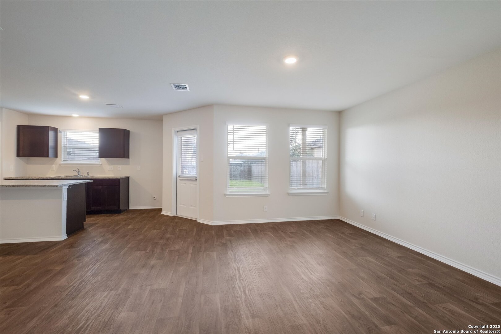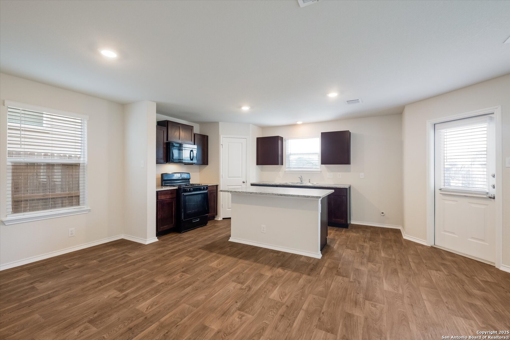 This 3 bedroom, 2.5 bath home showcases an open concept floor plan with a 2nd living area upstairs! As you enter, you are greeted by the open living and dining areas with kitchen. The kitchen is equipped with a gas cooktop, built-in microwave, full size pantry and island with seating. The owner's retreat offers vanity seating and walk-in closet. Designer touches include vinyl flooring, granite countertops, rich espresso cabinetry and can lighting. The covered back patio
