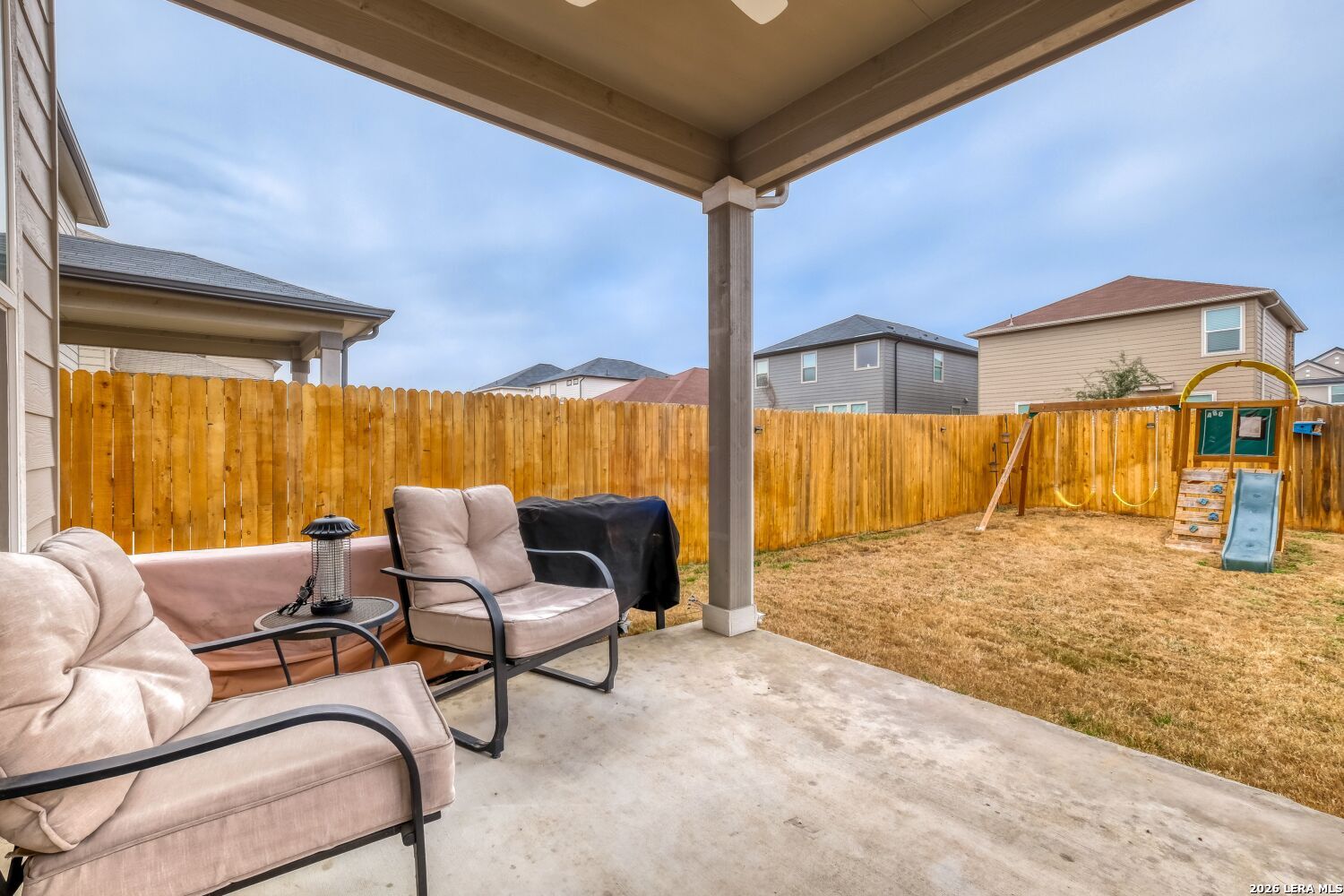Welcome home to this meticulously-maintained, move-in ready home, centrally located in the Willow View community, offering ample space, functionality, and flexibility. This beautifully designed, 2-story home, situated on a large, quiet street, features an open-floor plan designed for comfortable, everyday living with commuter-friendly accessibility. The kitchen includes a large center island, granite countertops, custom cabinetry, and ample storage and prep space. It opens directly to the main living and dining areas, creating a seamless flow throughout the first floor. Upstairs, the spacious primary suite offers a private retreat with a large walk-in closet and an oversized bathroom designed for comfort and relaxation. All the secondary bedrooms are generously sized and cozy. A versatile loft area provides additional living space that can be used as a media room, home office, exercise area, or playroom. The backyard includes a covered porch, outdoor lighting for entertaining, and a playset for children. Additional features include a water softener system and built-in garage storage ideal for military gear, outdoor equipment, and seasonal items. Conveniently located near Loop 1604, Interstate 10, Randolph Air Force Base, Fort Sam Houston, and The Forum, you'll enjoy quick access to shopping, entertainment, dining, major employers, and everything the northeast side of San Antonio has to offer. Charming, functional, and ideally located - 6519 Runaway Row is ready to welcome you home. Schedule a showing and be amazed!