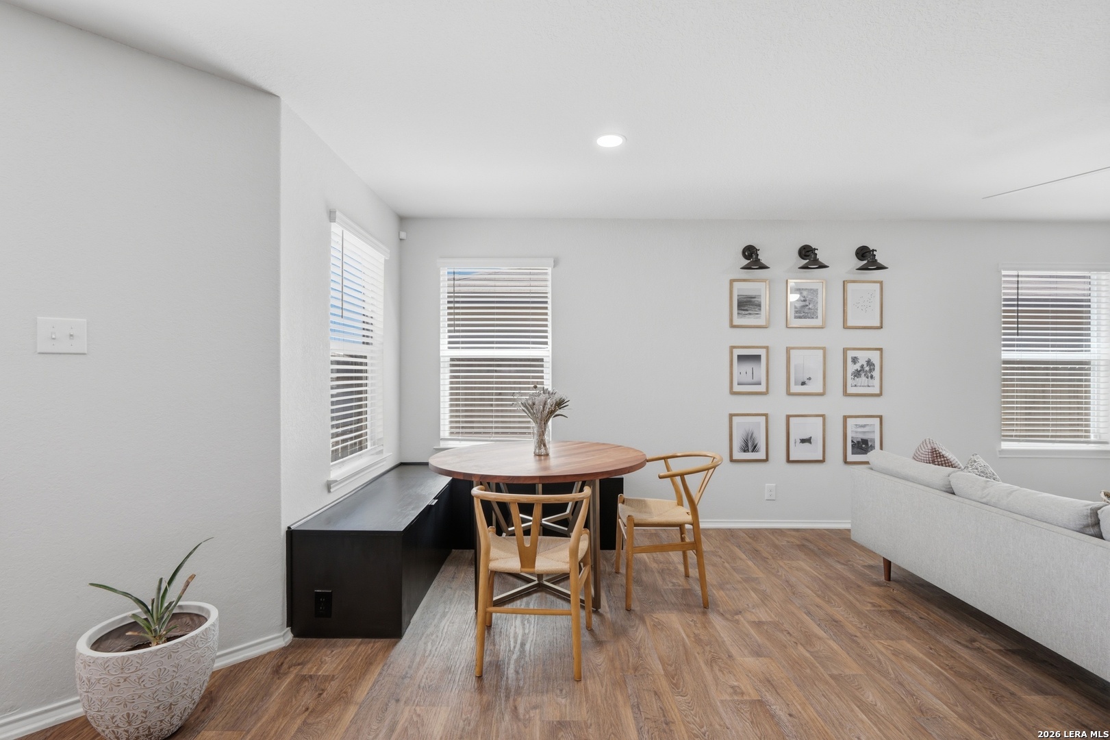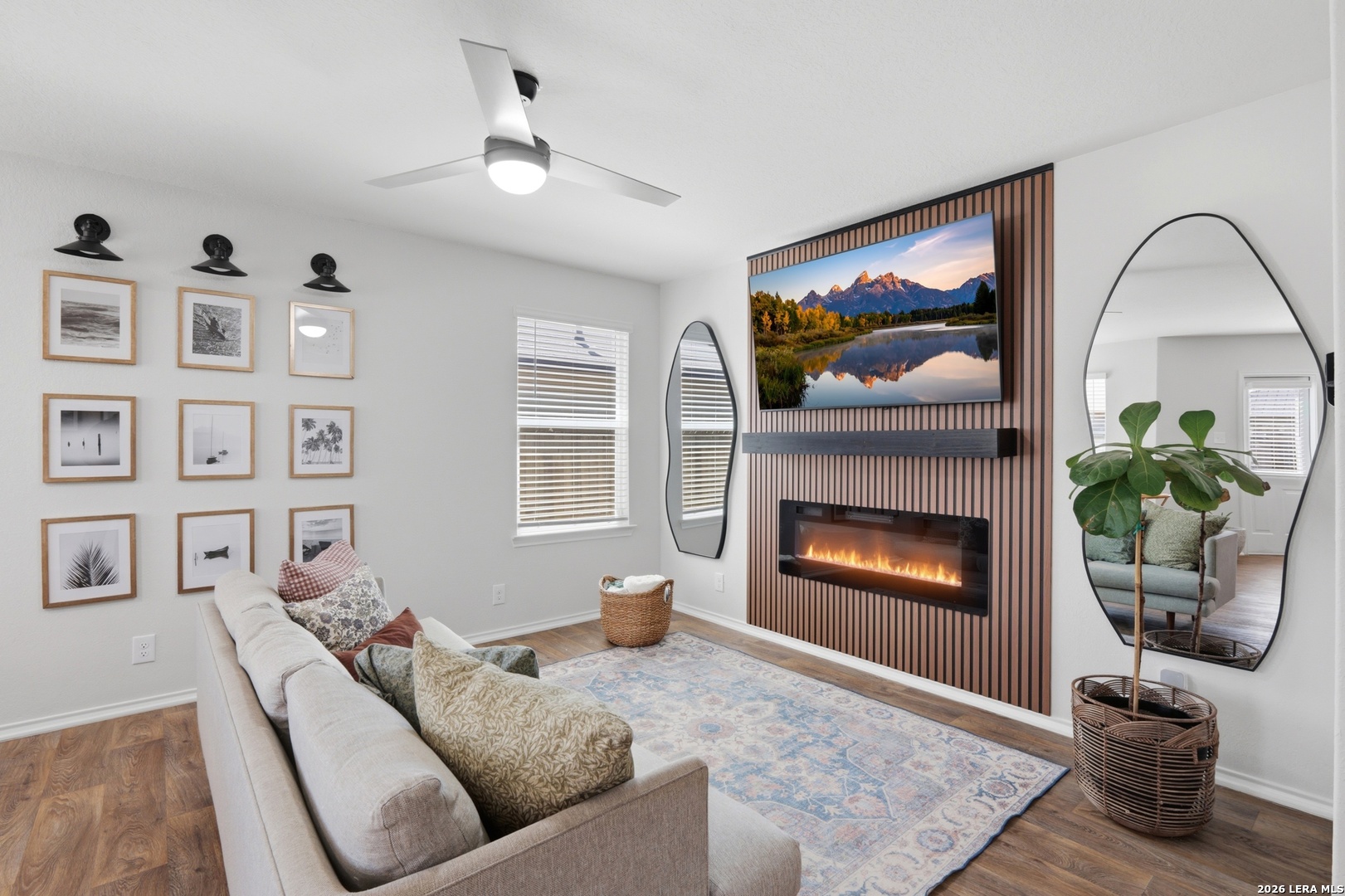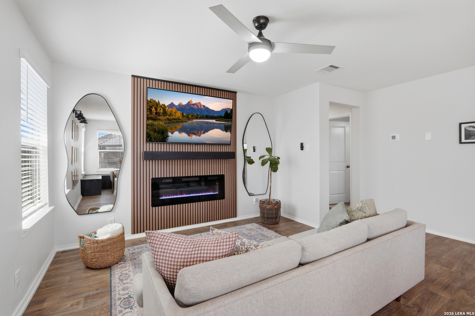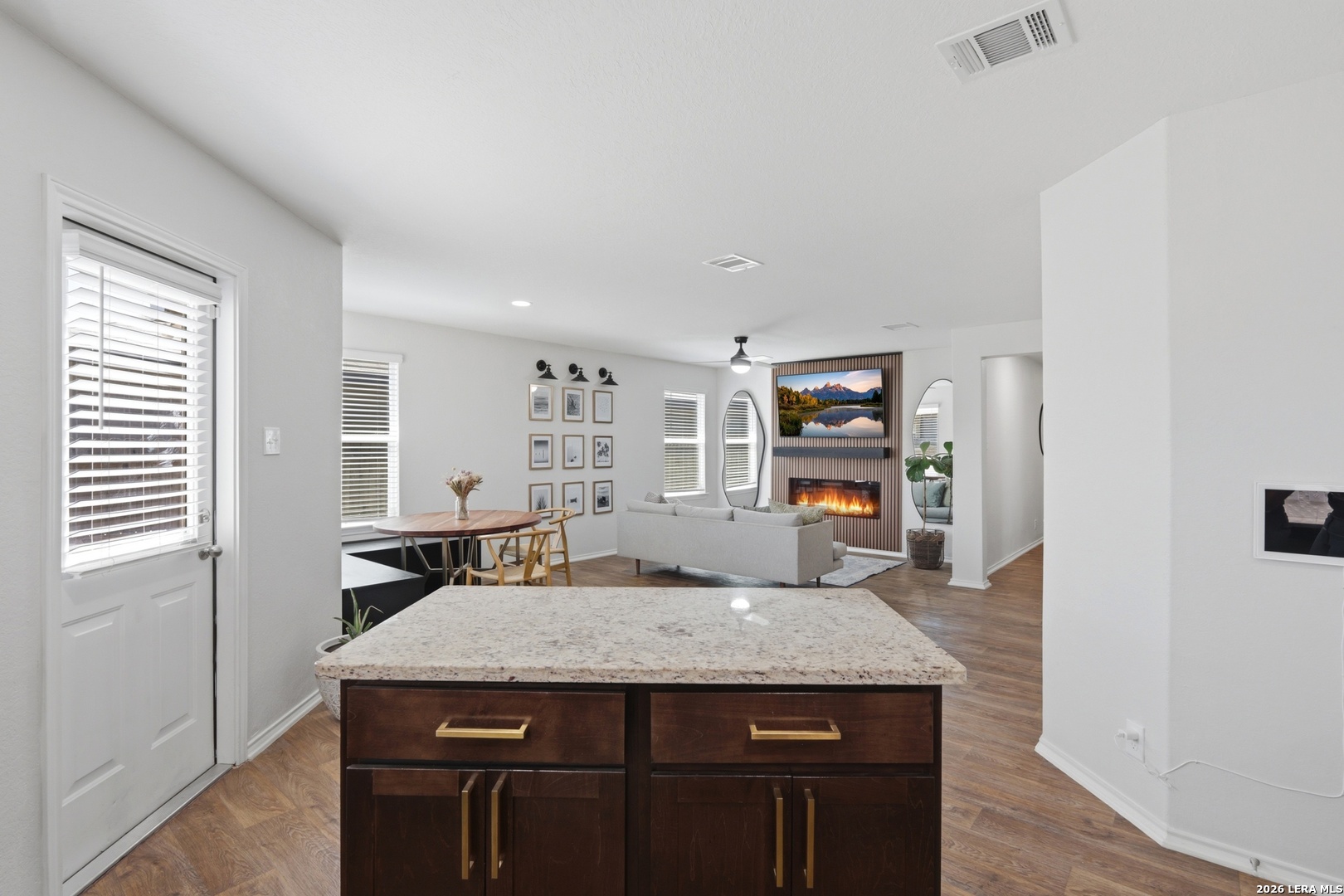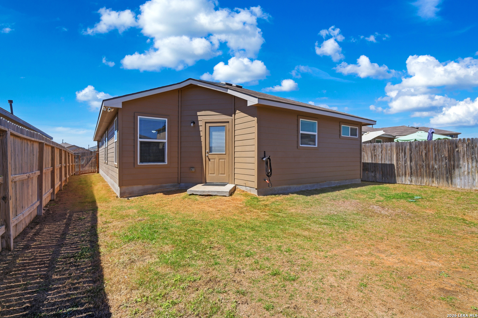 Welcome to this beautifully designed single-story home in the desirable Whisper Falls community, offering modern finishes, and an inviting open-concept layout. Built in 2022 by D.R. Horton, this 3-bedroom, 2-bath residence combines contemporary style with everyday functionality. Step inside to a bright and airy living space featuring wood-look flooring, high ceilings, and a custom accent wall with an electric fireplace, creating a warm and sophisticated focal point. The open layout flows seamlessly into the dining area and well-appointed kitchen, complete with granite countertops, island seating, and ample cabinetry. The private primary suite offers a relaxing retreat with a spacious layout, walk-in closet, and an ensuite bath featuring a modern vanity and tub/shower combination. Secondary bedrooms are generously sized and share a well-designed full bath. Enjoy outdoor living in the fully fenced backyard, complete with a covered gazebo lounge area. The home also includes a dedicated laundry room, attached garage, and energy-efficient features such as double-pane windows and programmable thermostat. Residents of Whisper Falls enjoy access to exceptional community amenities including a resort-style pool, playground, jogging trails, and sports courts, all within Medina Valley ISD and conveniently located near Loop 1604 for easy commuting. This gently lived in home is turnkey and has SO many modern updates that you will instantly fall in LOVE! Schedule your home tour TODAY before it's too late!