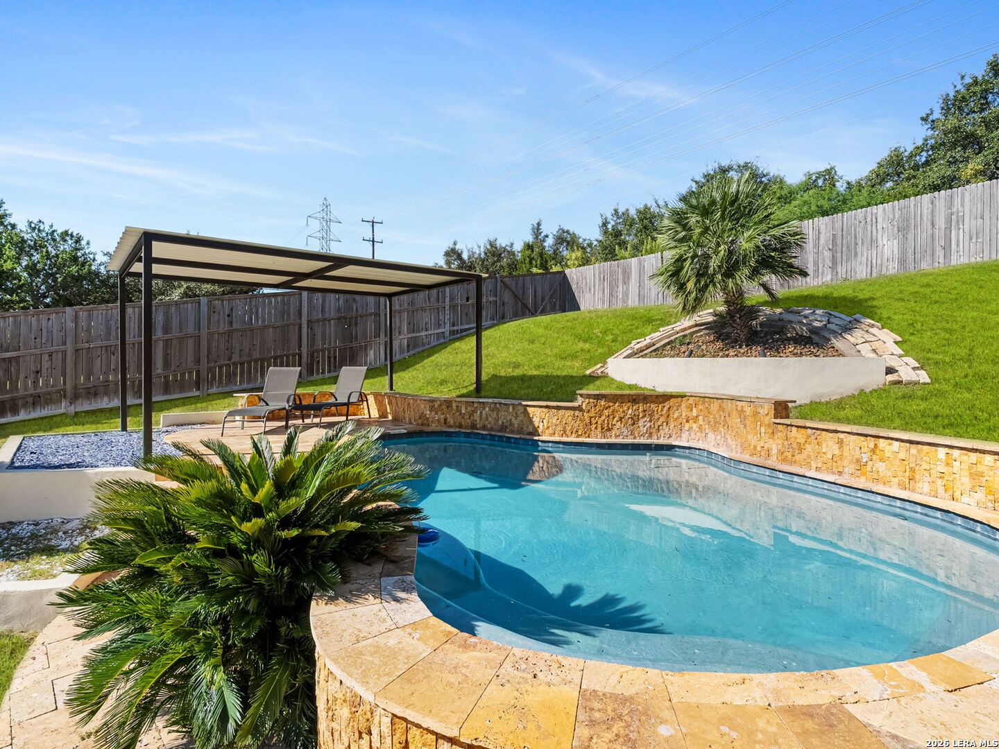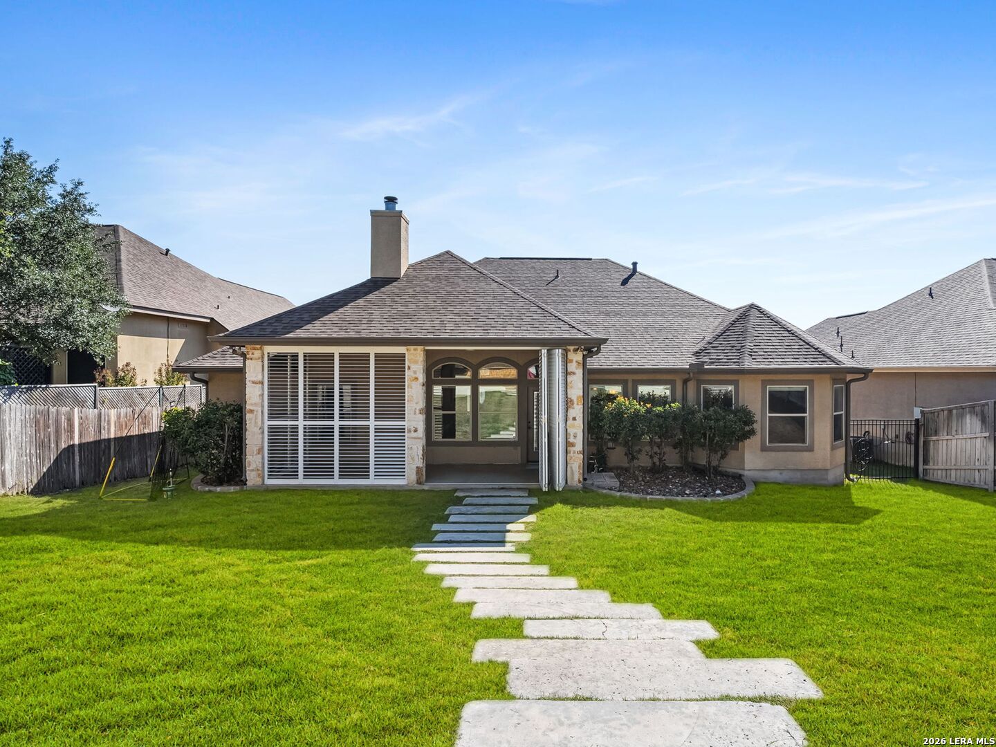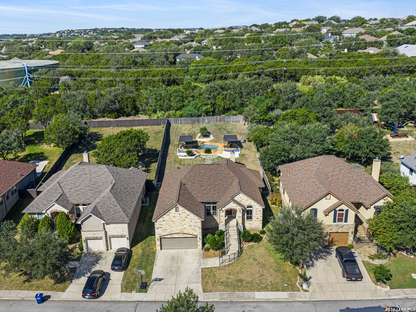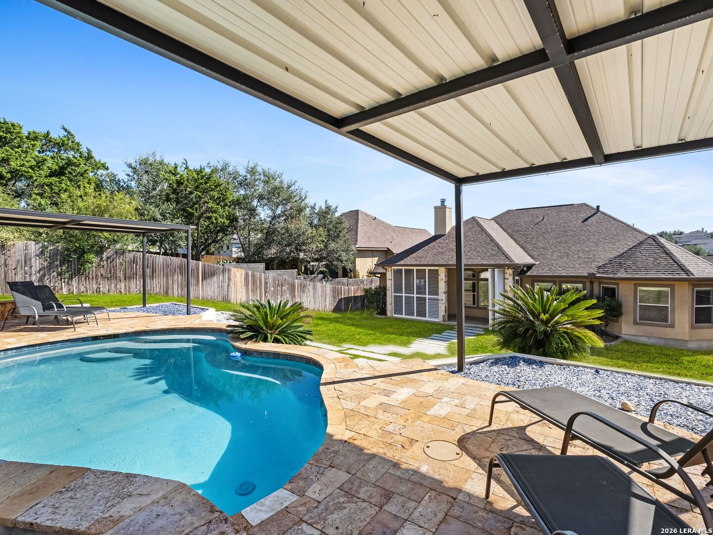 Everyday staycation living awaits the highly sought-after The Renaissance at The Vineyard community with this rare find and a few chances in the neighborhood to enjoy the luxury of your own private pool on a 0.29-acre greenbelt lot built by Broll Homes. This is the one! Architecturally striking with soaring vaulted ceilings and an open-concept design, this one-story residence combines the luxury of a well-maintained home. Located less than 1.5 miles outside Loop 1604, between Rogers Ranch and Huebner Rd, this property combines a prime location with timeless architectural charm. Step inside and discover a thoughtfully designed floor plan offering three spacious bedrooms, two full baths, one half bath, a formal dining room, and a dedicated study. A unique oversized storage space above the garage offers tremendous potential. With the addition of an AC unit, this area can easily transform into another entertainment room, game room, or media retreat, adding even greater versatility to the home. The family room with soaring vaulted tray design ceilings seamlessly flows into the chef's kitchen, where upgraded finishes and an open breakfast area create an inviting hub for everyday living and entertaining. The kitchen includes granite countertops, an electric stove and oven range with a wall-mounted range hood, subway tile backsplash, and some glass-front white cabinetry with handles. The spacious primary suite with a bay window that adds space overlooks the pool, and the en-suite spa-like bathroom features a walk-in shower, tub, double granite countertop sinks, and a walk-in closet. Vaulted ceilings extend outside into the covered patio with a ceiling fan, white aluminum privacy shutters, and louvered folding doors, where the sparkling private pool awaits. A stone pathway leads to the pool, the striking centerpiece of the backyard, featuring a sleek modern design framed by two covered cabanas that provide shade and create the perfect year-round retreat. Also comes with gutters and a water irrigation system in the front and back. Upgrades done after purchase you'll appreciate: replaced carpet in the bedrooms with wood flooring, chandeliers, painted cabinets white, and changed kitchen backsplash to subway tile. Life in the Renaissance community is more than just homeownership; it's a lifestyle. Residents enjoy low HOA fees and access to premier amenities, including a vibrant community centered around connection, wellness, and lifestyle amenities. Enjoy a community pool, basketball court, playground, and programs like the Vineyard Vipers swim team, youth volunteer opportunities, and a variety of neighborhood activities. There are services such as regular grounds maintenance and security patrols that help keep the neighborhood. Conveniently located near Loop 1604, US 281, and IH-10, you'll enjoy quick access to premier destinations like Canyon Springs Golf Club, TPC Parkway, JW Marriott Hill Country Resort, The Rim, La Cantera, and top local parks such as Eisenhower, Phil Hardberger, and McAllister. With nearby access to Camp Bullis and the airport, the location is as practical as it is beautiful. Surrounded by top-tier public and private schools and nestled in a community that feels like a retreat, this home isn't just a place to live; it's a story waiting to unfold. Part of the highly acclaimed Northeast I.S.D., known for its top-rated schools and strong academic and extracurricular programs, making this home as practical as it is beautiful. With its rare private pool, unbeatable location, and unmatched community amenities, this home is a true standout, offering a unique opportunity to own a move-in-ready residence that feels like a permanent vacation.