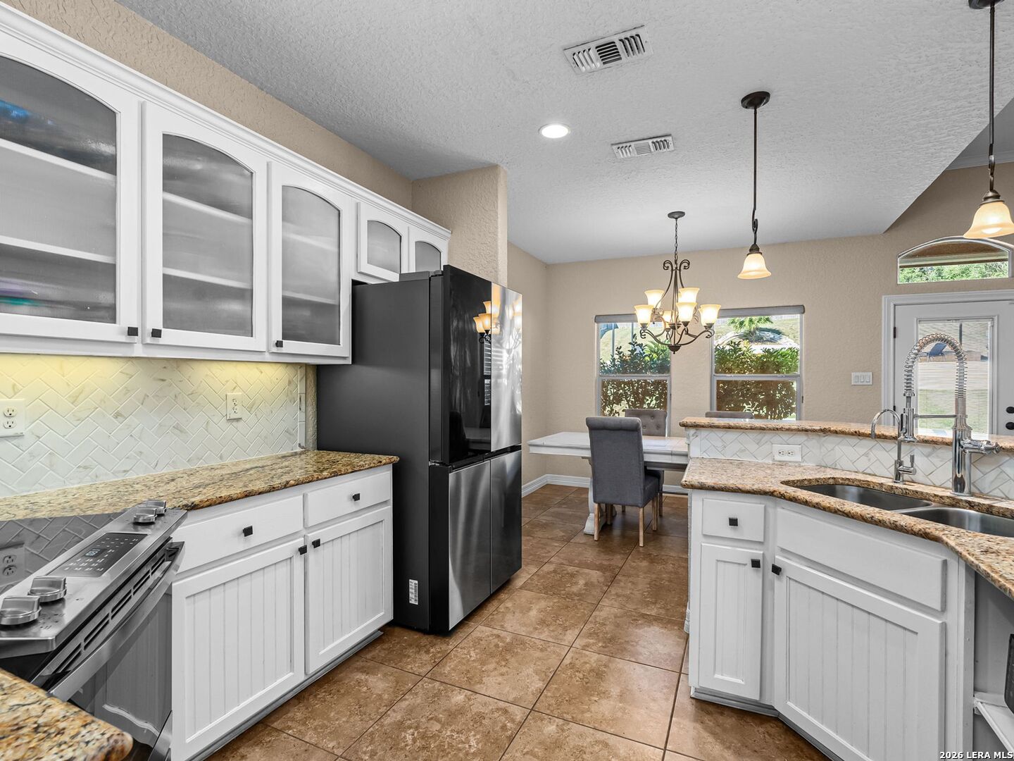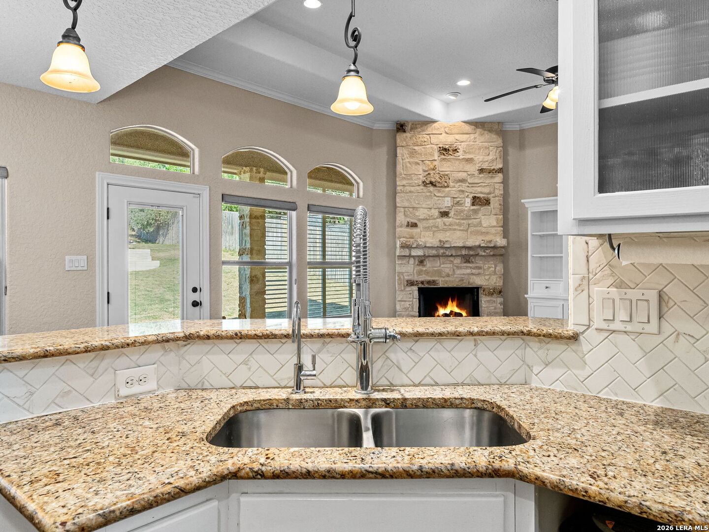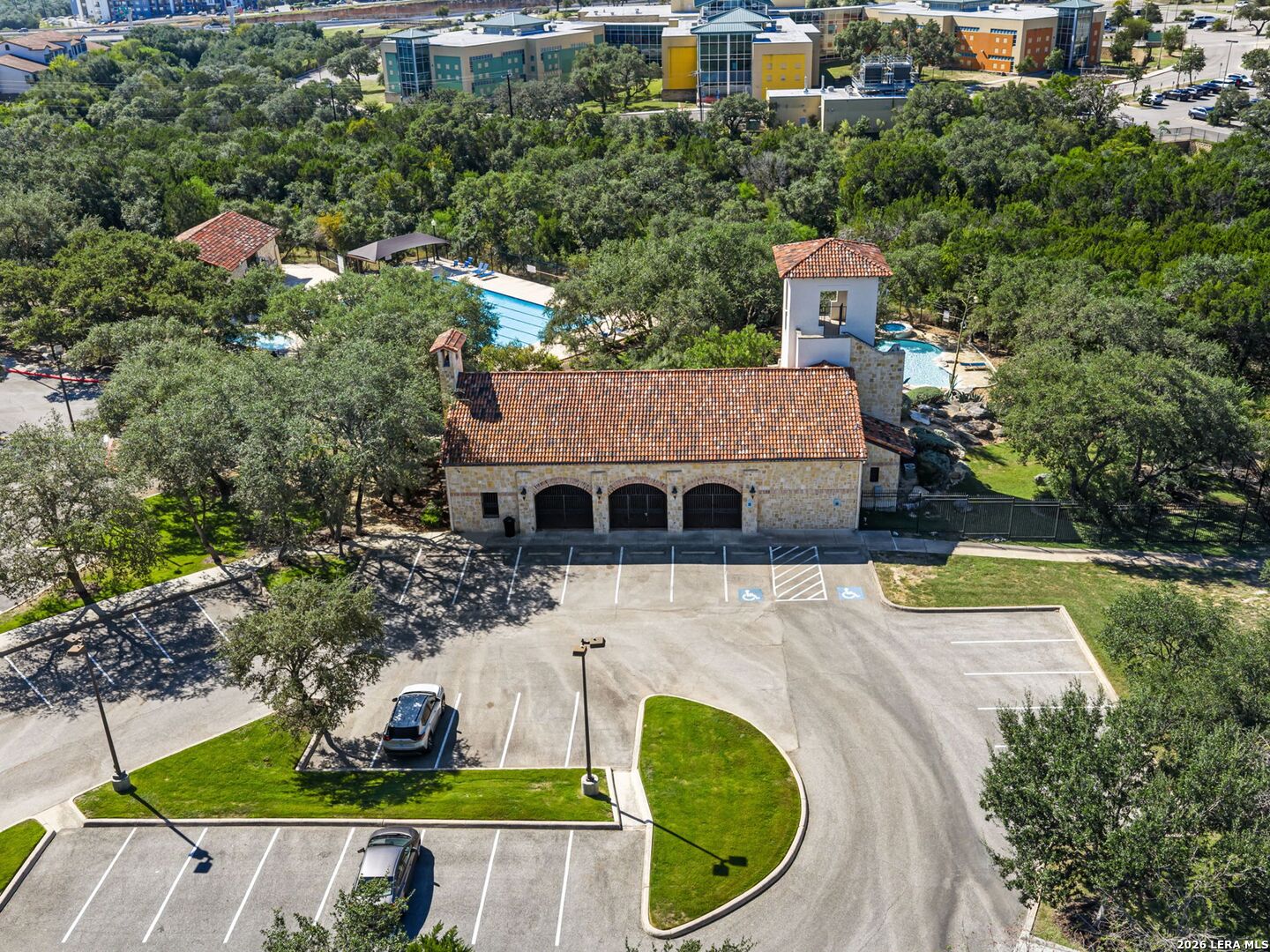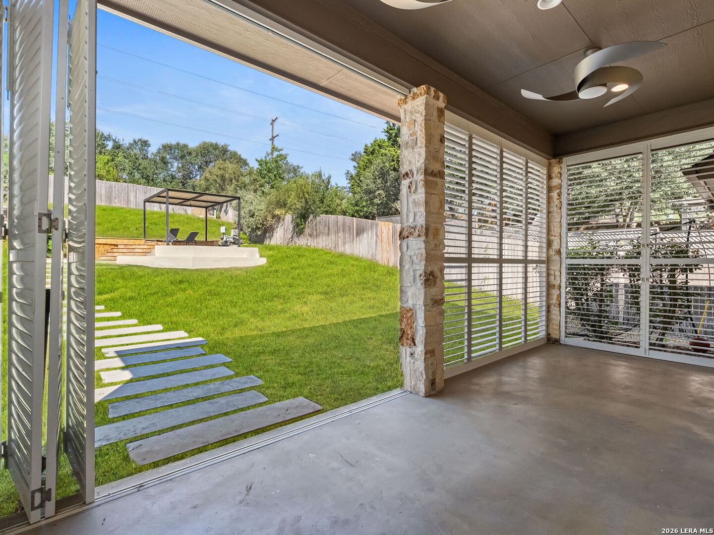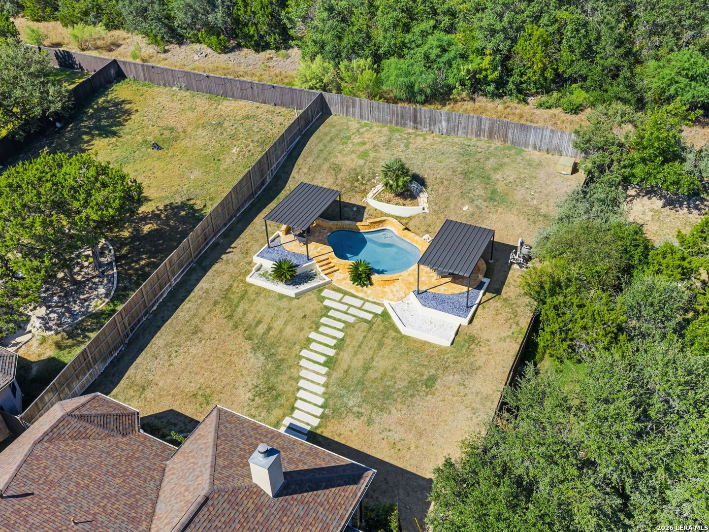Everyday staycation living awaits the highly sought-after The Renaissance at The Vineyard community with this rare find and a few chances in the neighborhood to enjoy the luxury of your own private pool on a 0.29-acre greenbelt lot built by Broll Homes. This is the one! Architecturally striking with soaring vaulted ceilings and an open-concept design, this one-story residence combines the luxury of a well-maintained home. Located less than 1.5 miles outside Loop 1604, between Rogers Ranch and Huebner Rd, this property combines a prime location with timeless architectural charm. Step inside and discover a thoughtfully designed floor plan offering three spacious bedrooms, two full baths, one half bath, a formal dining room, and a dedicated study. A unique oversized storage space above the garage offers tremendous potential. With the addition of an AC unit, this area can easily transform into another entertainment room, game room, or media retreat, adding even greater versatility to the home. The family room with soaring vaulted tray design ceilings seamlessly flows into the chef's kitchen, where upgraded finishes and an open breakfast area create an inviting hub for everyday living and entertaining. The kitchen includes granite countertops, an electric stove and oven range with a wall-mounted range hood, subway tile backsplash, and some glass-front white cabinetry with handles. The spacious primary suite with a bay window that adds space overlooks the pool, and the en-suite spa-like bathroom features a walk-in shower, tub, double granite countertop sinks, and a walk-in closet. Vaulted ceilings extend outside into the covered patio with a ceiling fan, white aluminum privacy shutters, and louvered folding doors, where the sparkling private pool awaits. A stone pathway leads to the pool, the striking centerpiece of the backyard, featuring a sleek modern design framed by two covered cabanas that provide shade and create the perfect year-round retreat. Also comes with gutters and a water irrigation system in the front and back. Upgrades done after purchase you'll appreciate: replaced carpet in the bedrooms with wood flooring, chandeliers, painted cabinets white, and changed kitchen backsplash to subway tile. Life in the Renaissance community is more than just homeownership; it's a lifestyle. Residents enjoy low HOA fees and access to premier amenities, including a vibrant community centered around connection, wellness, and lifestyle amenities. Enjoy a community pool, basketball court, playground, and programs like the Vineyard Vipers swim team, youth volunteer opportunities, and a variety of neighborhood activities. There are services such as regular grounds maintenance and security patrols that help keep the neighborhood. Conveniently located near Loop 1604, US 281, and IH-10, you'll enjoy quick access to premier destinations like Canyon Springs Golf Club, TPC Parkway, JW Marriott Hill Country Resort, The Rim, La Cantera, and top local parks such as Eisenhower, Phil Hardberger, and McAllister. With nearby access to Camp Bullis and the airport, the location is as practical as it is beautiful. Surrounded by top-tier public and private schools and nestled in a community that feels like a retreat, this home isn't just a place to live; it's a story waiting to unfold. Part of the highly acclaimed Northeast I.S.D., known for its top-rated schools and strong academic and extracurricular programs, making this home as practical as it is beautiful. With its rare private pool, unbeatable location, and unmatched community amenities, this home is a true standout, offering a unique opportunity to own a move-in-ready residence that feels like a permanent vacation.