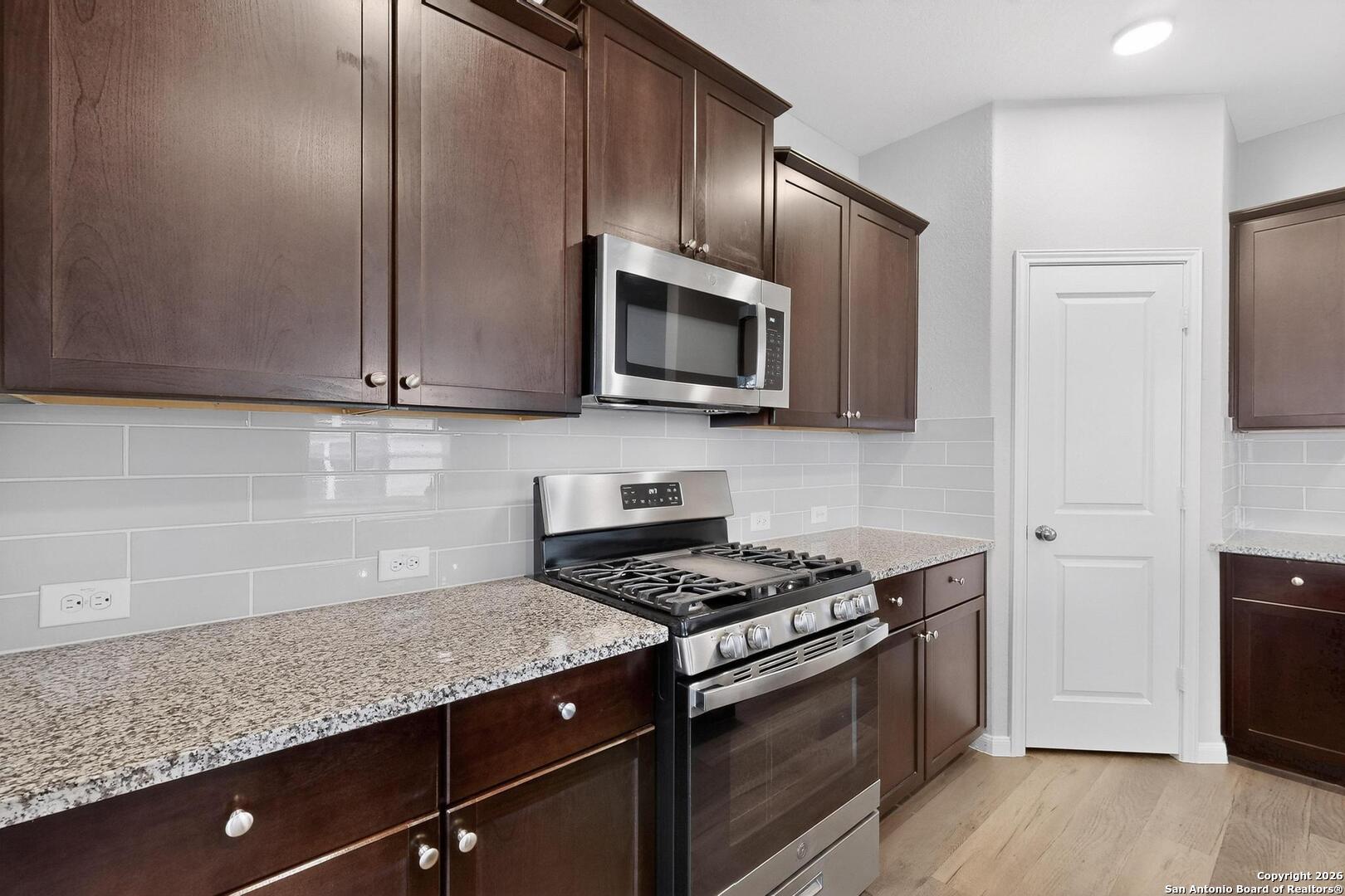 This wonderful move in ready home has layout that features an open concept living space with 4 bedrooms and 3 full baths baths. Guests are greeted by a lovely foyer that opens up to the main living area. The gorgeous kitchen features granite countertops, gas cooking, stainless steel appliances and a large island that overlooks the family room. The master suite is nestled in the corner of the home for optimum privacy and boasts a spacious master bath and massive walk-in closet. One bedroom has its own private full bath. Recently updated flooring, interior paint, new light and plumbing fixtures. This home is surrounded by mature trees, landscaping in the front and the back that has a sprinkler system and a great entertaining deck in the backyard. Exterior also features a large partially covered patio, and a two-car garage complete this beautiful home