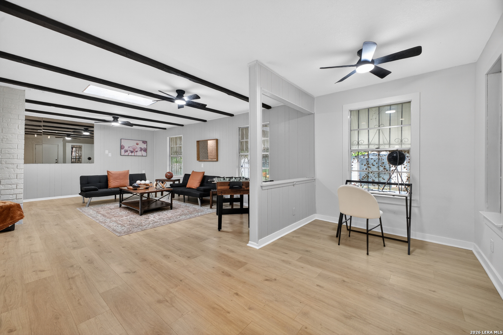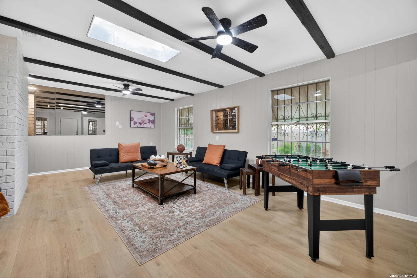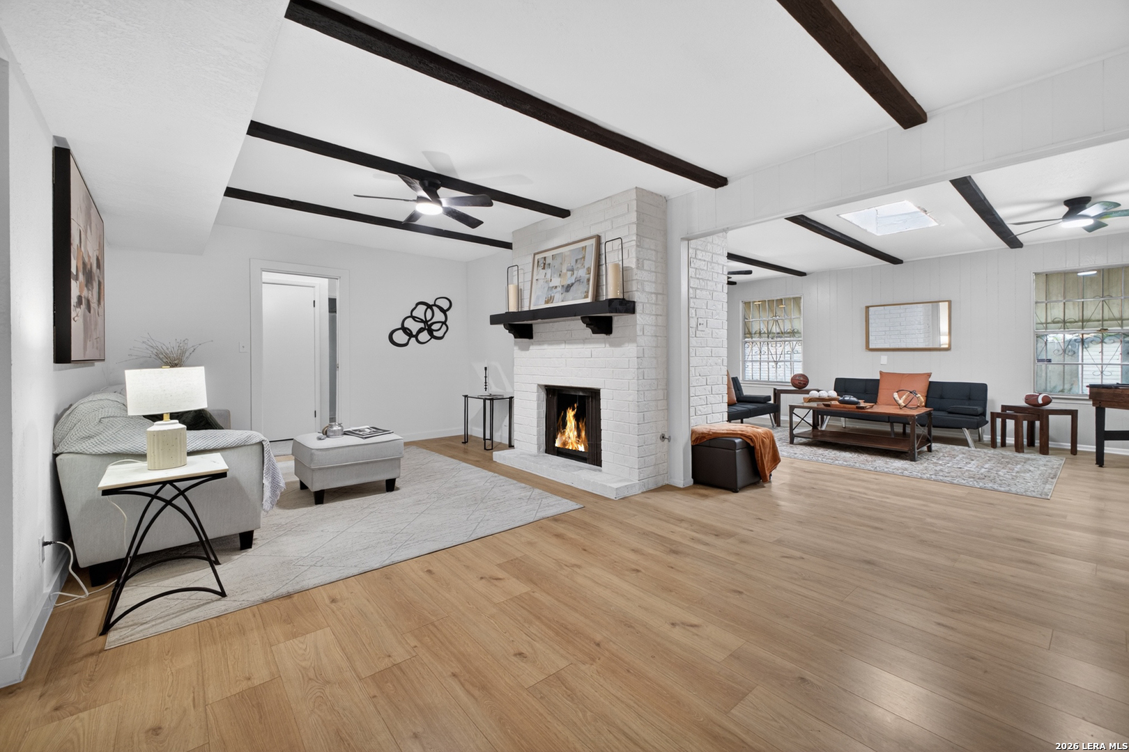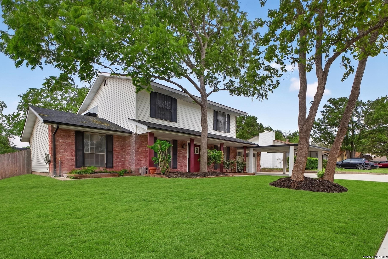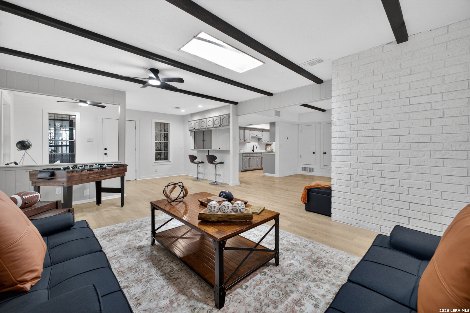 Spacious two-story home featuring multiple living areas, distinctive architectural details, and a large backyard with mature trees. The main living room showcases exposed wood beams, a fireplace, and updated flooring, creating a warm and inviting space. A second oversized living area with a built-in wet bar offers plenty of room for entertaining, game nights, or a media setup. The kitchen features quartz countertops, shaker-style cabinetry, stainless steel appliances, and generous counter space with a breakfast bar overlooking the living areas. A separate dining room with chandelier provides a great space for everyday meals or hosting guests. The home offers spacious bedrooms and bathrooms with updated vanities and fixtures, plus flexible living space for a home office, playroom, or additional lounge area. Enjoy the screened-in patio overlooking a large backyard with mature trees, a covered patio area, and a storage shed/workshop. Conveniently located with easy access to I-35, Loop 1604, and Loop 410, and just minutes from Randolph Air Force Base, The Forum shopping center, IKEA, Rolling Oaks Mall, parks, dining, and everyday conveniences.