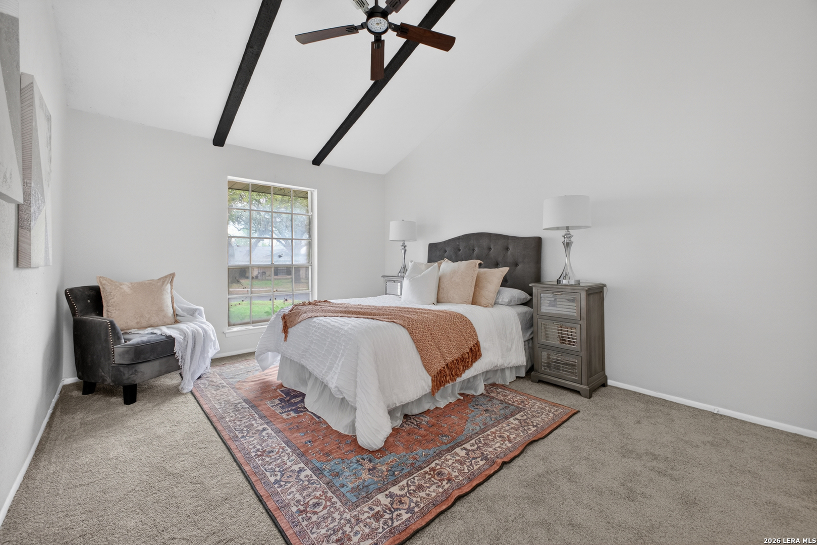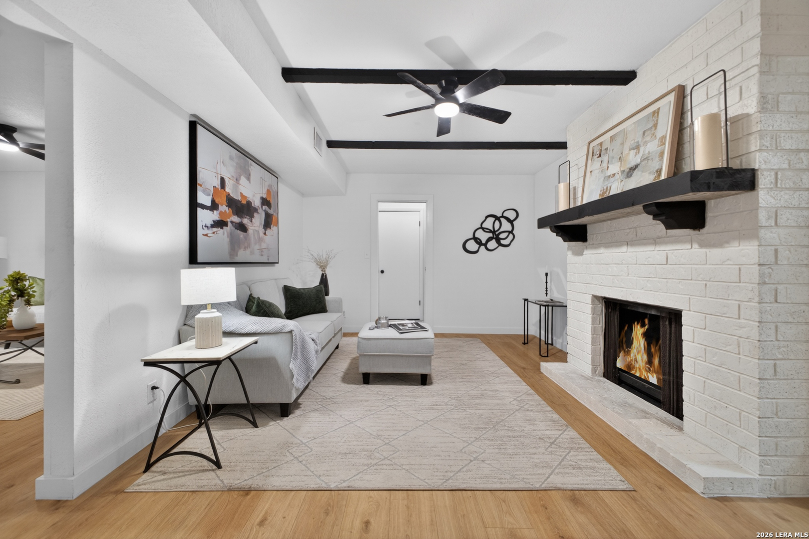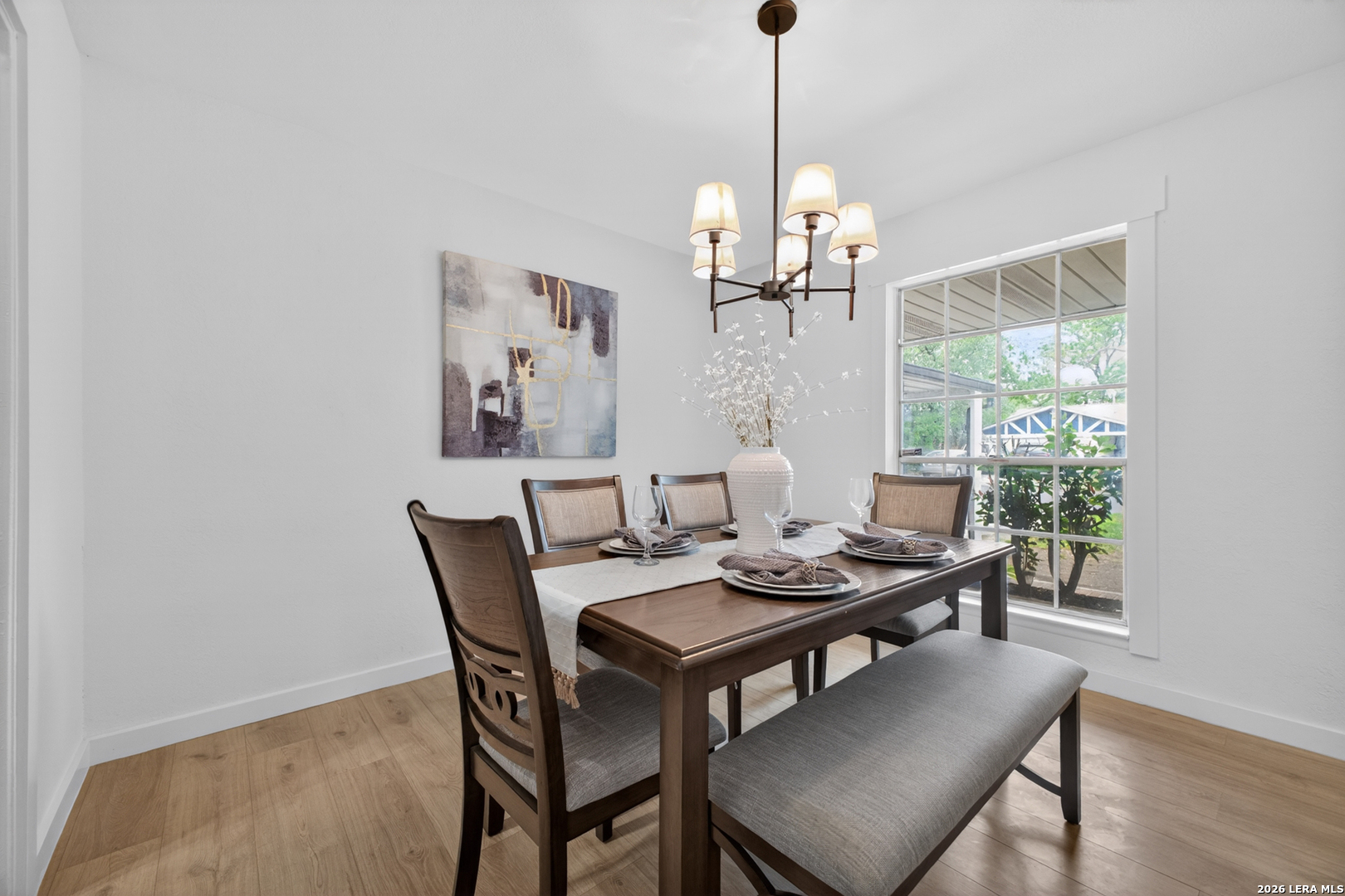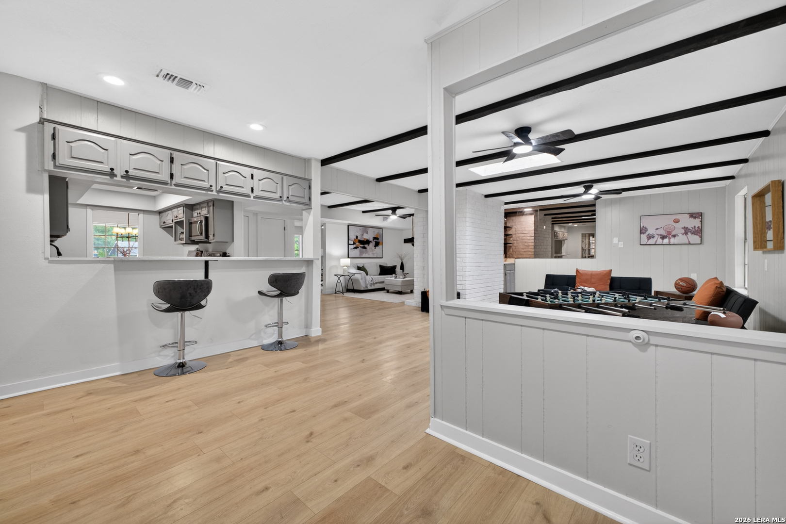 Spacious two-story home featuring multiple living areas, distinctive architectural details, and a large backyard with mature trees. The main living room showcases exposed wood beams, a fireplace, and updated flooring, creating a warm and inviting space. A second oversized living area with a built-in wet bar offers plenty of room for entertaining, game nights, or a media setup. The kitchen features quartz countertops, shaker-style cabinetry, stainless steel appliances, and generous counter space with a breakfast bar overlooking the living areas. A separate dining room with chandelier provides a great space for everyday meals or hosting guests. The home offers spacious bedrooms and bathrooms with updated vanities and fixtures, plus flexible living space for a home office, playroom, or additional lounge area. Enjoy the screened-in patio overlooking a large backyard with mature trees, a covered patio area, and a storage shed/workshop. Conveniently located with easy access to I-35, Loop 1604, and Loop 410, and just minutes from Randolph Air Force Base, The Forum shopping center, IKEA, Rolling Oaks Mall, parks, dining, and everyday conveniences.