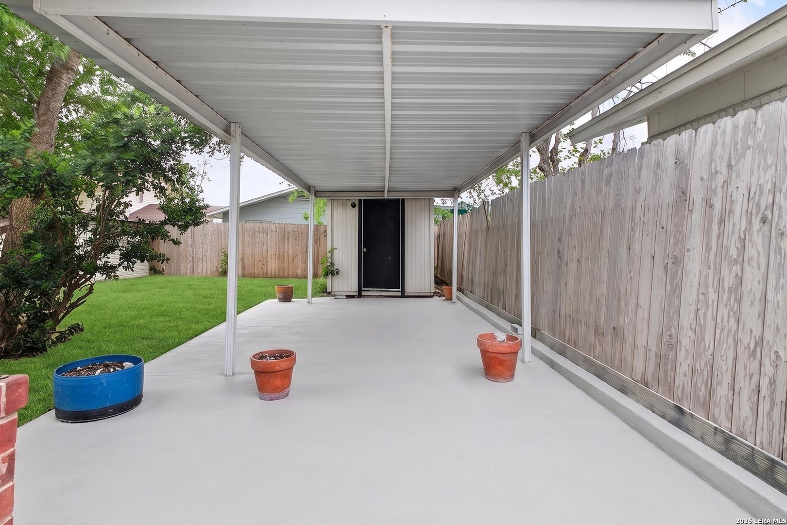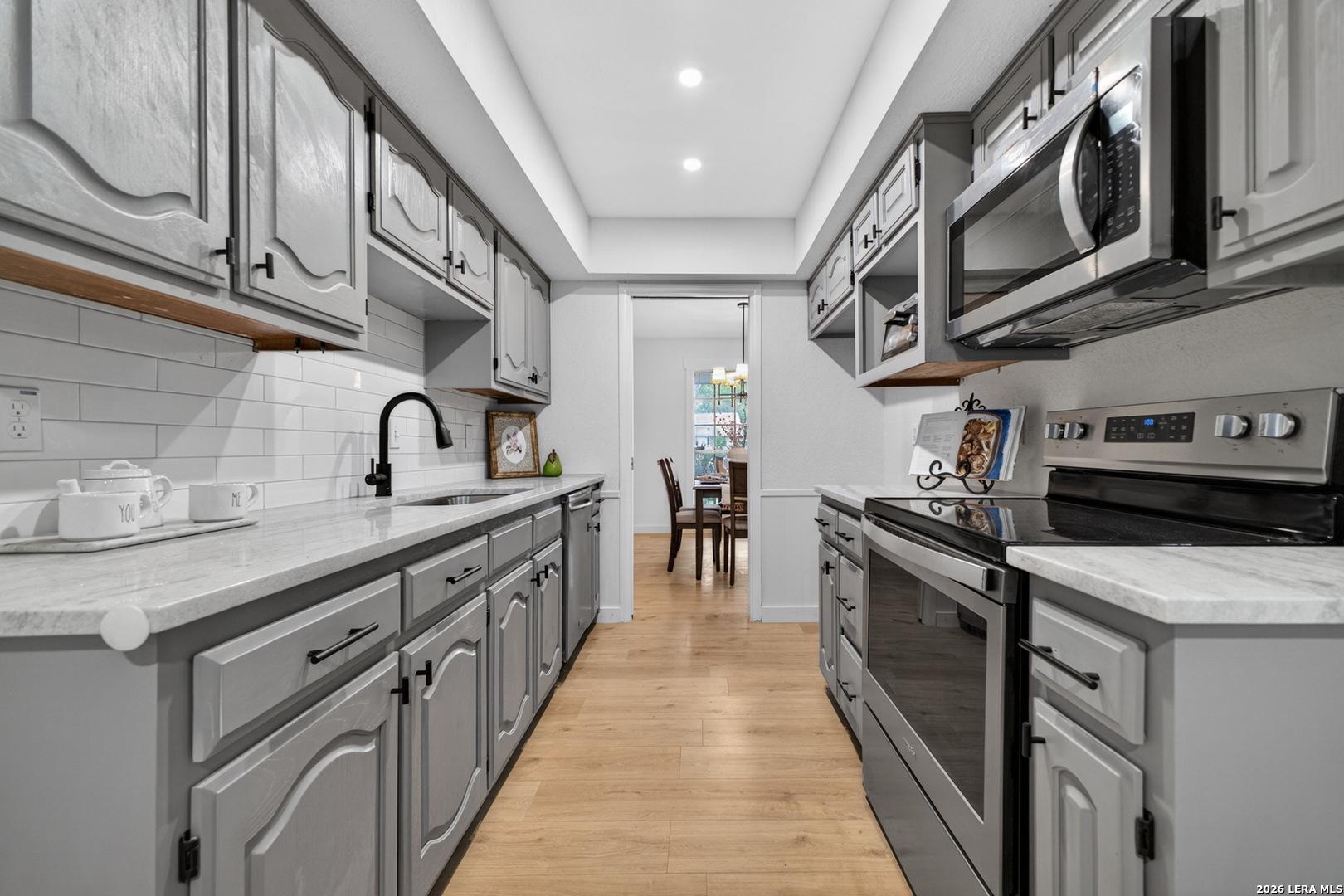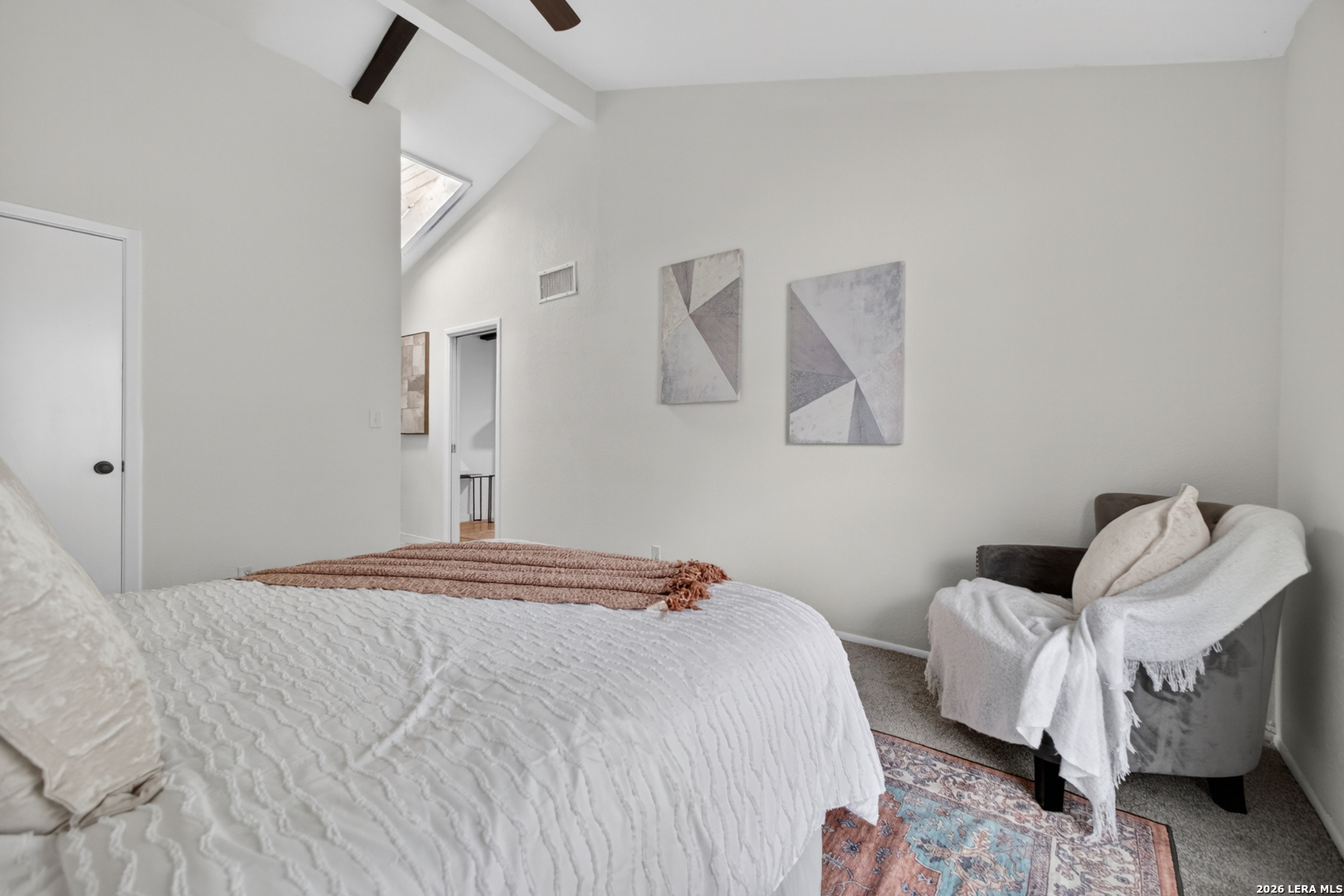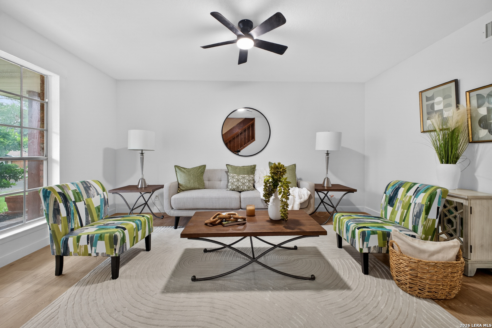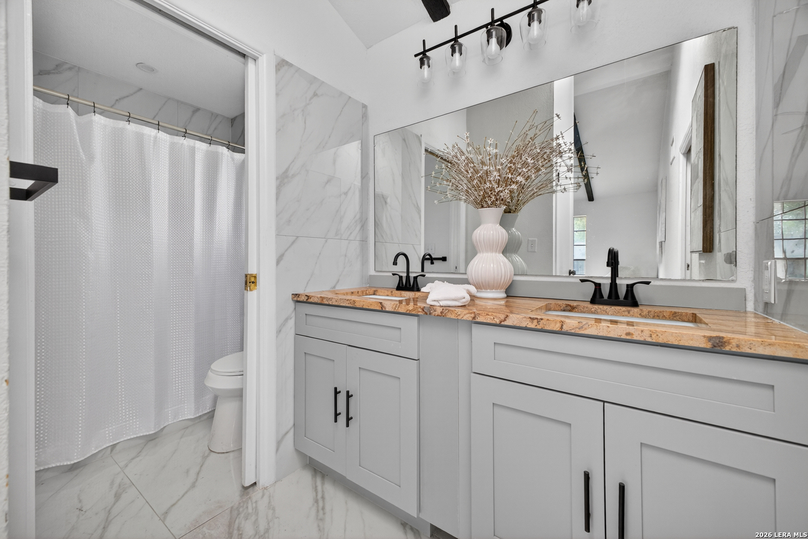 Spacious two-story home featuring multiple living areas, distinctive architectural details, and a large backyard with mature trees. The main living room showcases exposed wood beams, a fireplace, and updated flooring, creating a warm and inviting space. A second oversized living area with a built-in wet bar offers plenty of room for entertaining, game nights, or a media setup. The kitchen features quartz countertops, shaker-style cabinetry, stainless steel appliances, and generous counter space with a breakfast bar overlooking the living areas. A separate dining room with chandelier provides a great space for everyday meals or hosting guests. The home offers spacious bedrooms and bathrooms with updated vanities and fixtures, plus flexible living space for a home office, playroom, or additional lounge area. Enjoy the screened-in patio overlooking a large backyard with mature trees, a covered patio area, and a storage shed/workshop. Conveniently located with easy access to I-35, Loop 1604, and Loop 410, and just minutes from Randolph Air Force Base, The Forum shopping center, IKEA, Rolling Oaks Mall, parks, dining, and everyday conveniences.