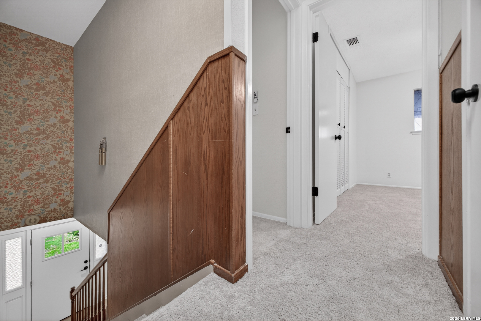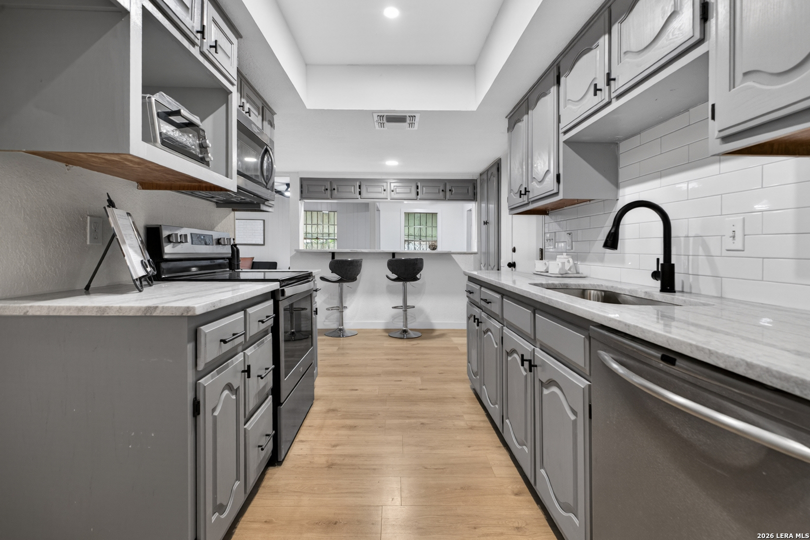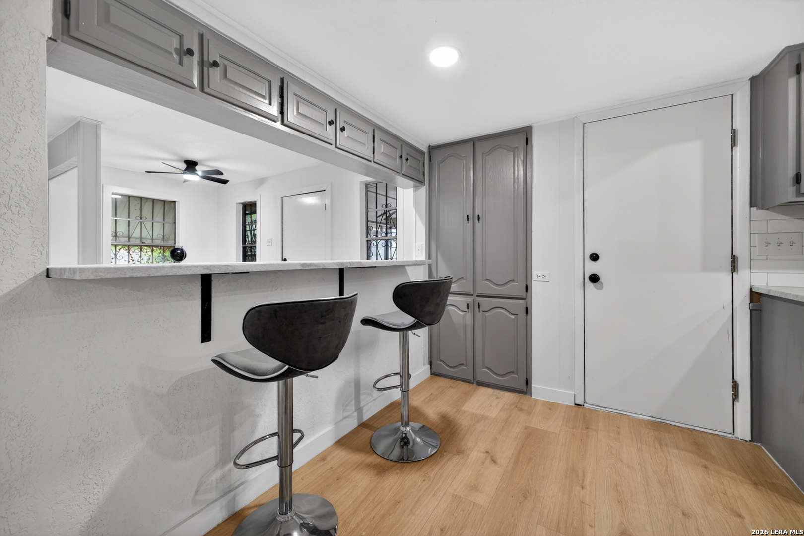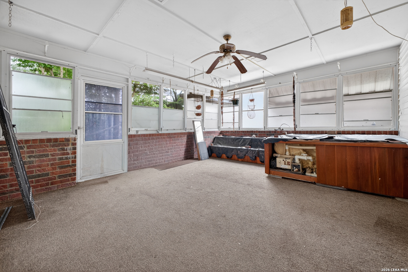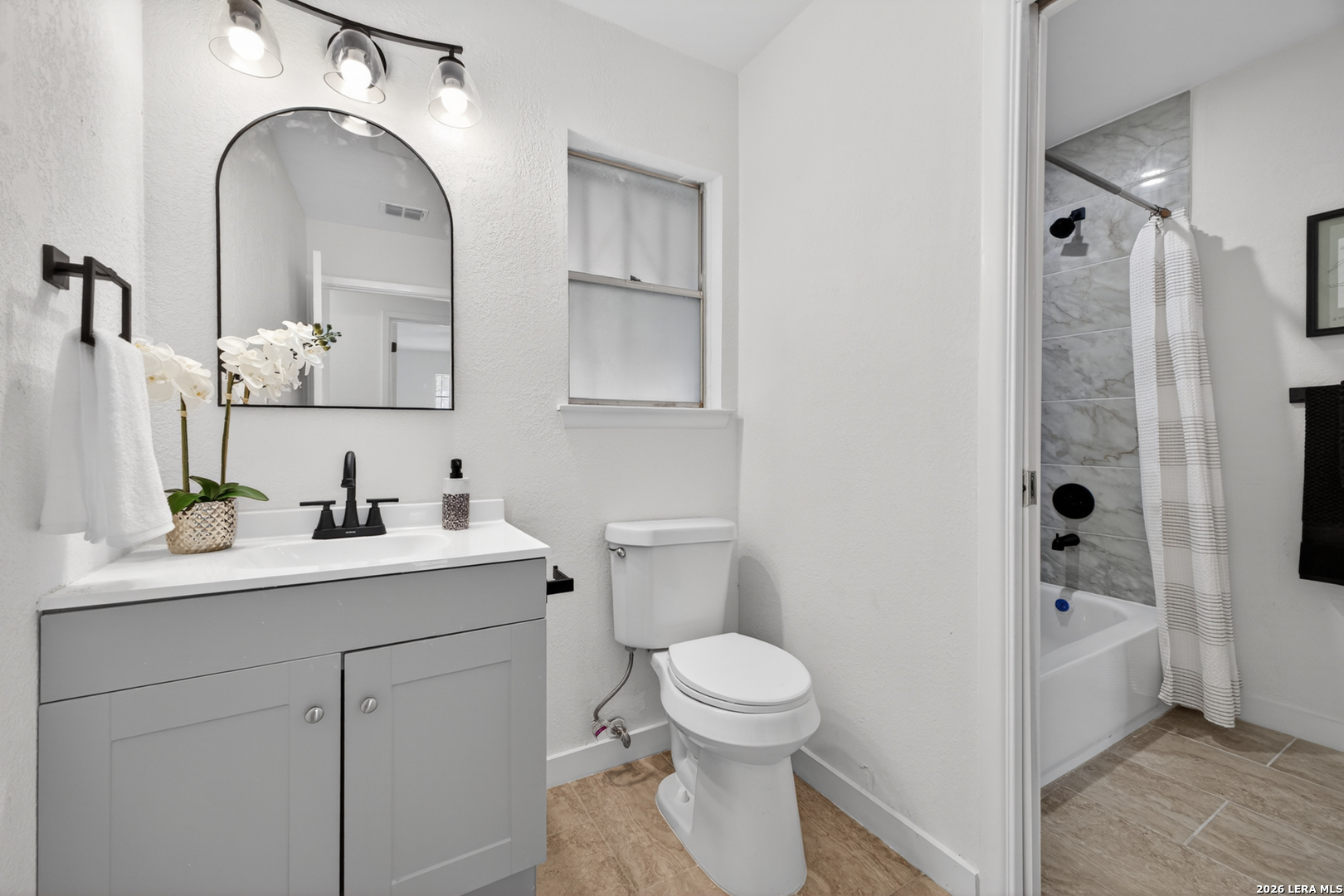Spacious two-story home featuring multiple living areas, distinctive architectural details, and a large backyard with mature trees. The main living room showcases exposed wood beams, a fireplace, and updated flooring, creating a warm and inviting space. A second oversized living area with a built-in wet bar offers plenty of room for entertaining, game nights, or a media setup. The kitchen features quartz countertops, shaker-style cabinetry, stainless steel appliances, and generous counter space with a breakfast bar overlooking the living areas. A separate dining room with chandelier provides a great space for everyday meals or hosting guests. The home offers spacious bedrooms and bathrooms with updated vanities and fixtures, plus flexible living space for a home office, playroom, or additional lounge area. Enjoy the screened-in patio overlooking a large backyard with mature trees, a covered patio area, and a storage shed/workshop. Conveniently located with easy access to I-35, Loop 1604, and Loop 410, and just minutes from Randolph Air Force Base, The Forum shopping center, IKEA, Rolling Oaks Mall, parks, dining, and everyday conveniences.