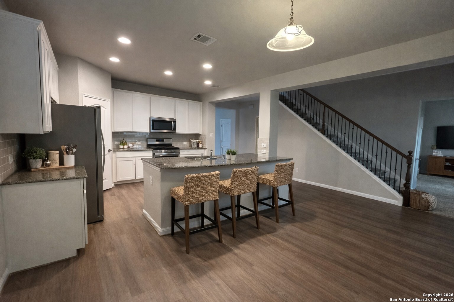 Spacious 5BR/2.5BA energy-efficient home with open-concept kitchen featuring granite countertops, gas range, and stainless-steel appliances. Family room opens to a covered screened-in porch and fenced backyard. Main-level primary suite for added privacy. Convenient to shopping, outdoor recreation, and highly rated schools. 17.6 kW solar system offsets approx. 92% of electric usage.Owner financing available.