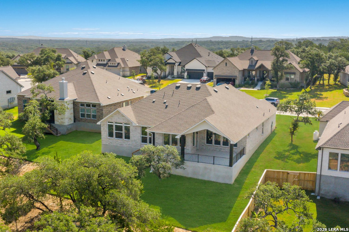 6821 Arbor Falls is set within The Arbors at Fair Oaks Ranch, a gated community surrounded by rolling Hill Country terrain and mature oak trees. This single-story Scott Felder home, known as The Aransas, blends architectural detail with modern functionality across 2,941 square feet. High ceilings, defined ceiling treatments, and large windows enhance the natural light throughout the open-concept layout. The family room centers around a sleek electric fireplace with tile surround and opens to a spacious kitchen featuring dark wood cabinetry, quartz countertops, stainless steel appliances, a tile backsplash, a walk-in pantry, and an oversized island with seating. Adjacent spaces include a dedicated breakfast area, private study with French doors, a versatile interior casita with its own living area, bedroom, and full bath, plus two secondary bedrooms connected by a Jack-and-Jill bath. The primary suite offers a vaulted ceiling with exposed beams and tree-filled views. Its spa-style bathroom includes dual vanities, a soaking tub, a glass-enclosed shower with a bench, and a walk-in closet. Outdoor living extends under a covered patio with ceiling fan, overlooking a fenced yard that borders the Fair Oaks Nature Preserve. Additional highlights include ample built-in storage and a three-car garage. The location offers convenient access to the new H-E-B in Fair Oaks Ranch, Fair Oaks Country Club, Boerne Lake, La Cantera, The Rim, and Downtown Boerne. Builder incentives are available-please inquire for details. Combining thoughtful design, quality craftsmanship, and a peaceful setting, this new construction home delivers refined Hill Country living in one of Fair Oaks Ranch's most desirable gated communities. 3D tour and floor plan available!