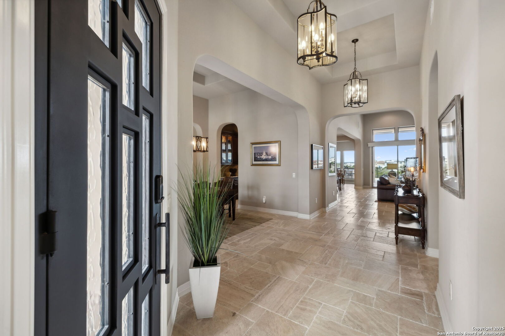 Luxury lifestyle for the buyers wanting lock-and-leave conveniences in a gated community. Beautiful, quality finishes and top-of-the-line lighting, flooring, millwork, hardware & plumbing fixtures. Shutters across the front of the home provide privacy and exquisite curb appeal. Electric shades across the back of the home provide convenience & privacy while preserving the magnificent hill country views. Gorgeous hardwood floors and Turkish Travertine tile throughout the home for a luxury feel, and ease-of-maintenance. Huge primary bedroom with amazing views & extra-large closet. Enjoy the oversized tub with fabulous sunset hill country views (& a motorized shade for privacy). Huge island kitchen with gorgeous granite counters, Thermador gas appliances, double oven and Filtered water in the farm sink. Butler's pantry leads to the formal dining for added storage and convenience. Collapsible patio doors extend the inside living to outdoors. Large, landscaped yard with recently-resurfaced pool & stamped concrete patio to watch the gorgeous sunsets--backs to greenbelt. Oversized backyard with "puppy pickets" in the iron fence is great for dogs.
