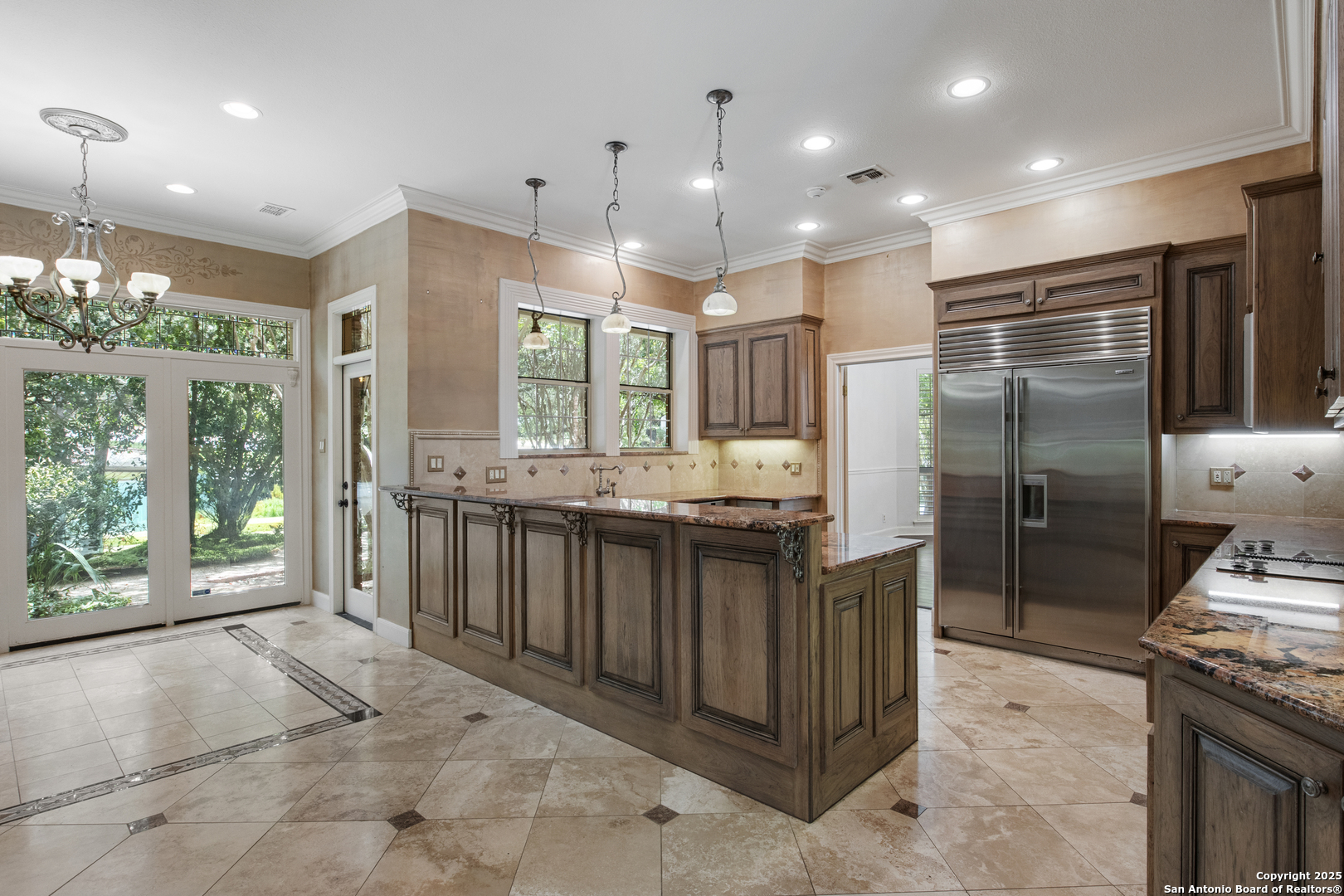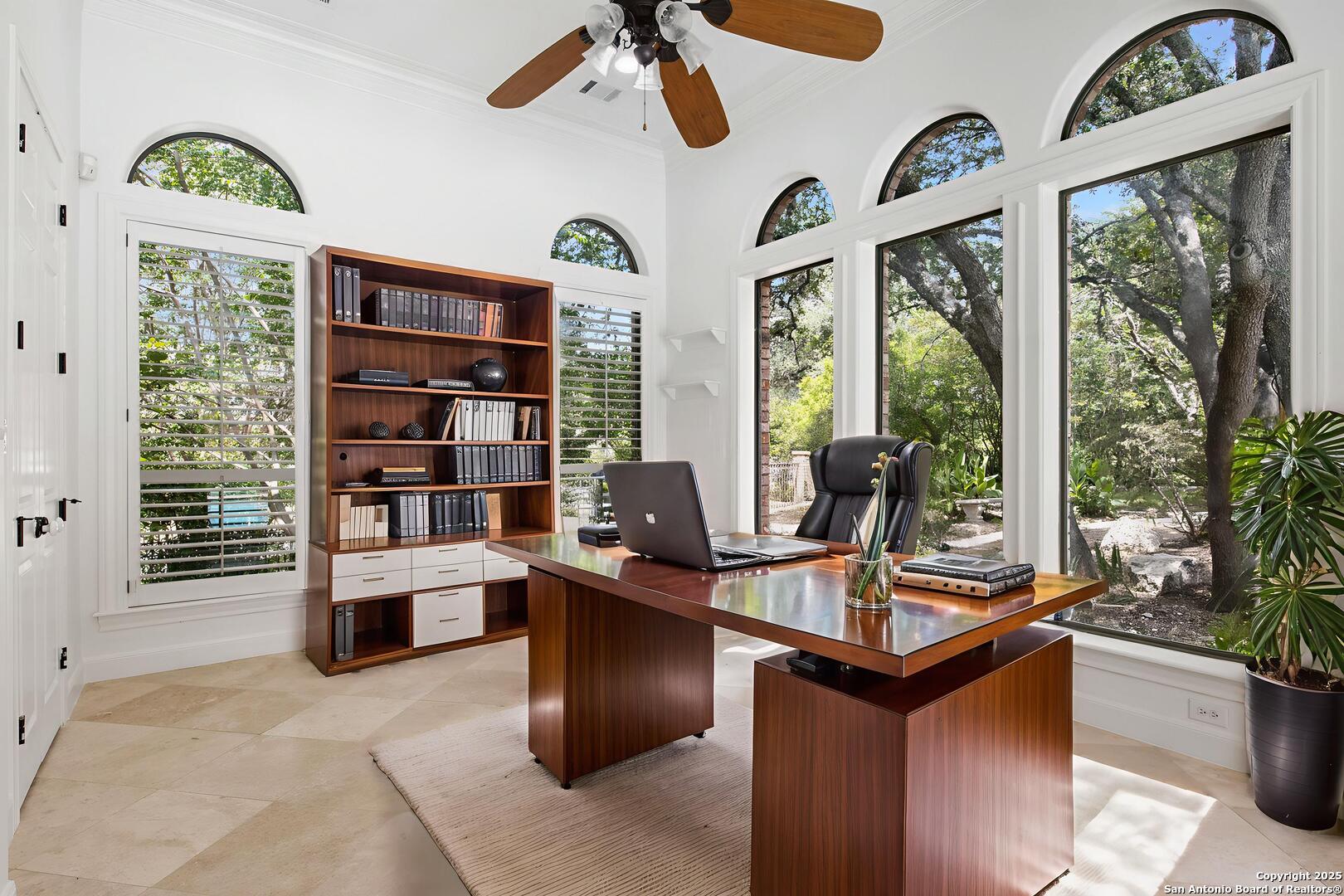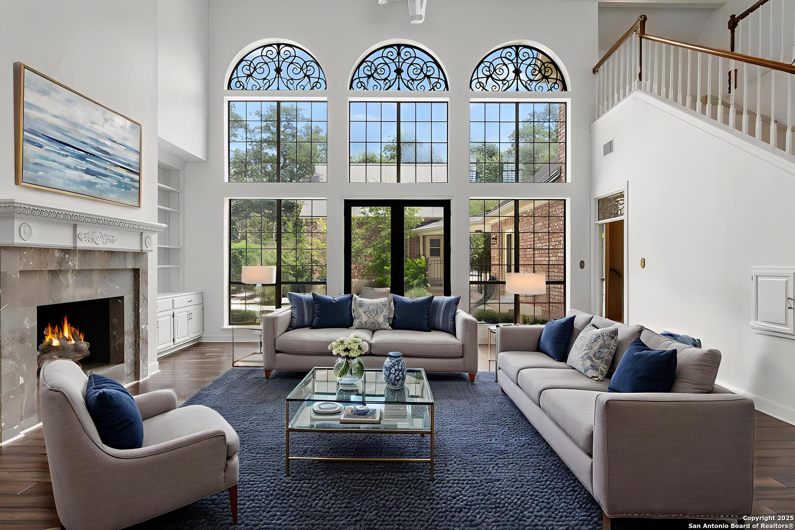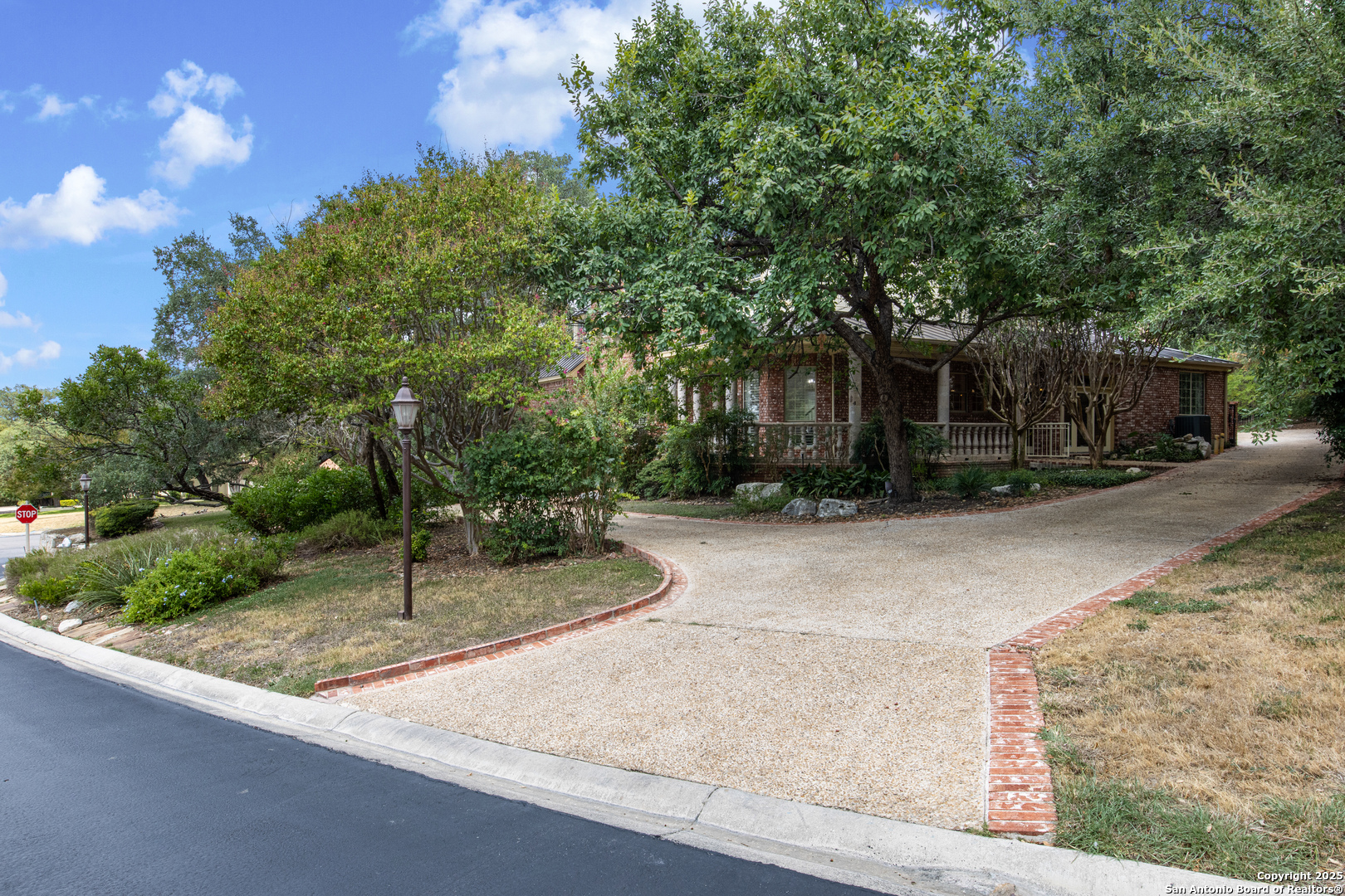 Experience timeless elegance and modern comfort in this stunning estate located in the prestigious Dominion. Nestled on 0.6 acres of beautifully landscaped grounds, this home offers serene walking paths, lush greenery, and a private backyard oasis with a sparkling pool. The stately brick exterior and circular drive welcome you to a residence designed for grand entertaining and everyday luxury. Inside, soaring ceilings and dramatic windows fill the living spaces with natural light, highlighting breathtaking views of the pool and gardens. The gourmet kitchen is a chef's dream with custom cabinetry, granite counters, and professional-grade appliances, seamlessly flowing into the breakfast and family areas. The expansive primary suite offers private outdoor access, a spa-inspired bath, and generous closet space. Multiple living areas, a game room, and a wet bar ensure ample room for relaxation and gatherings. Outdoors, mature landscaping, shaded sitting areas, and tranquil pathways create the perfect setting for entertaining or quiet retreat. With its blend of refined architecture, resort-style amenities, and an exclusive Dominion address, this extraordinary property is a rare opportunity to own one of San Antonio's finest homes.