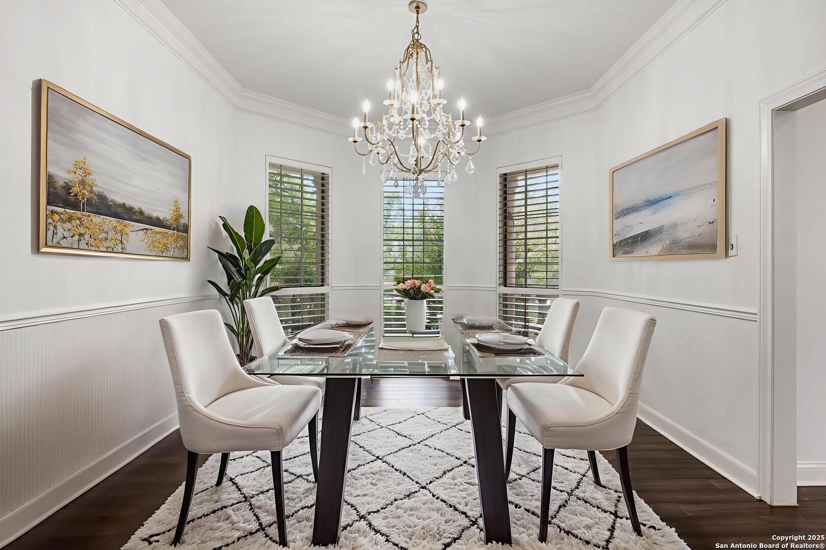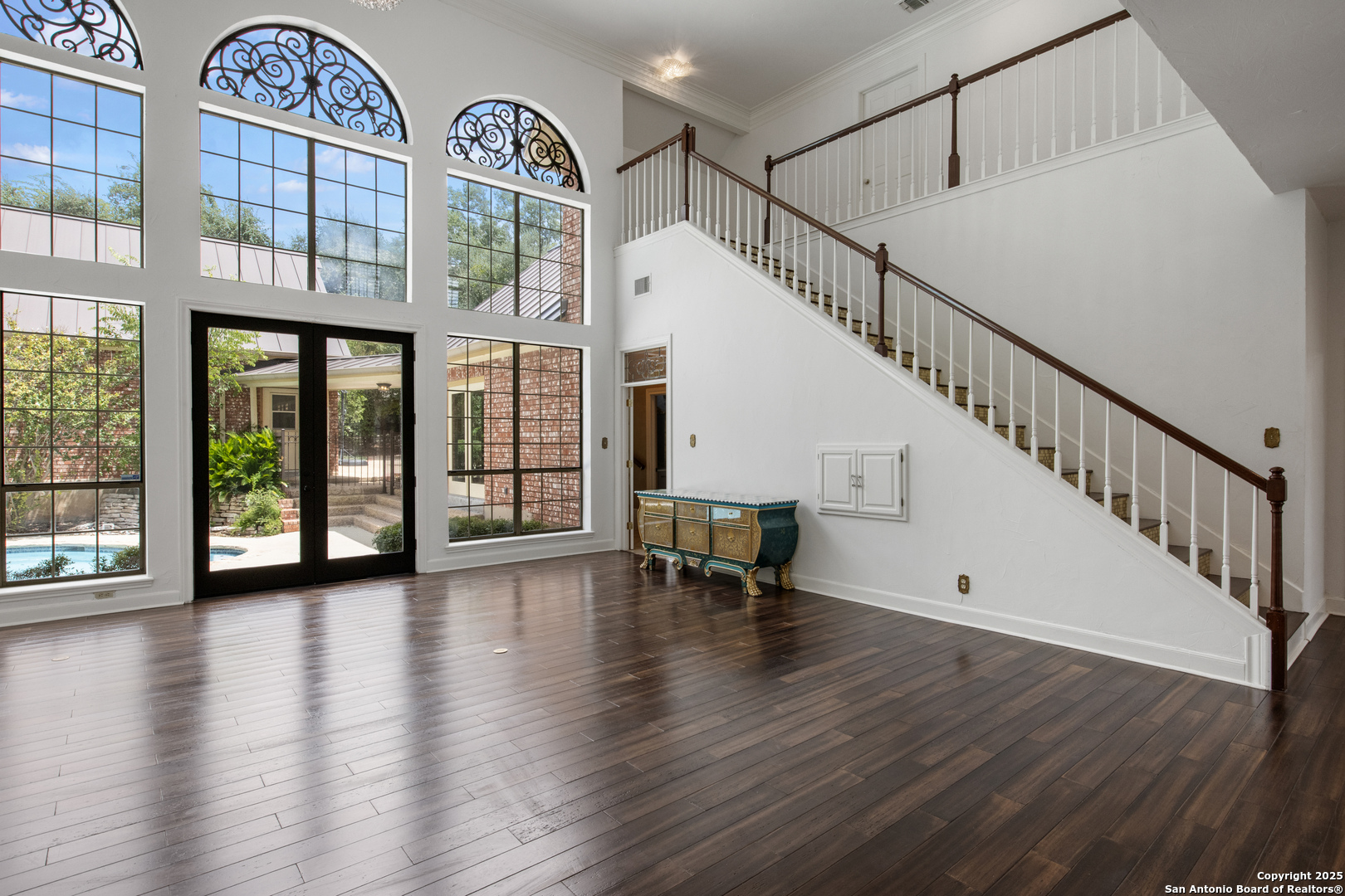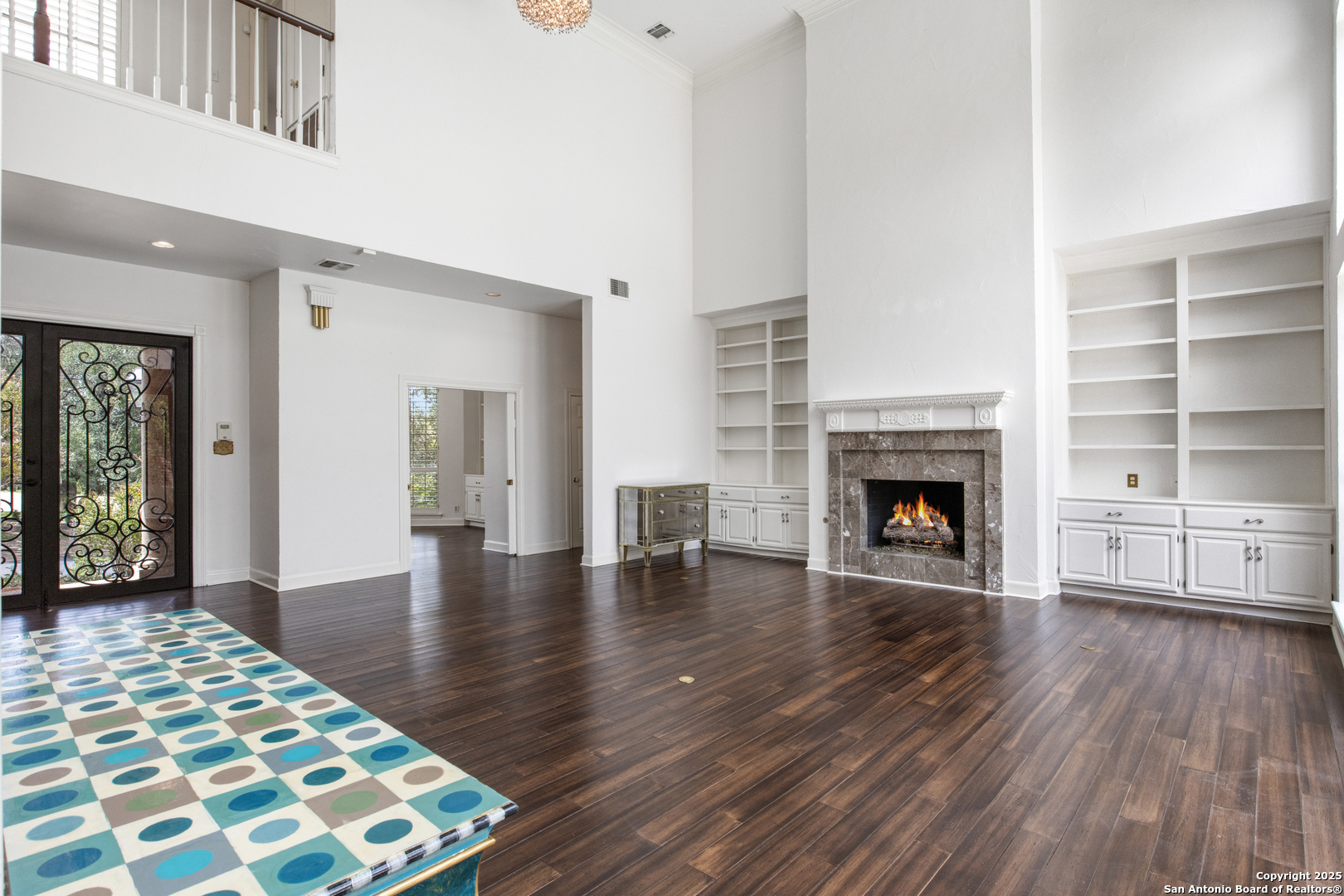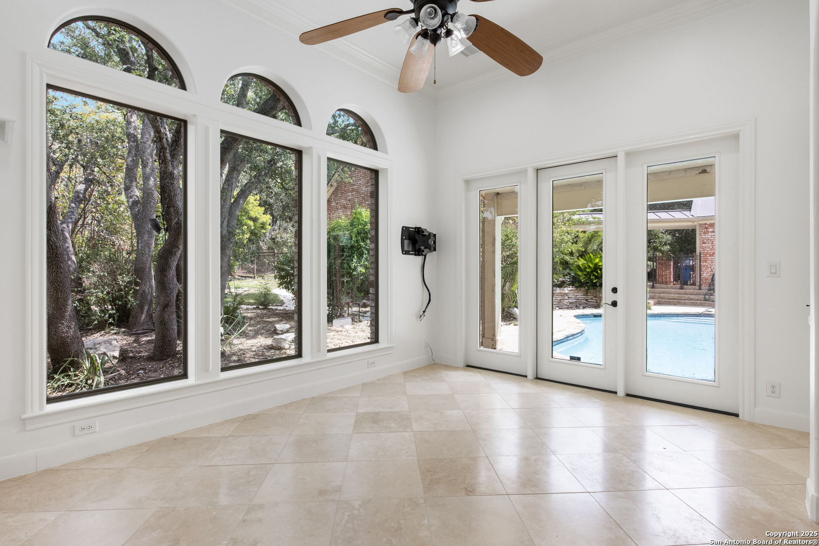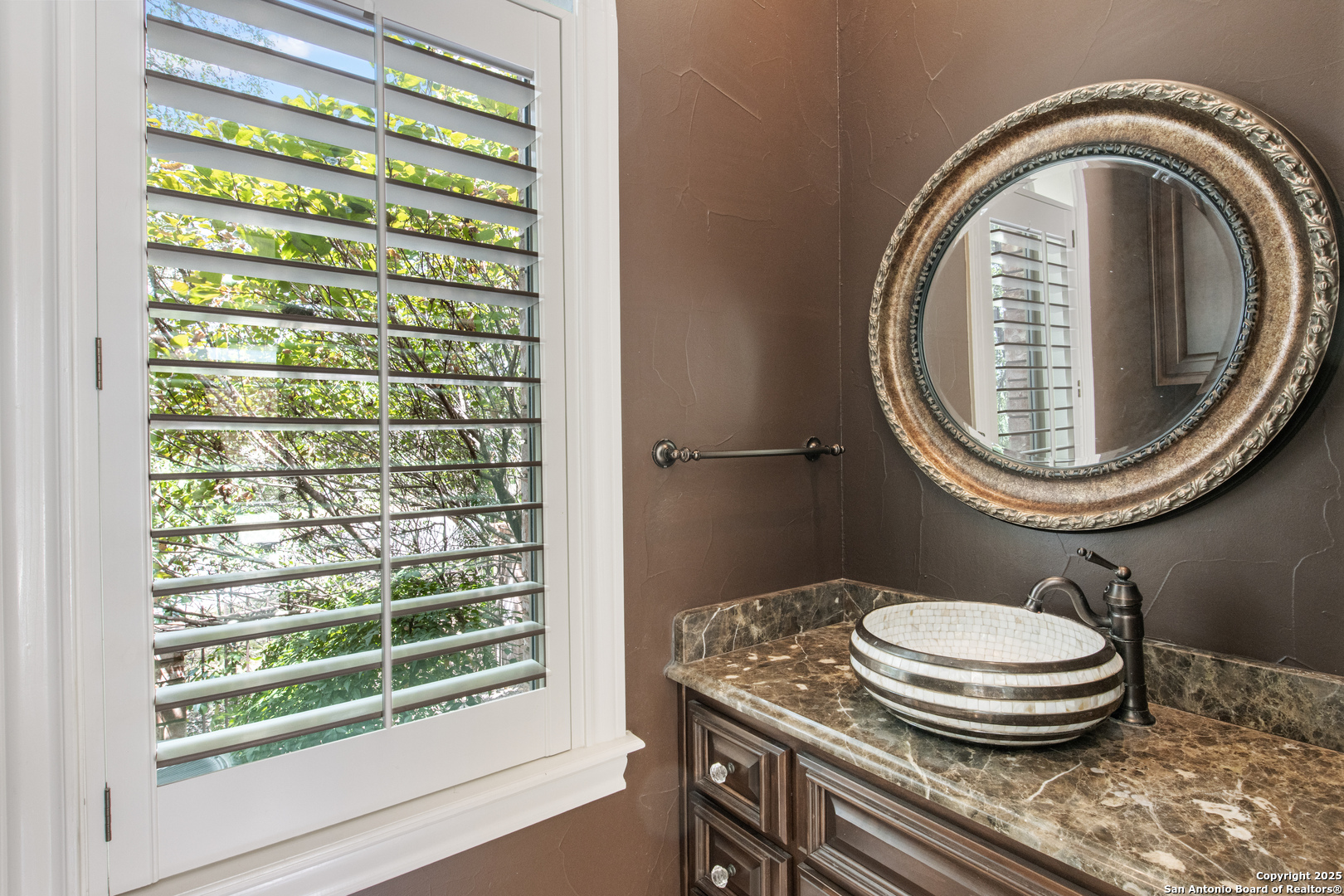 Experience timeless elegance and modern comfort in this stunning estate located in the prestigious Dominion. Nestled on 0.6 acres of beautifully landscaped grounds, this home offers serene walking paths, lush greenery, and a private backyard oasis with a sparkling pool. The stately brick exterior and circular drive welcome you to a residence designed for grand entertaining and everyday luxury. Inside, soaring ceilings and dramatic windows fill the living spaces with natural light, highlighting breathtaking views of the pool and gardens. The gourmet kitchen is a chef's dream with custom cabinetry, granite counters, and professional-grade appliances, seamlessly flowing into the breakfast and family areas. The expansive primary suite offers private outdoor access, a spa-inspired bath, and generous closet space. Multiple living areas, a game room, and a wet bar ensure ample room for relaxation and gatherings. Outdoors, mature landscaping, shaded sitting areas, and tranquil pathways create the perfect setting for entertaining or quiet retreat. With its blend of refined architecture, resort-style amenities, and an exclusive Dominion address, this extraordinary property is a rare opportunity to own one of San Antonio's finest homes.