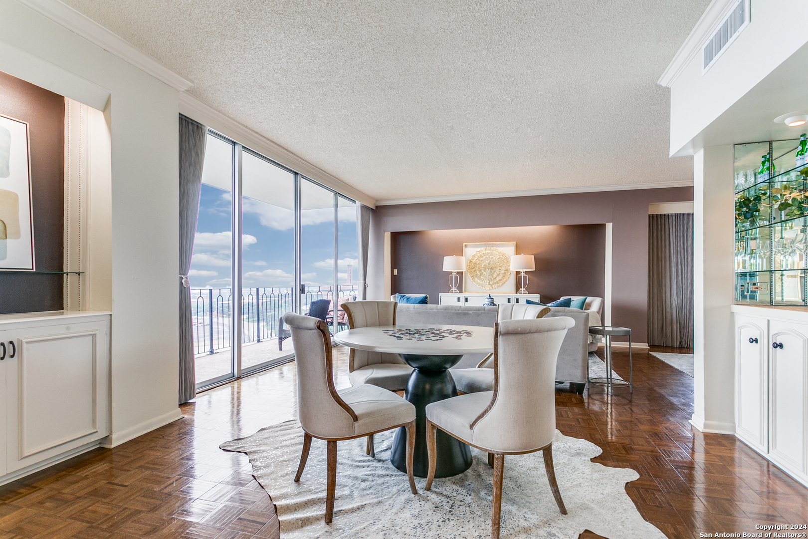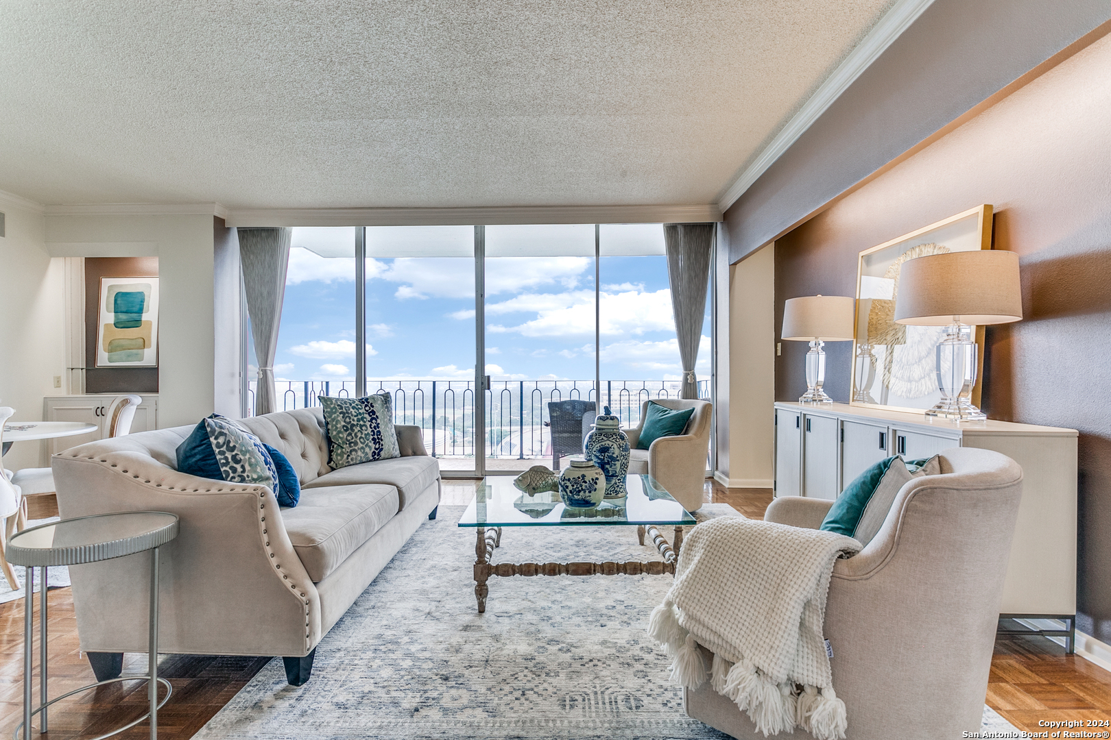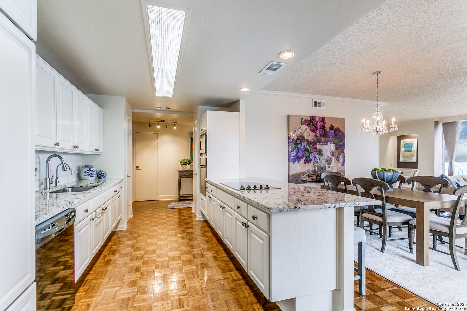 Enjoy one of the most beautiful downtown views in San Antonio from this updated condo, featuring a light and bright interior with private balconies accessible from every room. The entry leads to an expansive, combined living and dining area that offers a flexible layout. The open kitchen boasts abundant storage, recent appliances, a breakfast bar, and an adjacent casual dining space. The primary suite includes a walk-in closet and an updated bathroom. The second bedroom currently serves as a functional den, and the condo features a second full bathroom for added versatility. Live in luxury with premium amenities including a 24/7 doorman, updated lobby, pool with cabana, and a private gym, and a dedicated garage parking space. Plus, never fret about hosting out-of-town visitors; the complex offers two private guest rooms available for reservation, ensuring your family and friends stay in comfort and style right on-site.