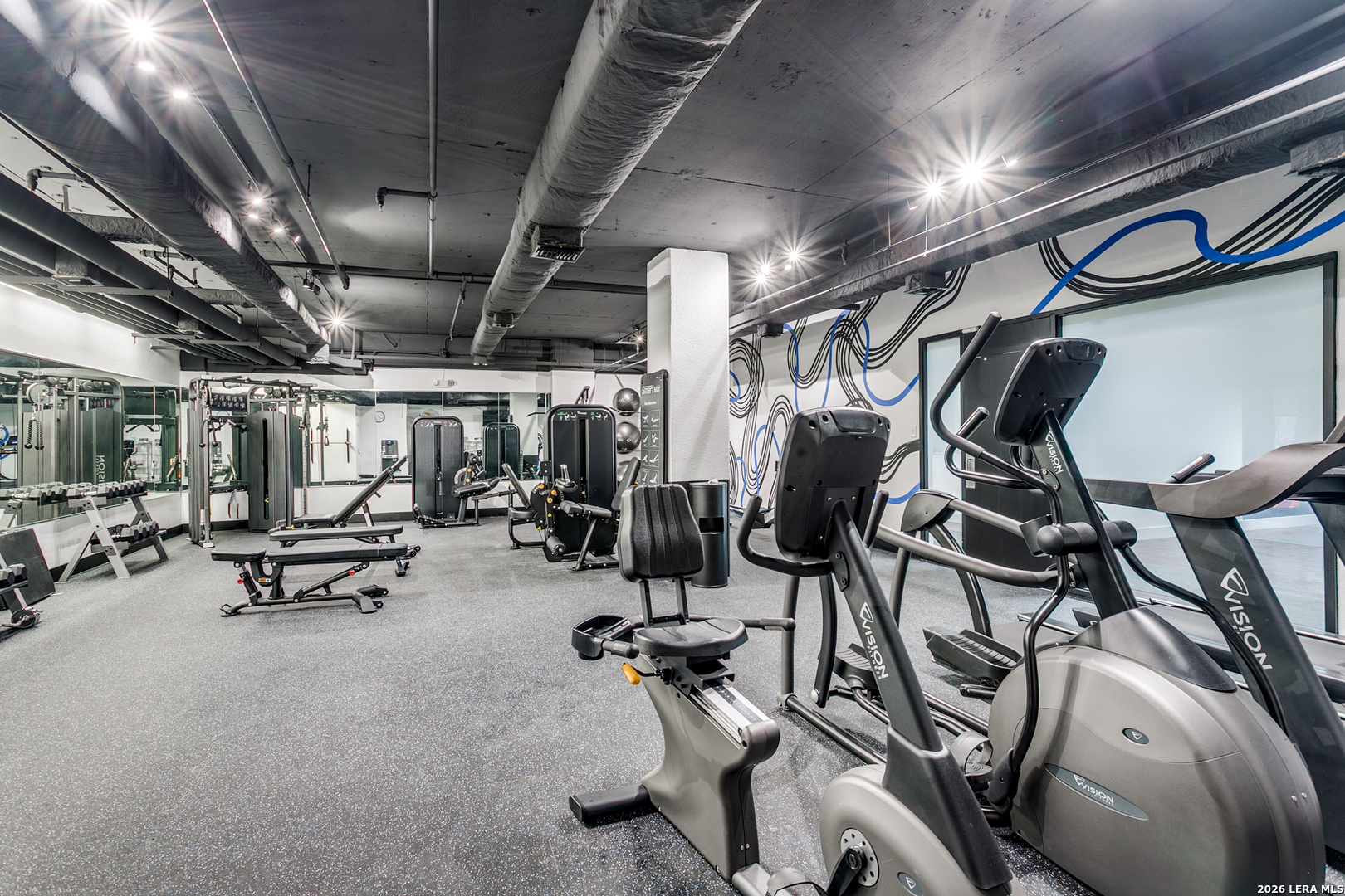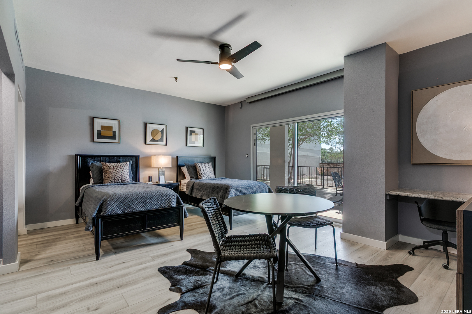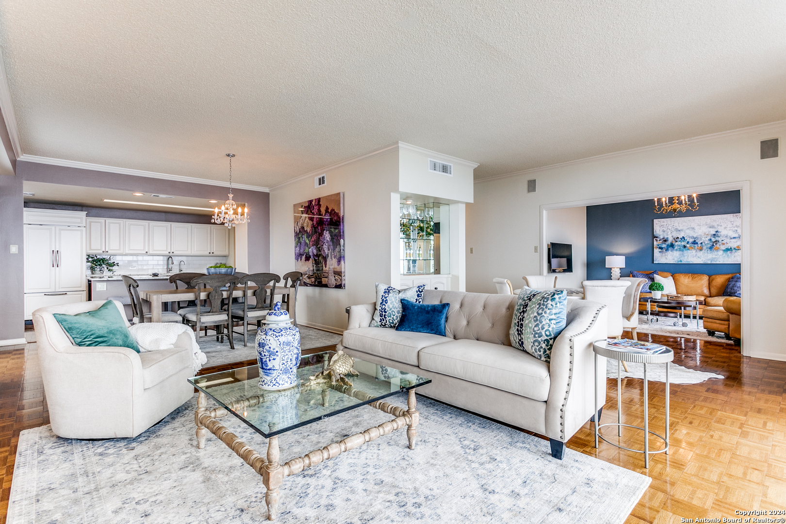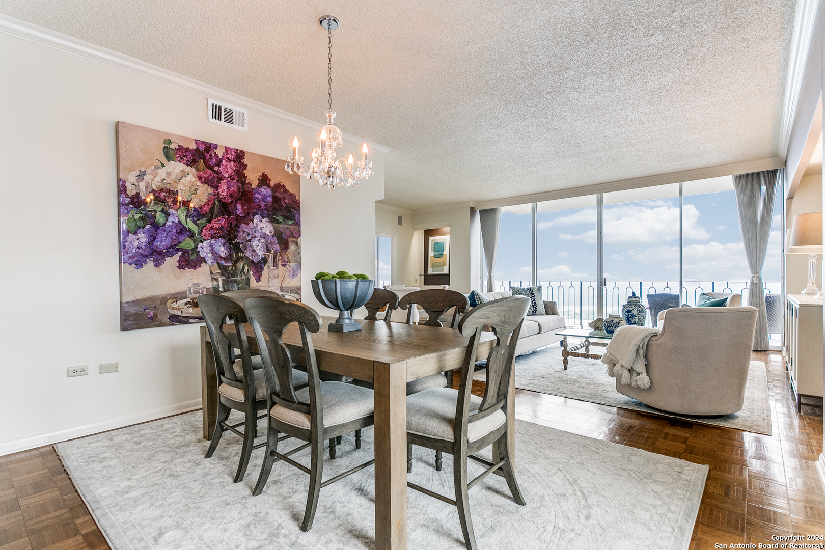 Enjoy one of the most beautiful downtown views in San Antonio from this updated condo, featuring a light and bright interior with private balconies accessible from every room. The entry leads to an expansive, combined living and dining area that offers a flexible layout. The open kitchen boasts abundant storage, recent appliances, a breakfast bar, and an adjacent casual dining space. The primary suite includes a walk-in closet and an updated bathroom. The second bedroom currently serves as a functional den, and the condo features a second full bathroom for added versatility. Live in luxury with premium amenities including a 24/7 doorman, updated lobby, pool with cabana, and a private gym, and a dedicated garage parking space. Plus, never fret about hosting out-of-town visitors; the complex offers two private guest rooms available for reservation, ensuring your family and friends stay in comfort and style right on-site.