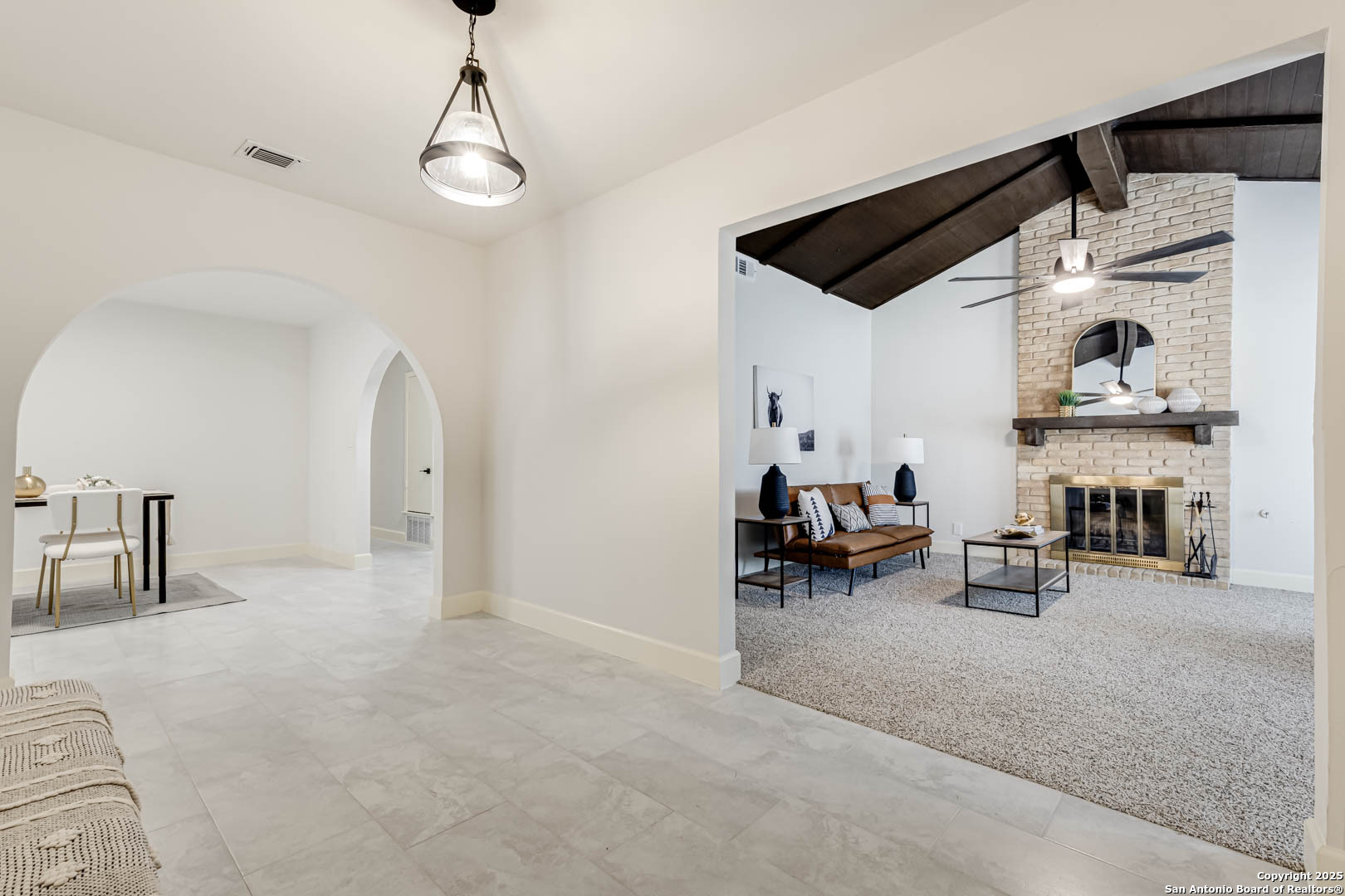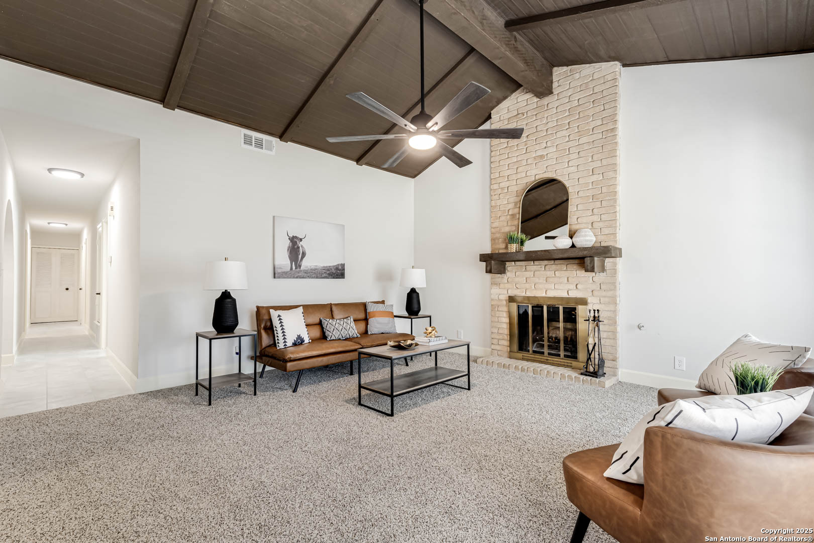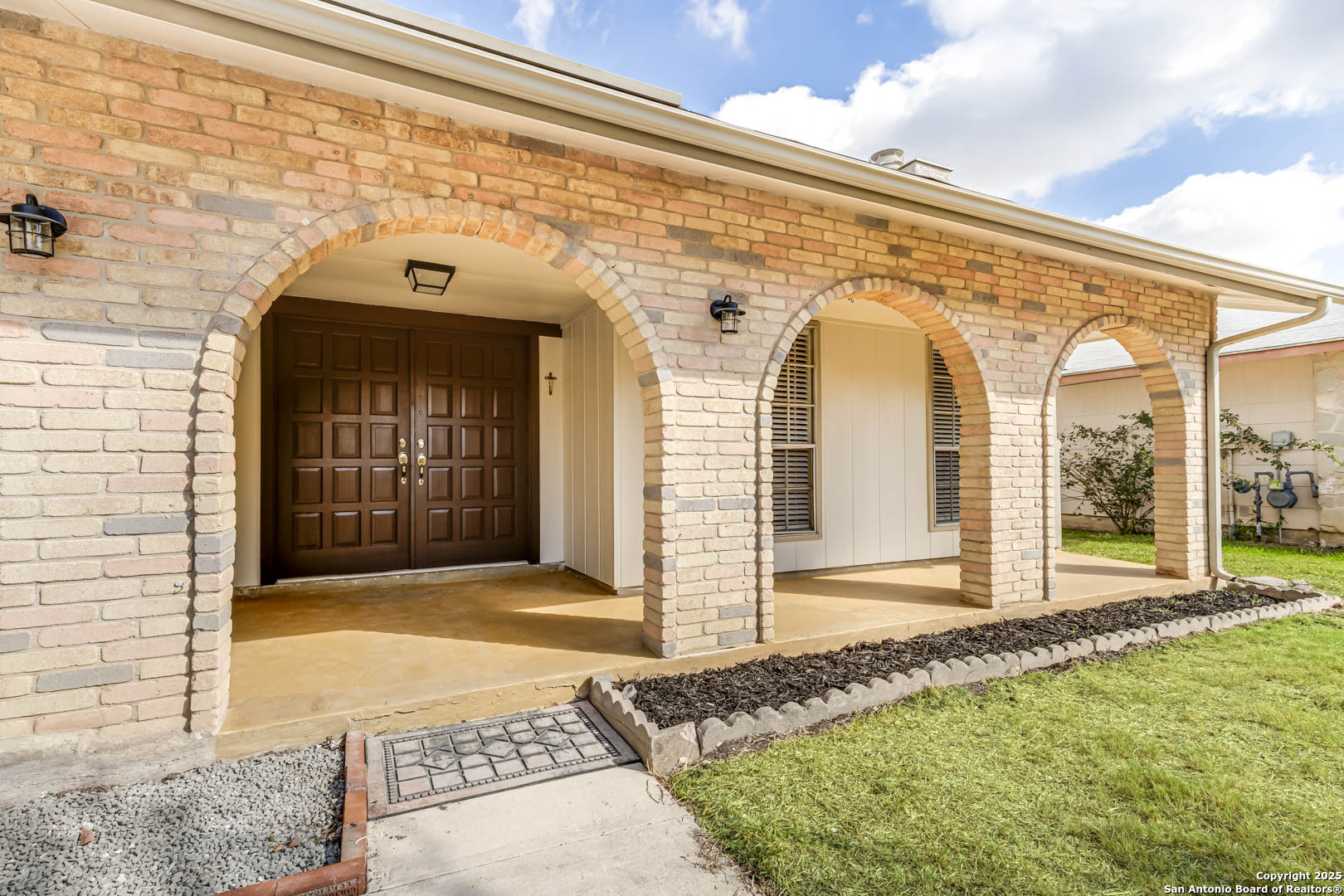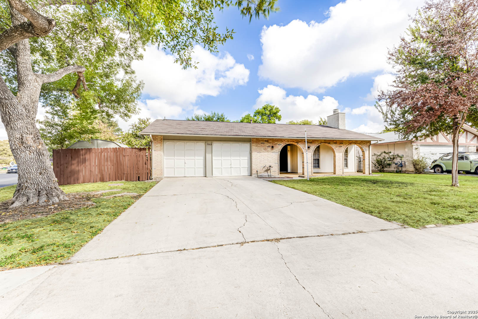 Beautifully renovated ranch-style home on a spacious corner lot in the established Glen Village community! This move-in-ready 4BR, 2BA property features a charming arched front porch and timeless curb appeal. Inside, you'll find a bright, open floor plan with vaulted ceilings, exposed beams, and a cozy brick fireplace anchoring the living area. The fully updated kitchen offers granite countertops, new cabinetry, stainless steel appliances, and a breakfast bar perfect for casual dining. Both bathrooms showcase designer tile, matte black finishes, and a double-sink vanity. The private primary suite includes a stylish walk-in shower and generous storage. A two-car garage with built-in shelving adds functionality, while the large 0.18-acre corner lot with mature trees provides plenty of space for entertaining or relaxing evenings outdoors. Conveniently located near Randolph AFB, The Forum, IH-35, Loop 410, and top NEISD schools. This home perfectly blends comfort, style, and location.