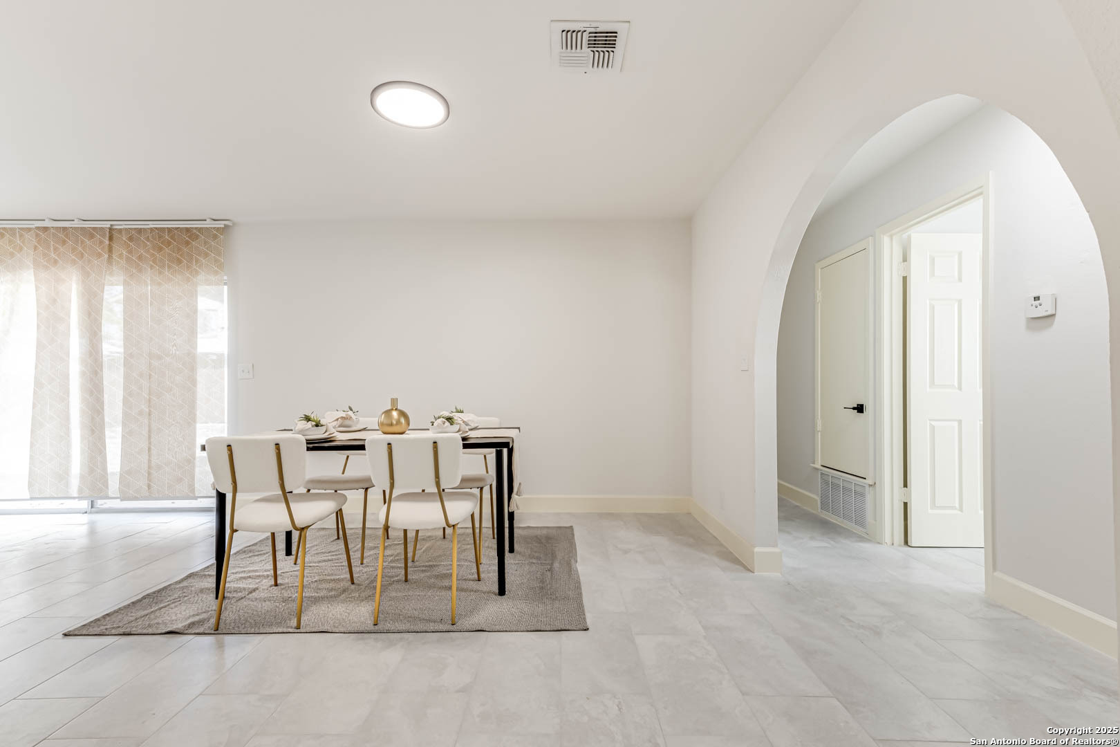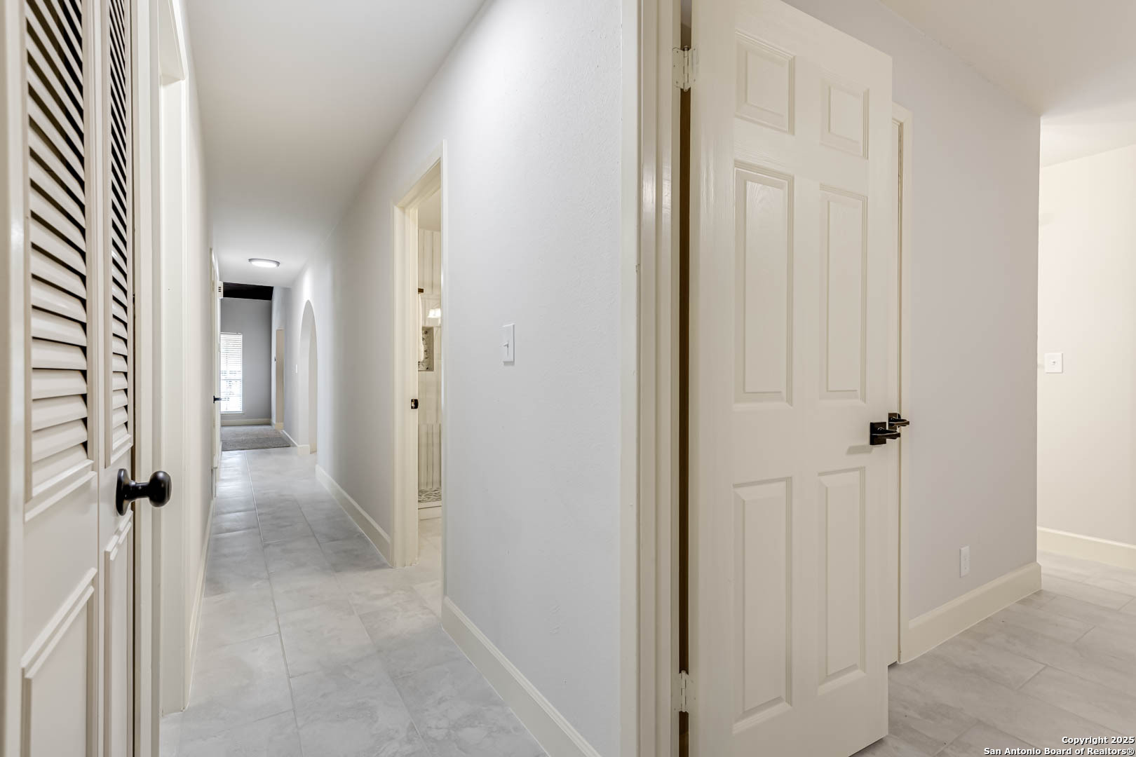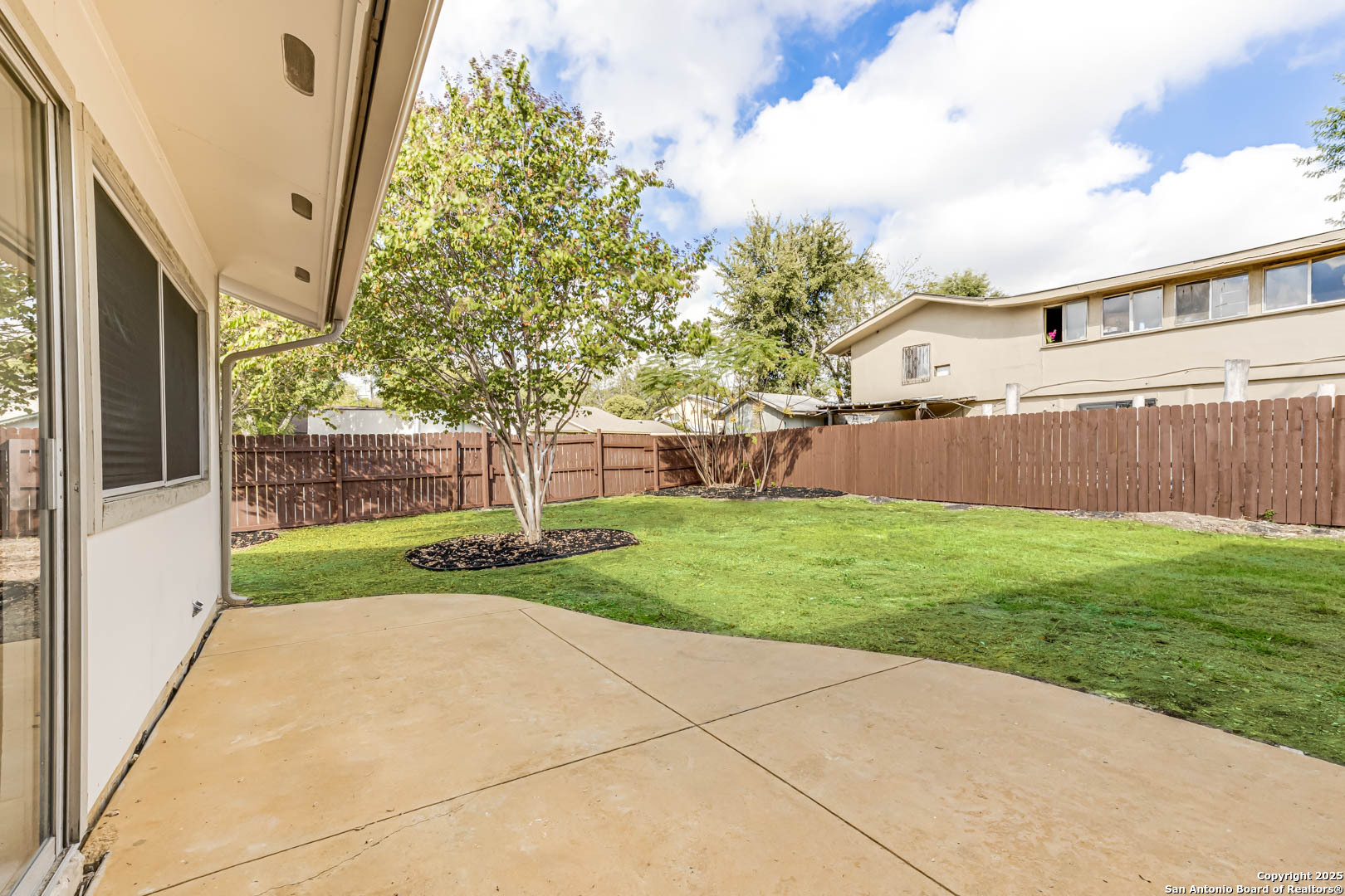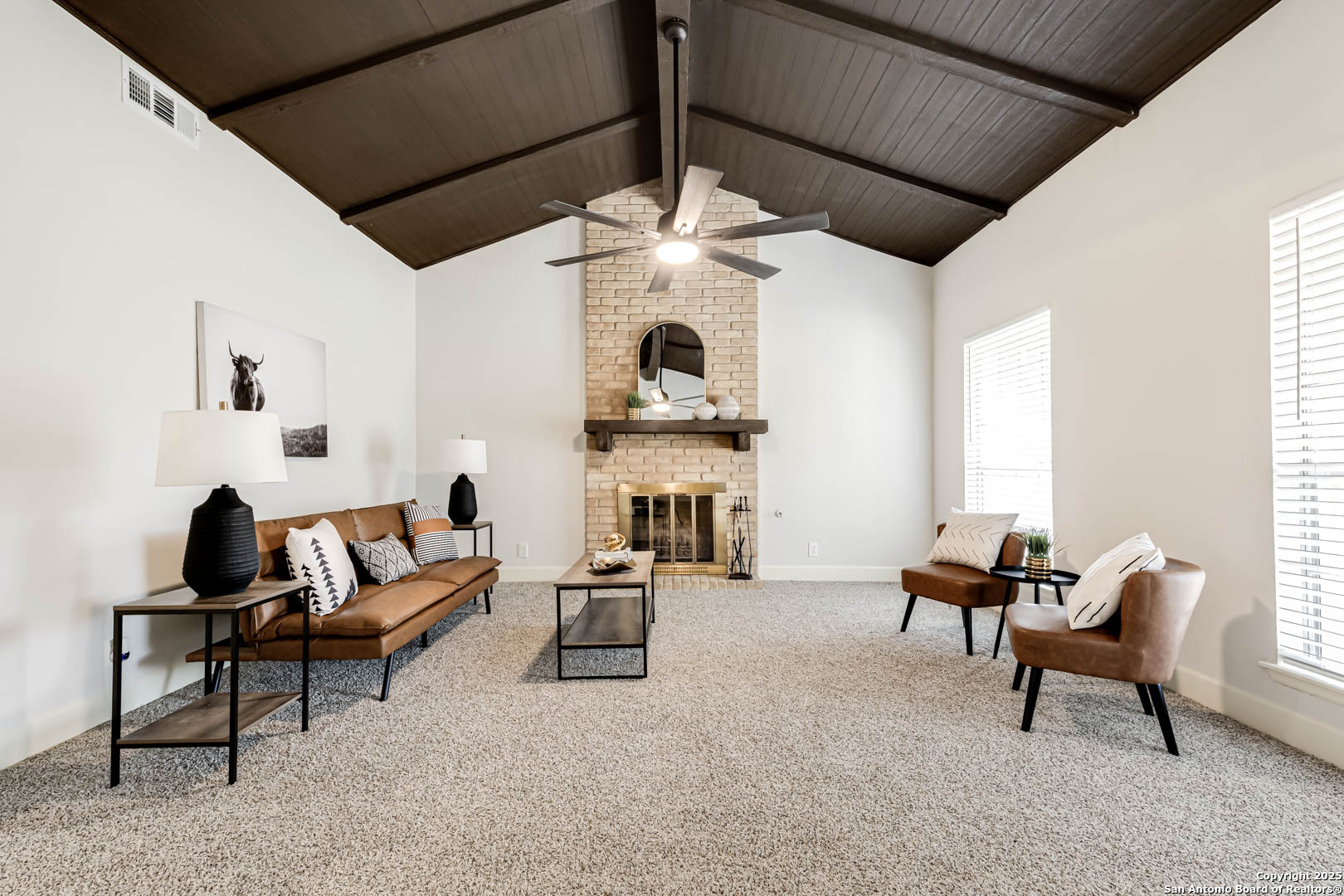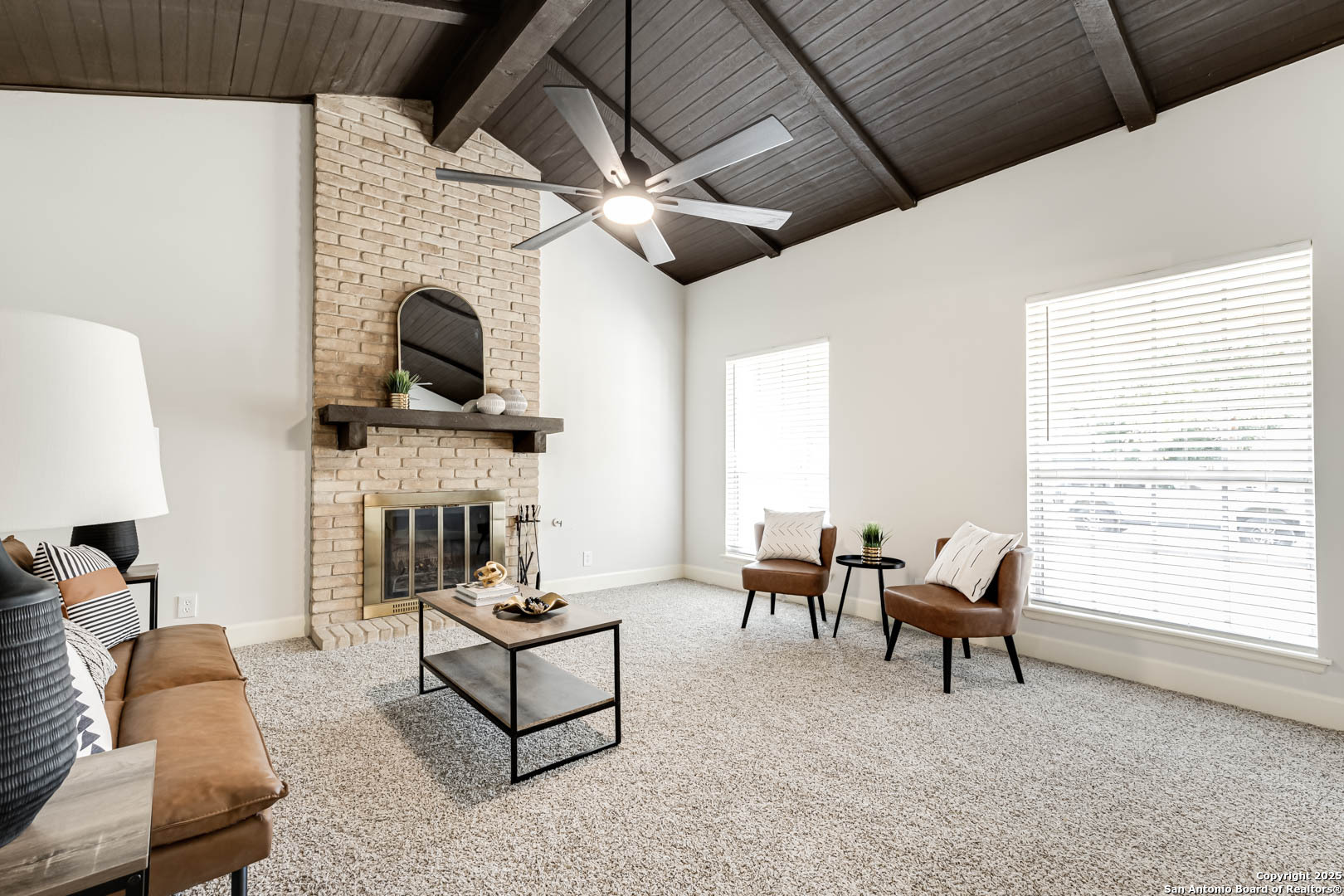 Beautifully renovated ranch-style home on a spacious corner lot in the established Glen Village community! This move-in-ready 4BR, 2BA property features a charming arched front porch and timeless curb appeal. Inside, you'll find a bright, open floor plan with vaulted ceilings, exposed beams, and a cozy brick fireplace anchoring the living area. The fully updated kitchen offers granite countertops, new cabinetry, stainless steel appliances, and a breakfast bar perfect for casual dining. Both bathrooms showcase designer tile, matte black finishes, and a double-sink vanity. The private primary suite includes a stylish walk-in shower and generous storage. A two-car garage with built-in shelving adds functionality, while the large 0.18-acre corner lot with mature trees provides plenty of space for entertaining or relaxing evenings outdoors. Conveniently located near Randolph AFB, The Forum, IH-35, Loop 410, and top NEISD schools. This home perfectly blends comfort, style, and location.