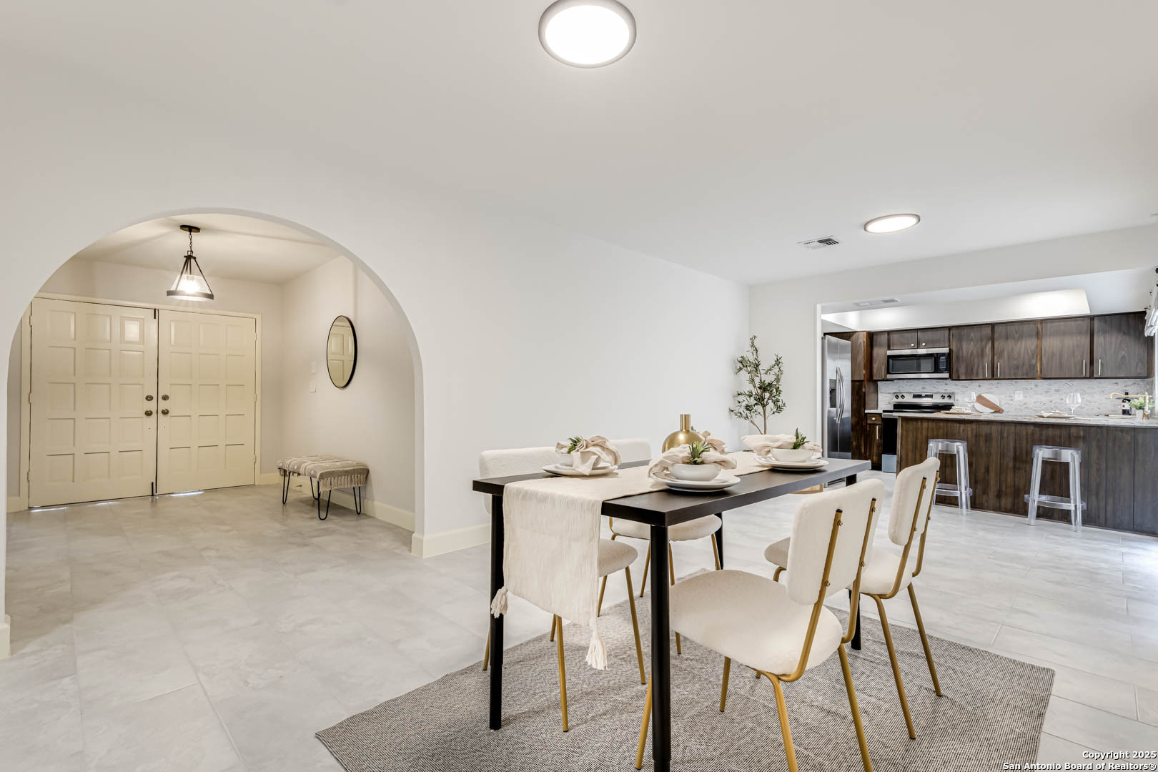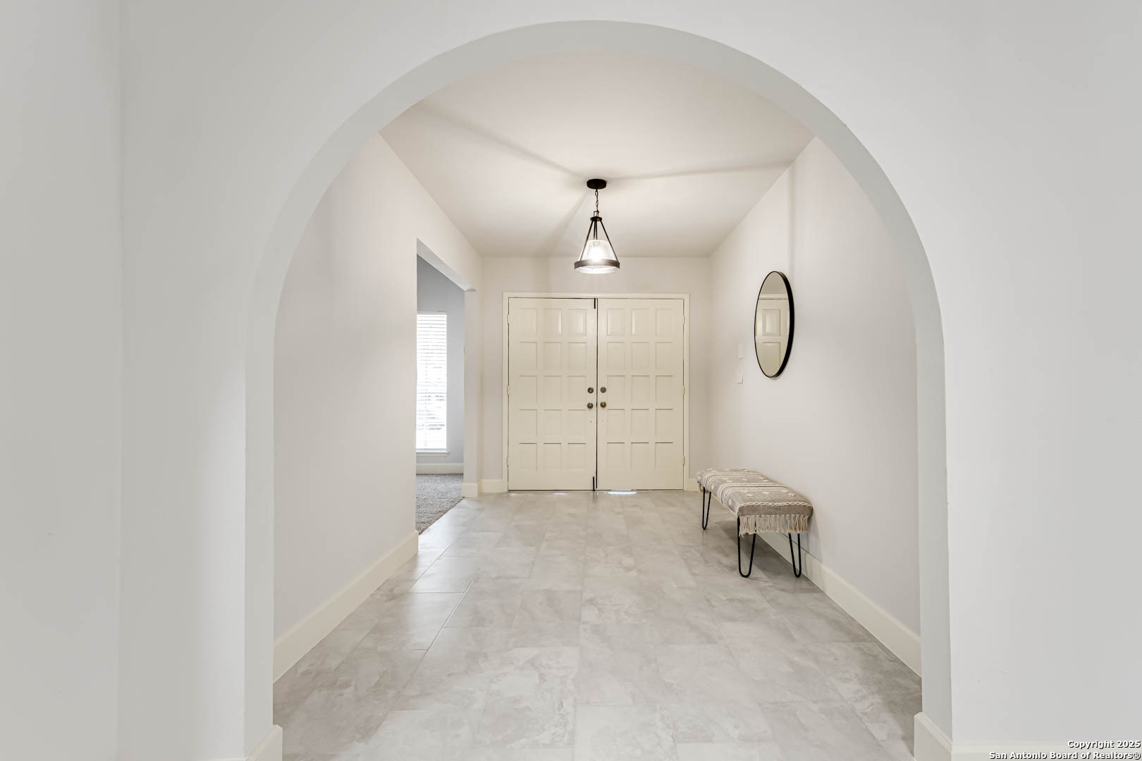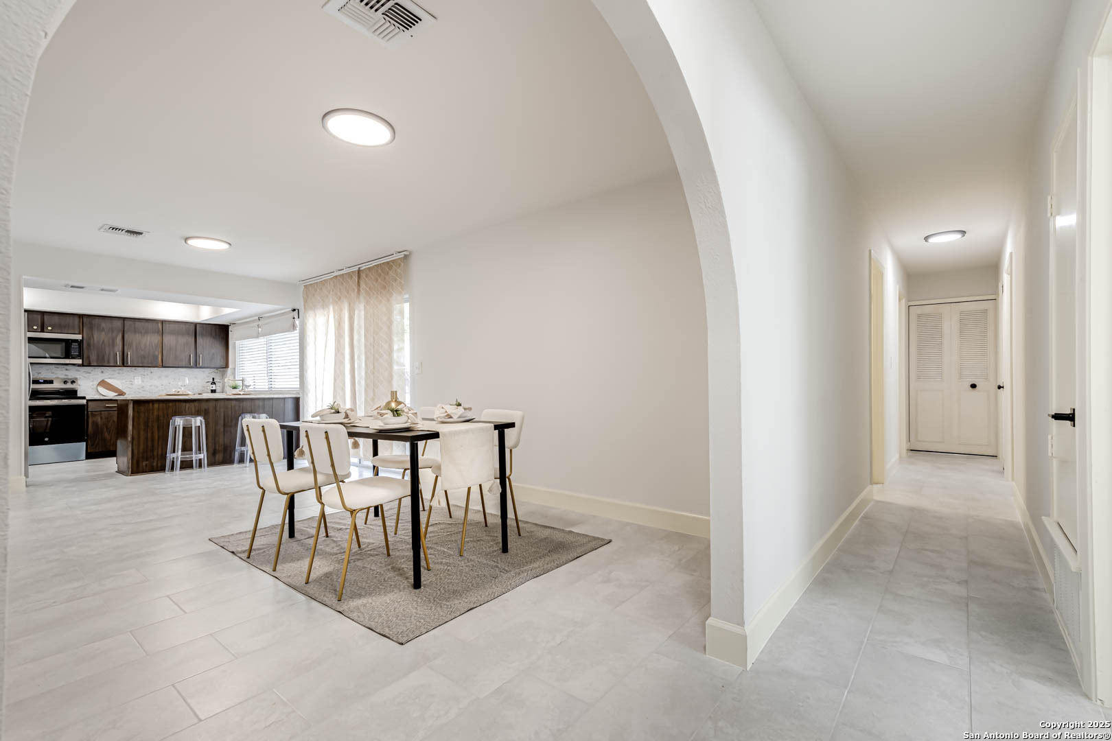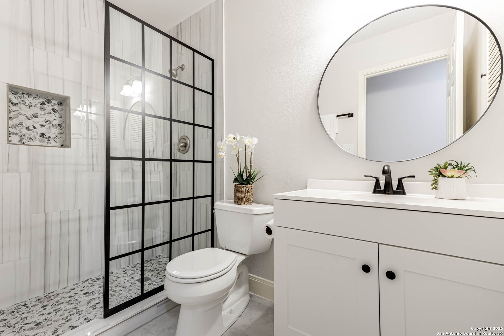 Beautifully renovated ranch-style home on a spacious corner lot in the established Glen Village community! This move-in-ready 4BR, 2BA property features a charming arched front porch and timeless curb appeal. Inside, you'll find a bright, open floor plan with vaulted ceilings, exposed beams, and a cozy brick fireplace anchoring the living area. The fully updated kitchen offers granite countertops, new cabinetry, stainless steel appliances, and a breakfast bar perfect for casual dining. Both bathrooms showcase designer tile, matte black finishes, and a double-sink vanity. The private primary suite includes a stylish walk-in shower and generous storage. A two-car garage with built-in shelving adds functionality, while the large 0.18-acre corner lot with mature trees provides plenty of space for entertaining or relaxing evenings outdoors. Conveniently located near Randolph AFB, The Forum, IH-35, Loop 410, and top NEISD schools. This home perfectly blends comfort, style, and location.