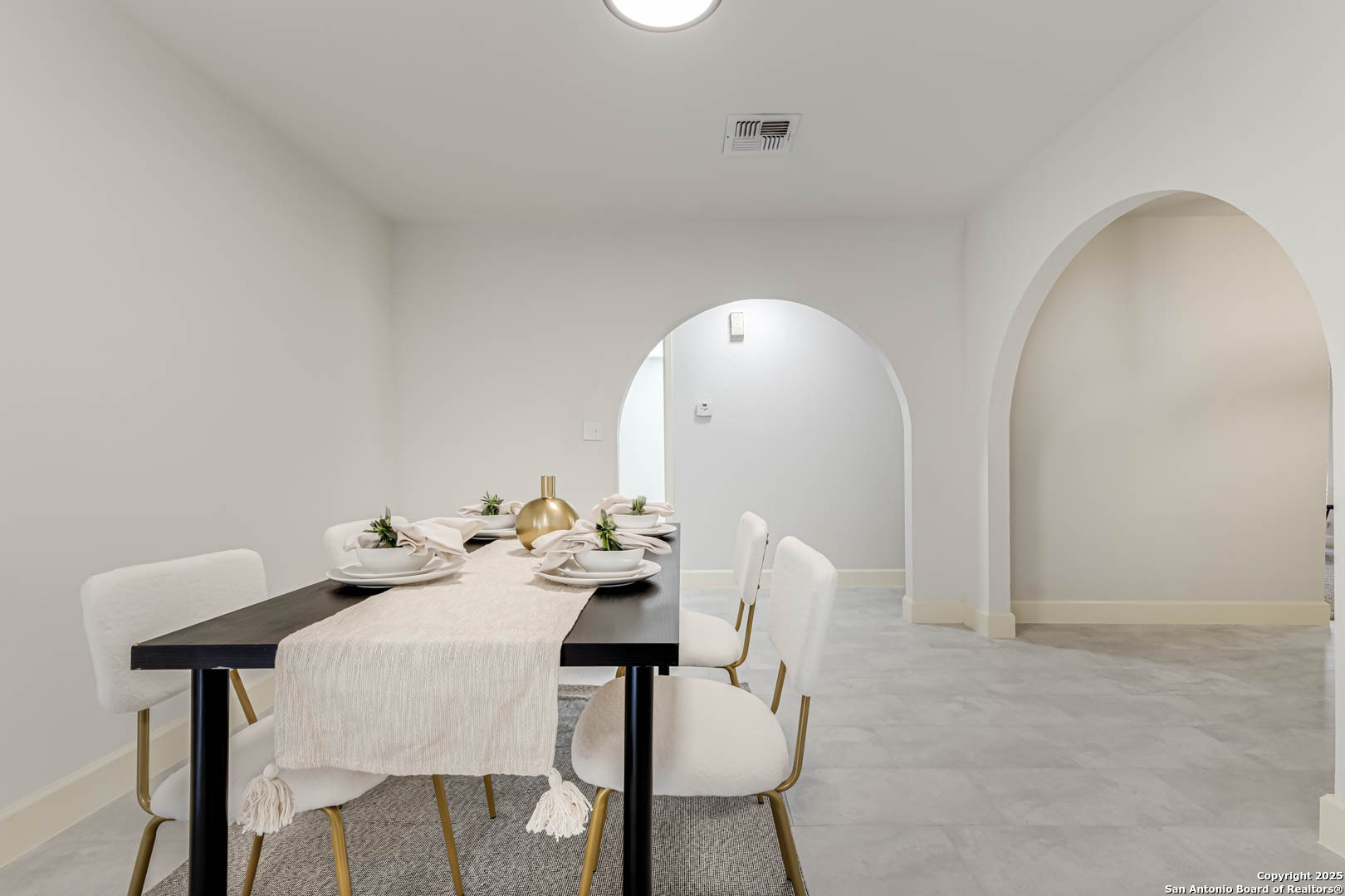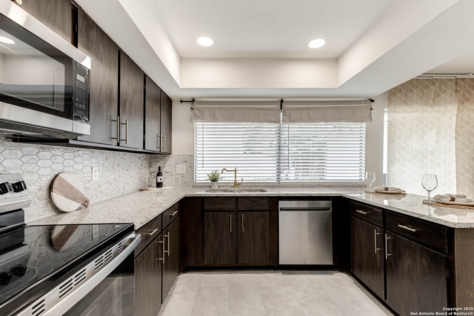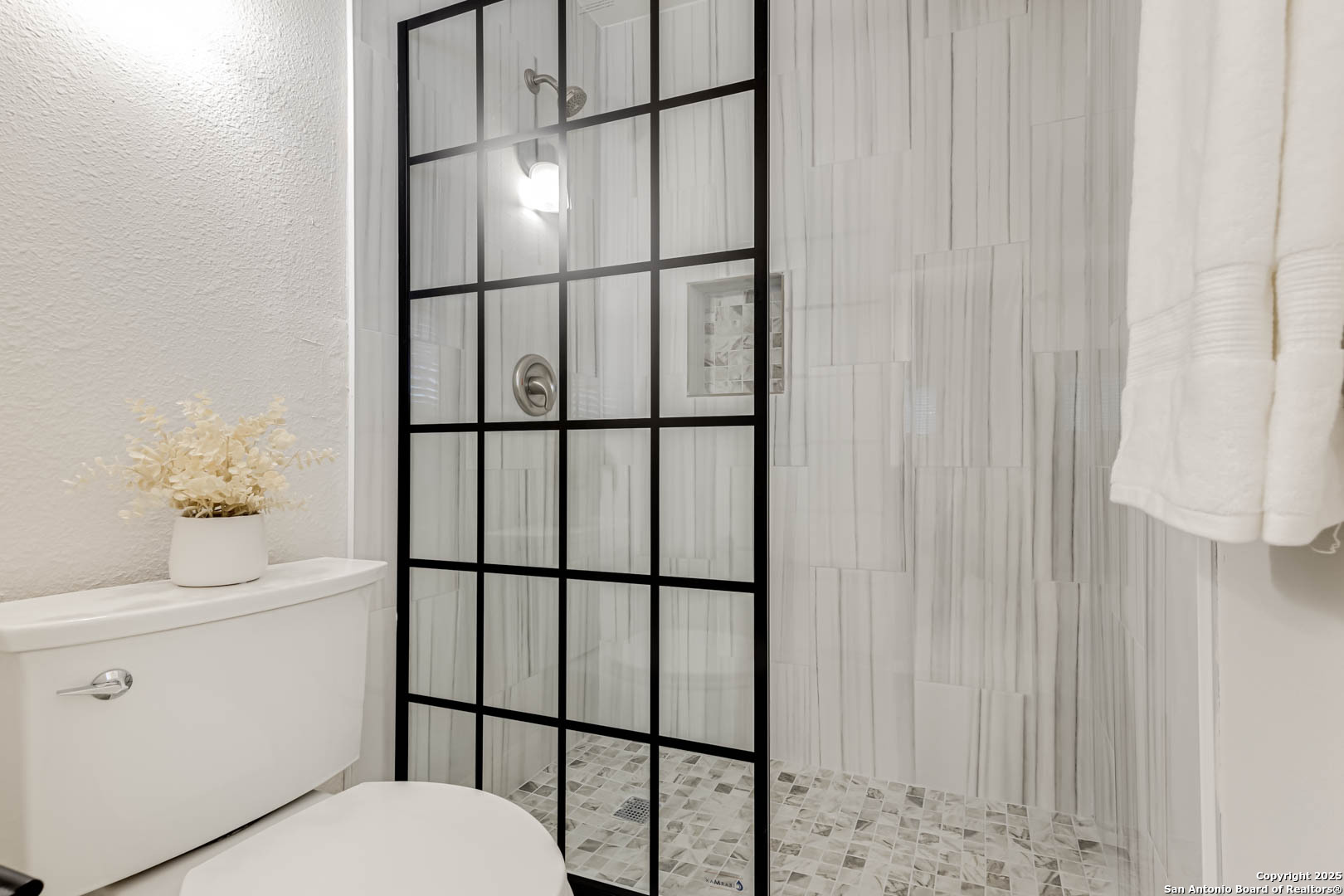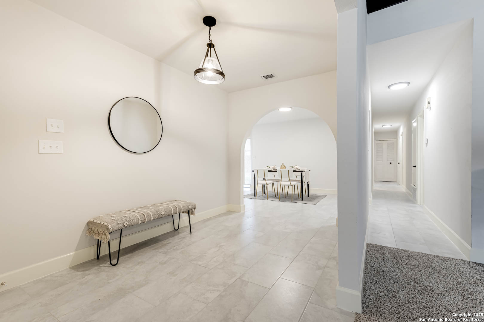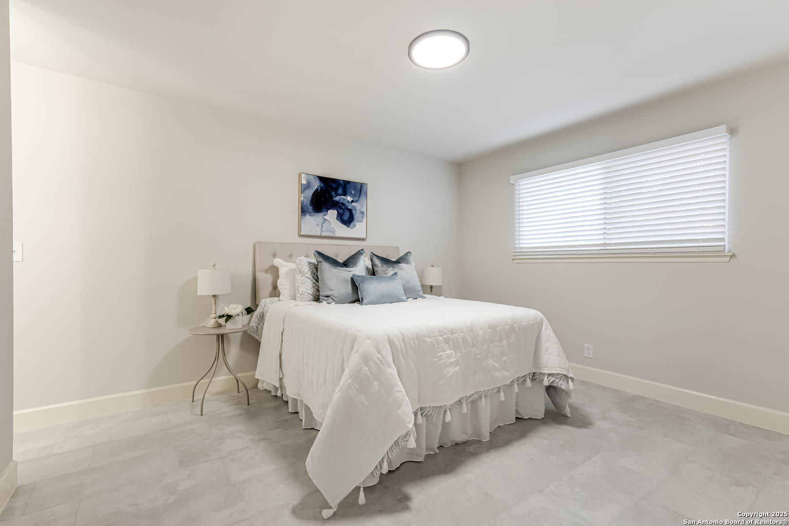 Beautifully renovated ranch-style home on a spacious corner lot in the established Glen Village community! This move-in-ready 4BR, 2BA property features a charming arched front porch and timeless curb appeal. Inside, you'll find a bright, open floor plan with vaulted ceilings, exposed beams, and a cozy brick fireplace anchoring the living area. The fully updated kitchen offers granite countertops, new cabinetry, stainless steel appliances, and a breakfast bar perfect for casual dining. Both bathrooms showcase designer tile, matte black finishes, and a double-sink vanity. The private primary suite includes a stylish walk-in shower and generous storage. A two-car garage with built-in shelving adds functionality, while the large 0.18-acre corner lot with mature trees provides plenty of space for entertaining or relaxing evenings outdoors. Conveniently located near Randolph AFB, The Forum, IH-35, Loop 410, and top NEISD schools. This home perfectly blends comfort, style, and location.