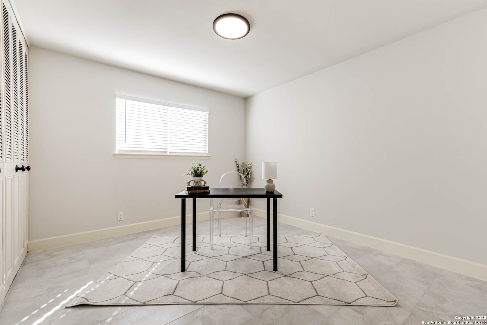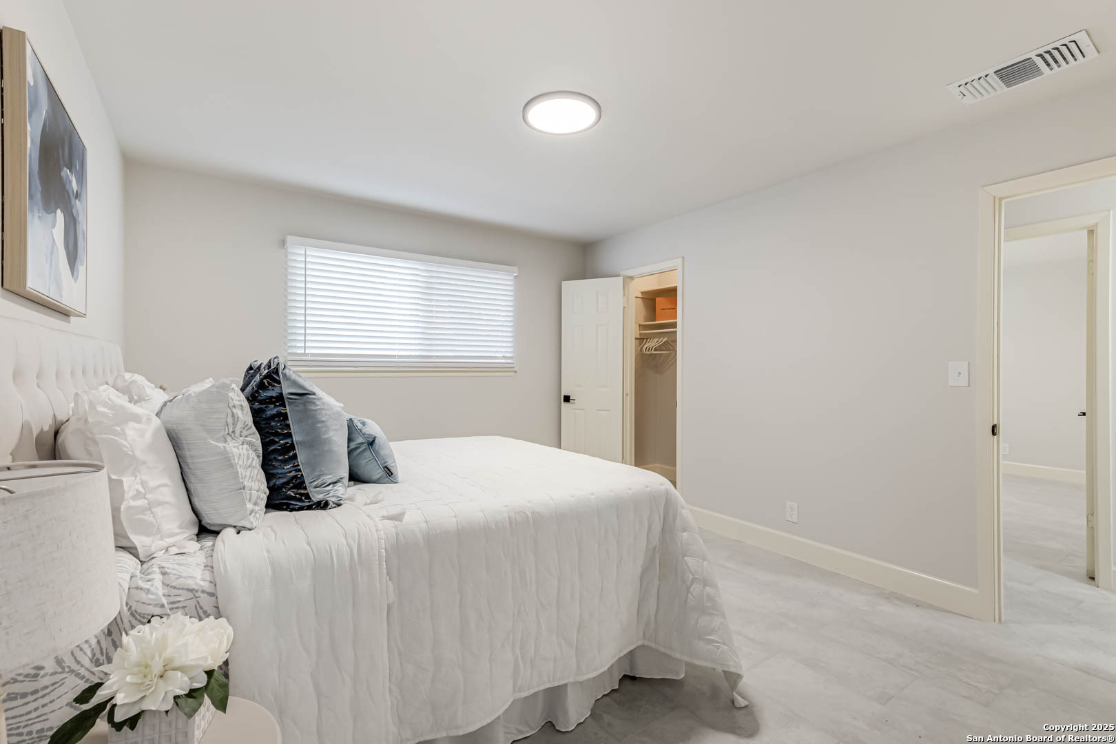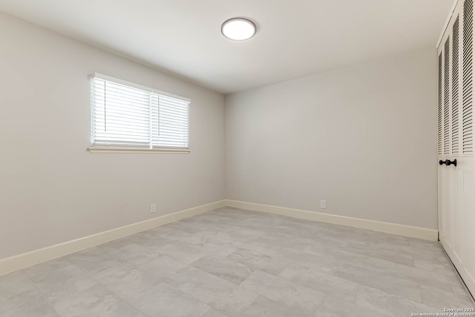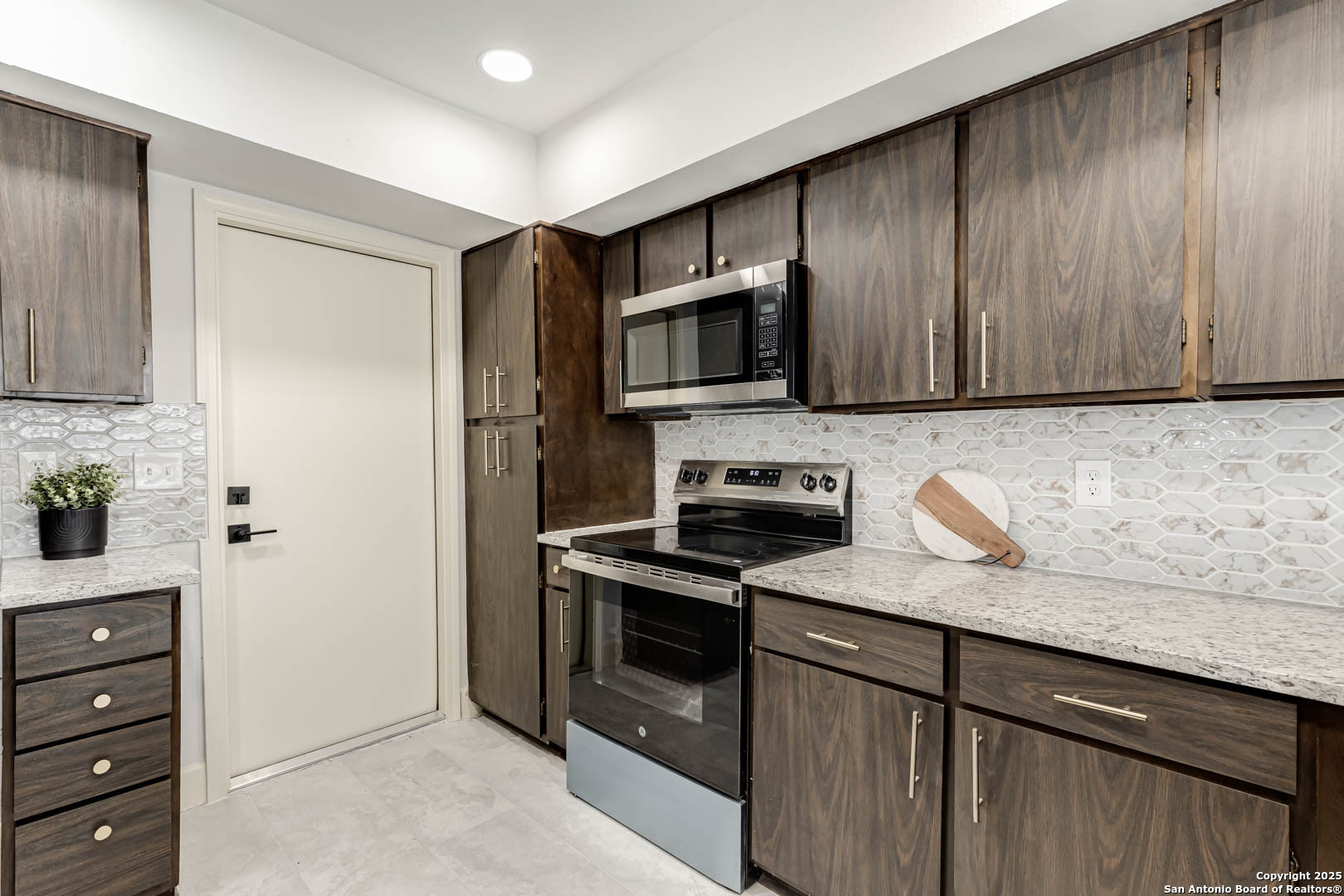 Beautifully renovated ranch-style home on a spacious corner lot in the established Glen Village community! This move-in-ready 4BR, 2BA property features a charming arched front porch and timeless curb appeal. Inside, you'll find a bright, open floor plan with vaulted ceilings, exposed beams, and a cozy brick fireplace anchoring the living area. The fully updated kitchen offers granite countertops, new cabinetry, stainless steel appliances, and a breakfast bar perfect for casual dining. Both bathrooms showcase designer tile, matte black finishes, and a double-sink vanity. The private primary suite includes a stylish walk-in shower and generous storage. A two-car garage with built-in shelving adds functionality, while the large 0.18-acre corner lot with mature trees provides plenty of space for entertaining or relaxing evenings outdoors. Conveniently located near Randolph AFB, The Forum, IH-35, Loop 410, and top NEISD schools. This home perfectly blends comfort, style, and location.