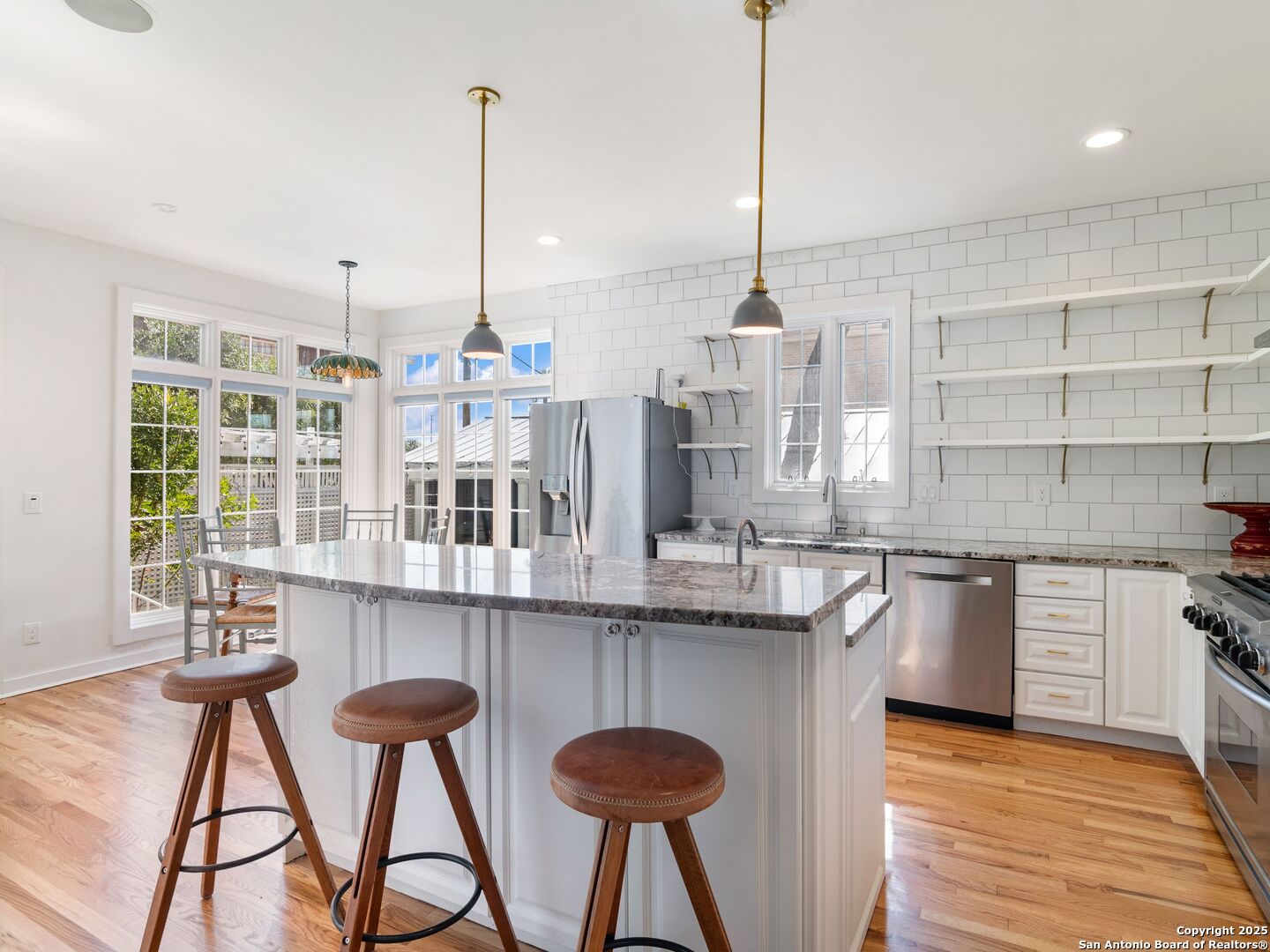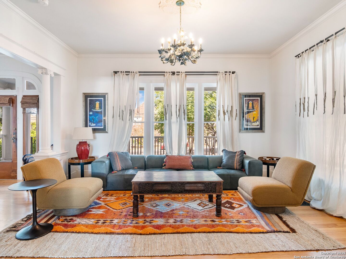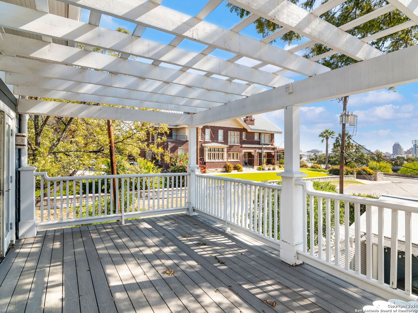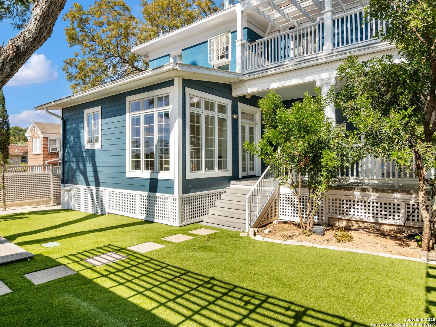 Nestled in the heart of the Alta Vista Conservation District, this beautifully remodeled Colonial home seamlessly blends historic charm with modern elegance. Conveniently located near the vibrant Pearl District, this residence features exquisite architectural details, a newly designed kitchen and bathrooms with custom cement tile, and a charming wraparound porch. The second-level outdoor deck offers breathtaking views of downtown, perfect for relaxing or entertaining. The property also includes a 430 sq. ft. enclosed two-car garage. Don't miss the opportunity to own a piece of San Antonio's history with all the conveniences of modern living!