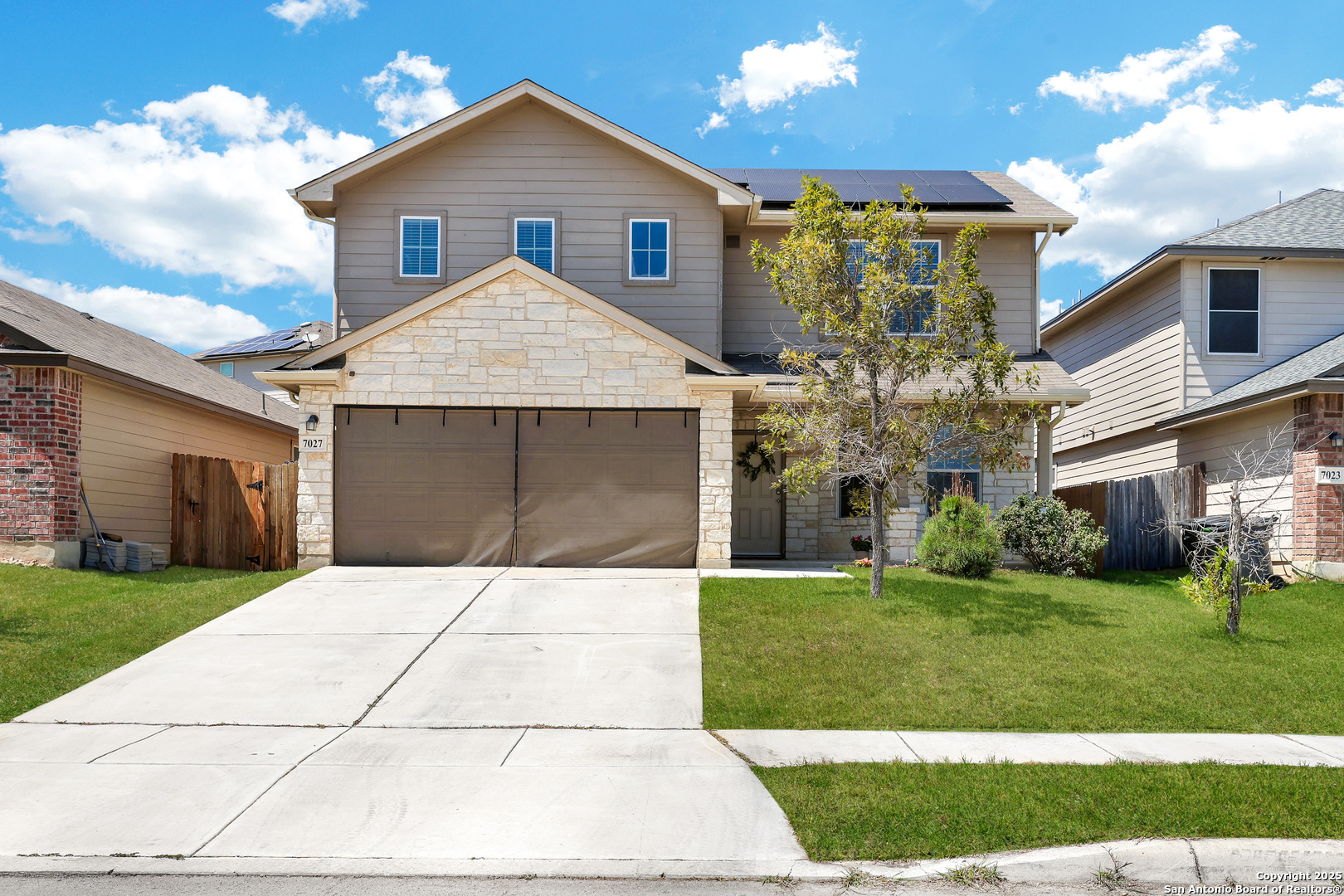 Minutes away from Lackland AFB! Solar panels included = LOWER electric bills! The neighborhood pool is just 2 mins walk from the house, includes playground and sport court. Welcome to this inviting two-story home at 7027 Aphrodite Mist featuring 4 bedrooms and 2.5 bathrooms. The first floor has no carpet, showcasing tile and vinyl flooring. Off the entry, a dining/flex room adds versatility for work or entertaining. The kitchen opens to the family room and includes painted cabinetry, tile backsplash, a breakfast bar, and stainless steel appliances, with refrigerator included. Main floor primary suite with dual vanities, garden tub, and separate shower - privacy from the upstairs three bedrooms, full bath, and game room! POOL TABLE INCLUDED! High ceilings, backyard views, covered porch & patio, plus 2-car garage. Amazing HOA Amenities: Pool, Park/Playground, Jogging Trails, Sports Court, Bike Trails, Basketball Court - everything your family needs! Perfect for military families! Come see why this gem won't last long!