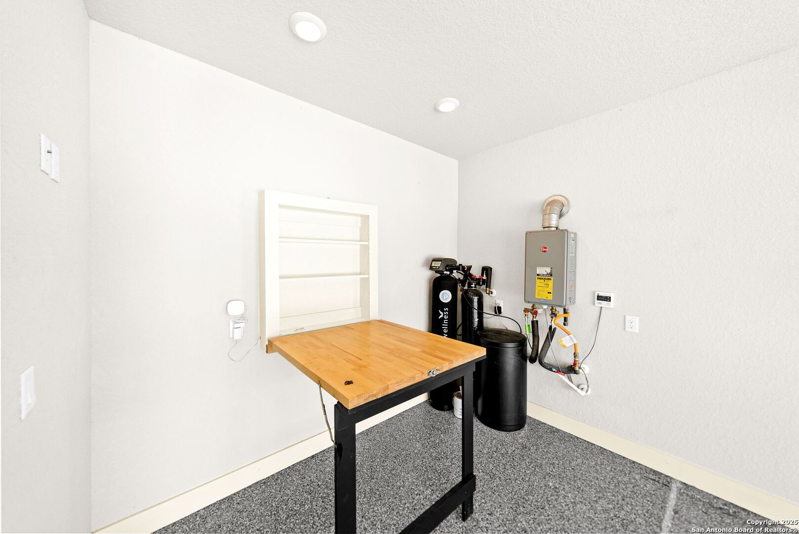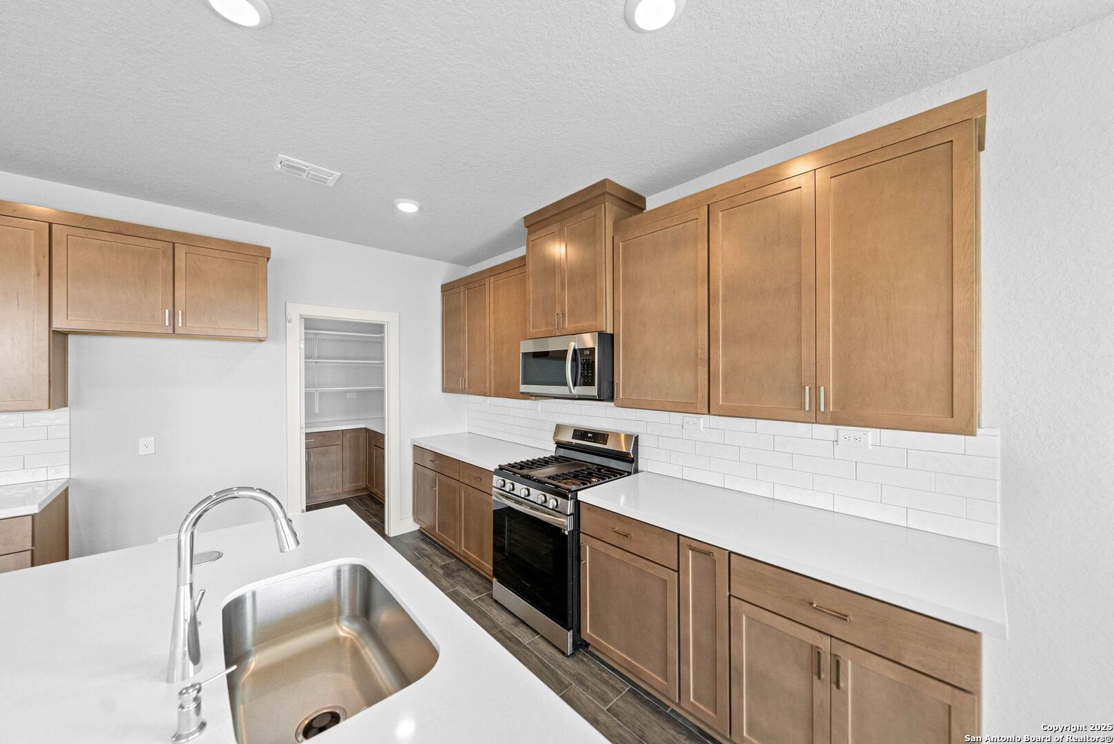 This elegant 4-bedroom, 3-bathroom home offers 1,938 square feet of thoughtfully designed living space where style meets functionality. The open concept layout creates a bright and welcoming atmosphere, perfect for everyday living and entertaining. At the heart of the home is a gourmet kitchen featuring luxurious quartz countertops, a massive island ideal for gatherings, and a morning kitchen that makes meal prep simple and efficient. The kitchen flows seamlessly into the living and dining areas, highlighted by beautiful ceramic tile flooring. The owner's suite is a private retreat with a spa-like bathroom, custom wood shelving, a walk-in closet, and a separate thermostat for personalized comfort. Every detail has been carefully considered, from the 8-foot Craftsman entry door to the built-in Amazon drop box for secure package deliveries. This home also boasts a super energy-efficient tankless water heater, a water purifier and softener combo, an irrigation system to keep your lawn lush, and a spacious storage shed. The A/C and heated garage with epoxy flooring provides year-round comfort and utility. Step outside to a covered patio perfect for morning coffee or evening barbecues, while the backyard offers plenty of space for relaxation and outdoor fun. With its modern features, practical upgrades, and inviting layout, this home is designed to enhance your daily living experience and make every moment at home feel special.