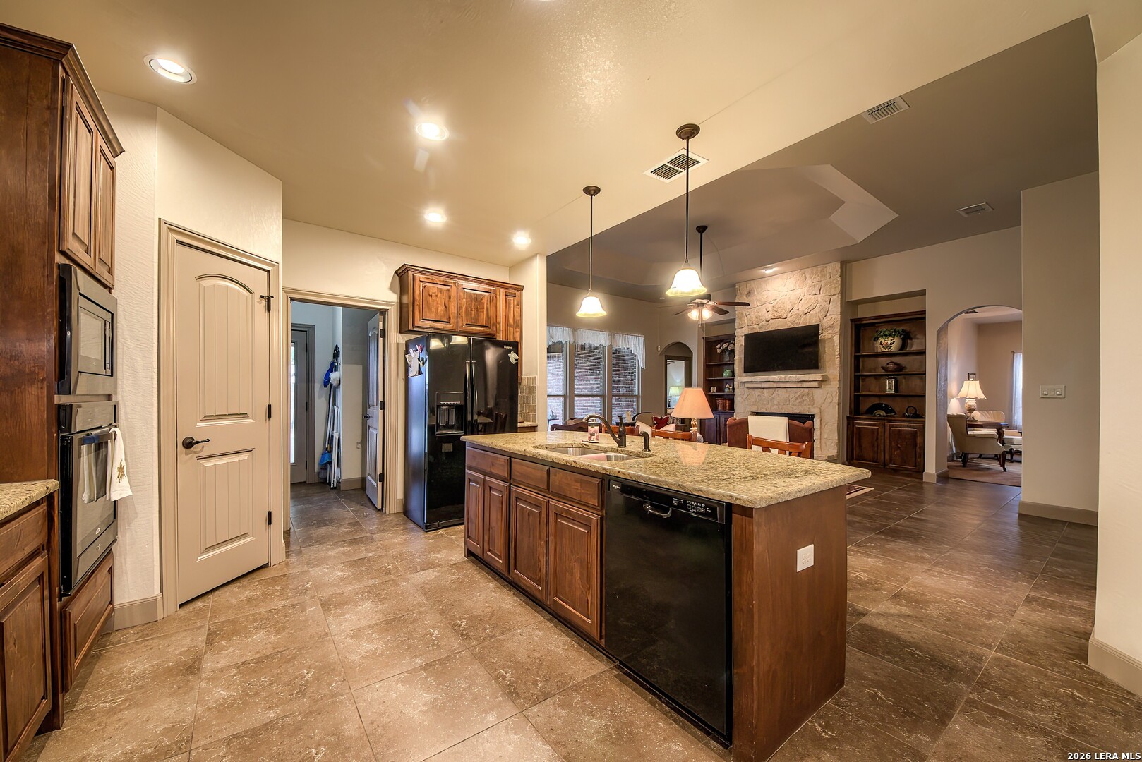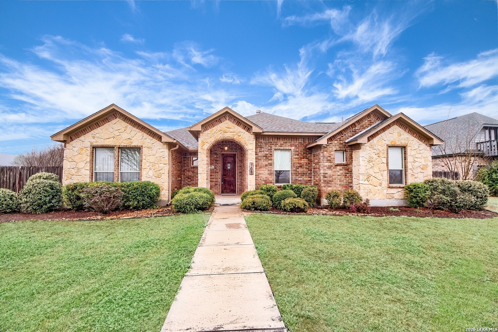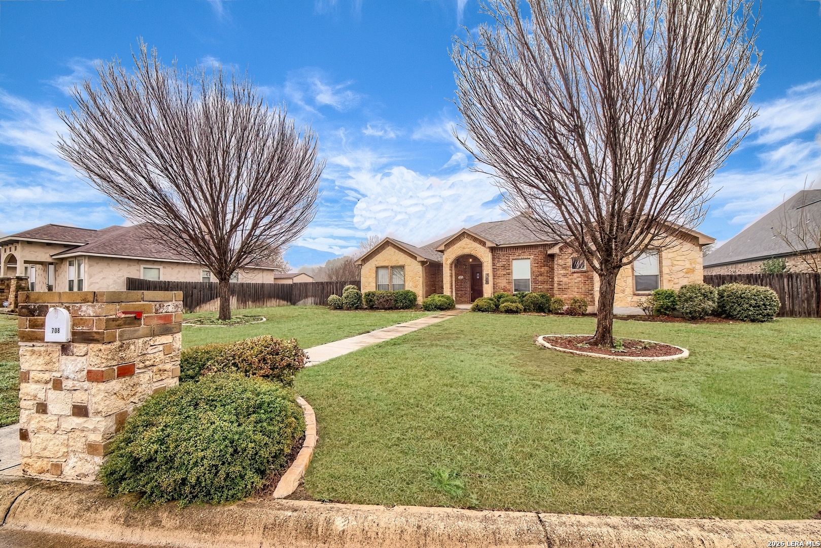 Beautiful, move-in ready Home, very well maintained, on southern edge of Hondo. Featuring 3BR/2.5BA, 2050 s.f., open floorplan (kitchen, living rm, dining rm) w/ large windows looking into the back yard - granite countertops, eat-in kitchen, beautiful wood cabinets, large living room w/ fireplace, dining room and 1/2 bath. Very nice master suite w/ walk-in closet, tile shower and double sinks. Unique sitting area/kids play area outside 2nd/3rd bedrooms. Covered front and back porches - back porch is very spacious, lots of room for outdoor furniture. Attached 2-car carport w/ alley entrance and remote control entrance gate. The entire yard is under automatic sprinkler system. Storage building in back yard, privacy fencing and completely landscaped. Near regional Hospital, easy access to HEB and Walmart.