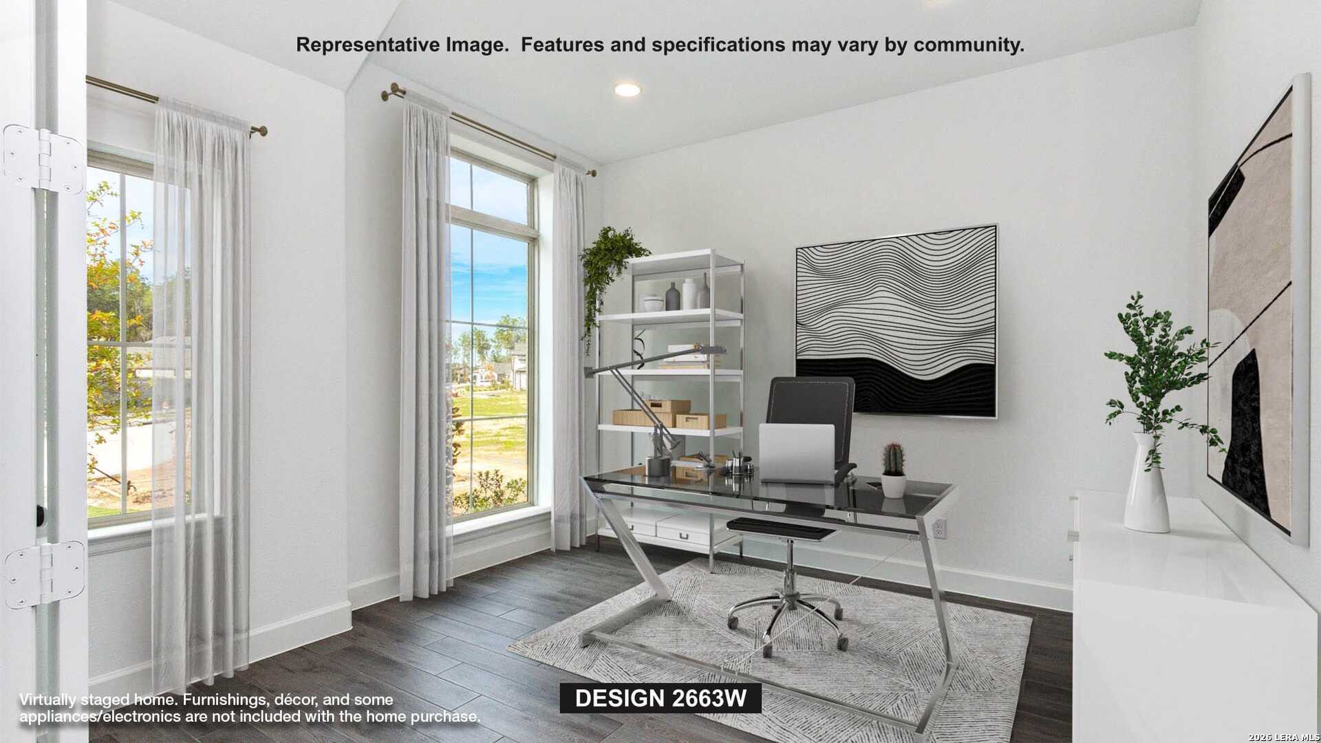 Welcoming porch extends to entry with home office at entry. Open family room with 12-foot ceiling and a large wall of windows. Dining area offers generous natural lighting with wall of windows. Island kitchen with built-in seating space, a 5-burner gas cooktop, and a corner walk-in pantry. Private primary suite features bedroom, double door entry to primary bathroom, dual vanities, a freestanding tub, separate glass enclosed shower and two walk-in closets. Secondary bedrooms with walk-in closets, a utility room and a Hollywood bathroom completes this spacious design. Extended covered backyard patio. Mud room just off the three-car garage.