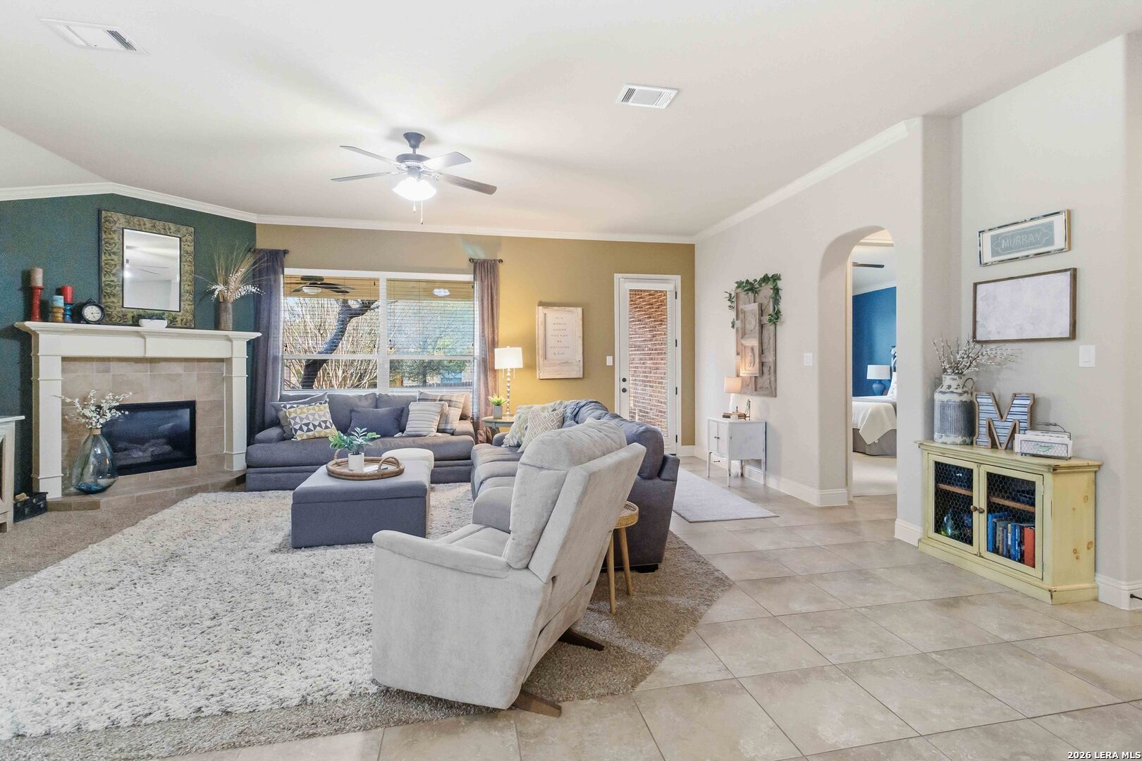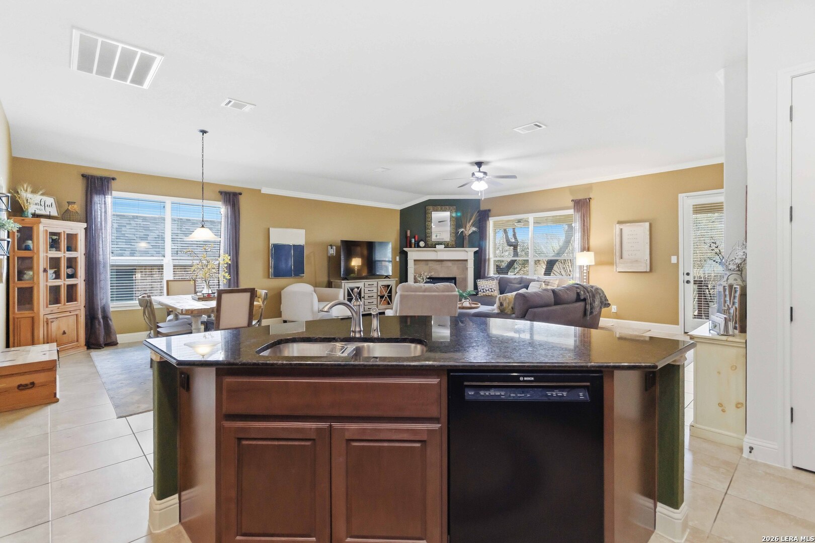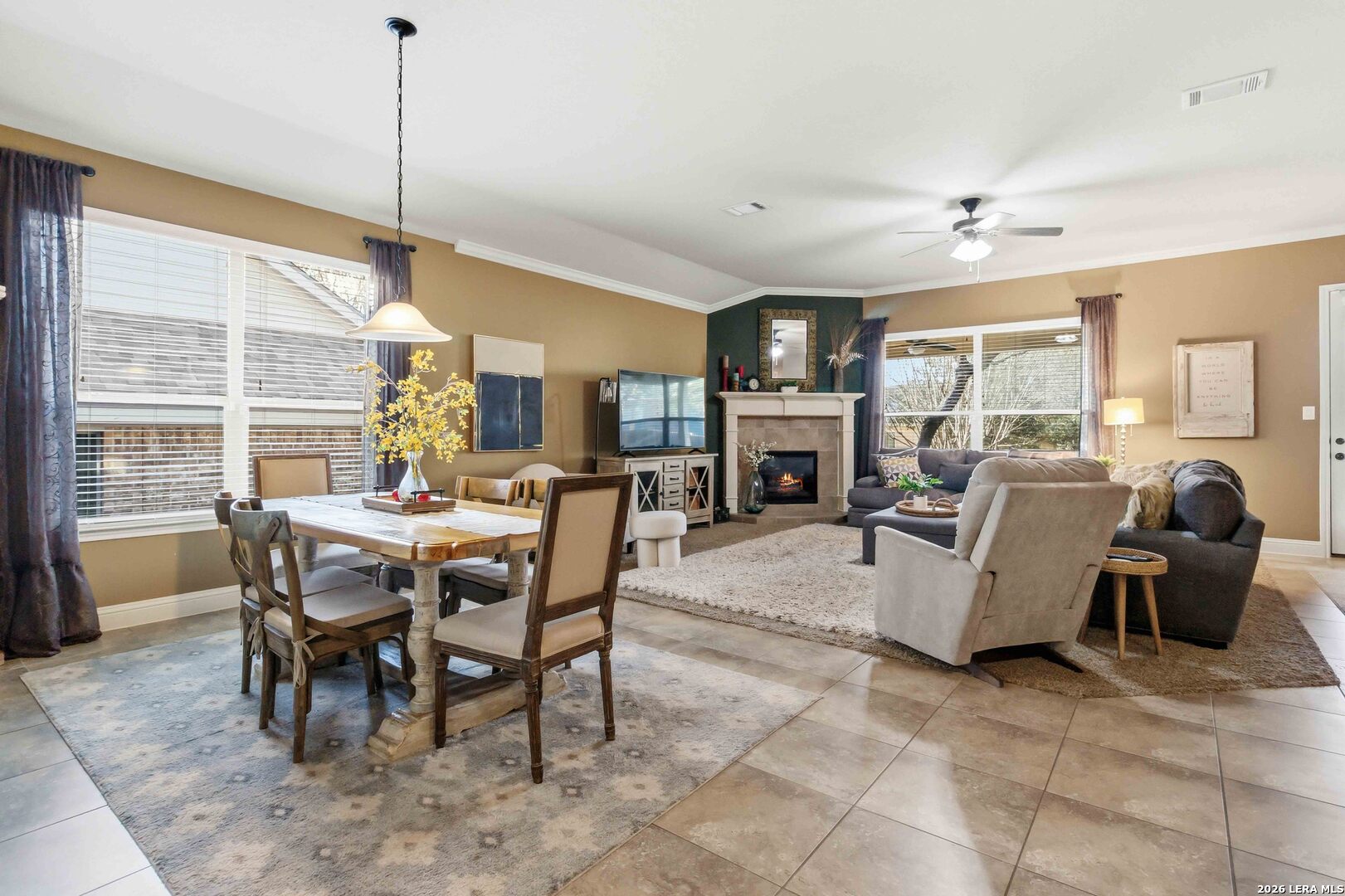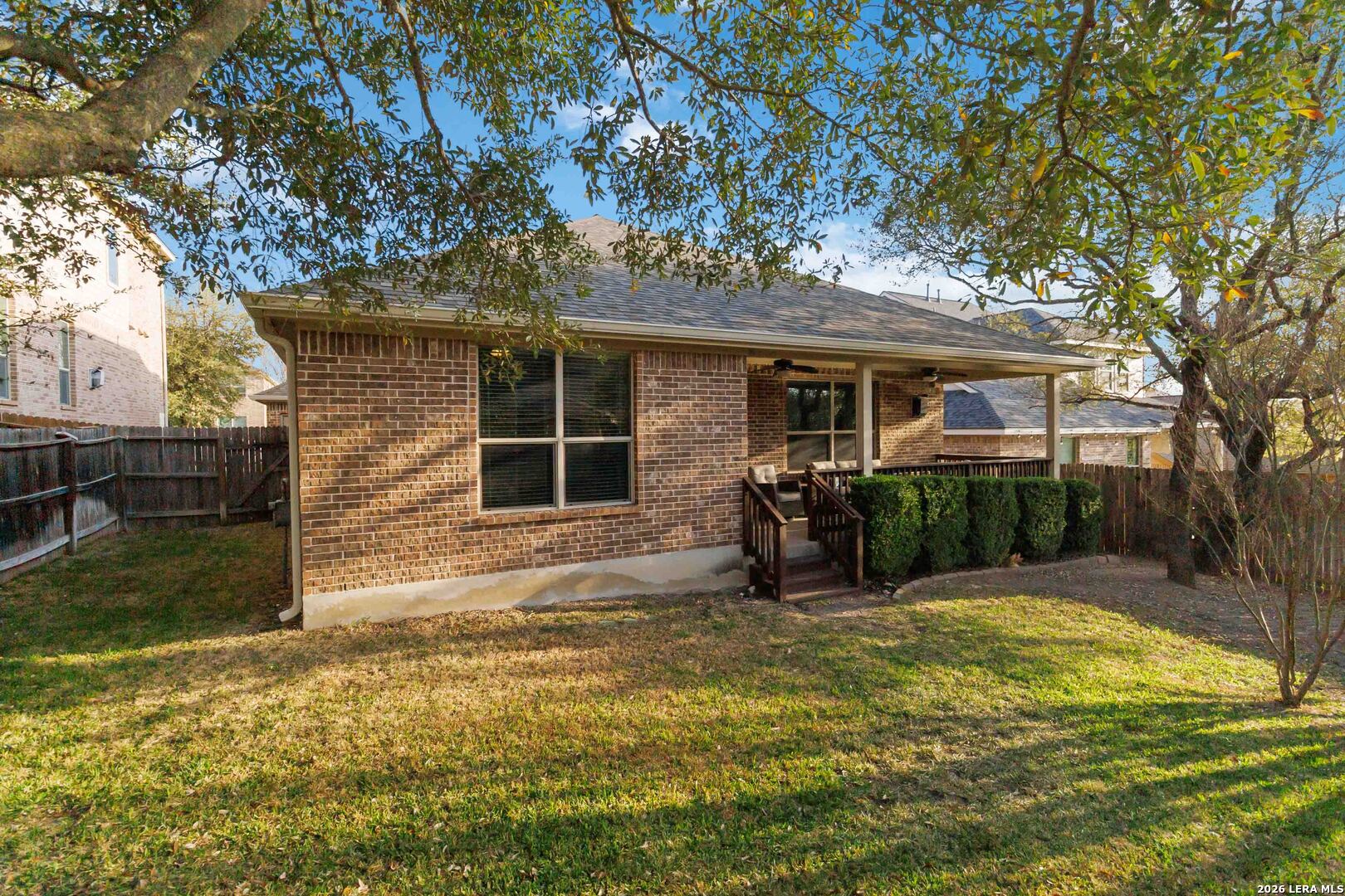 Here is your chance to get into the coveted Terra Bella gated neighborhood. Nestled on a charming, tree-shaded lot, the inviting brick exterior and mature landscaping create wonderful curb appeal from the moment you arrive. Inside, you'll find a bright and spacious open-concept layout that seamlessly connects the living, dining, and kitchen areas-perfect for both everyday living and entertaining. Large windows fill the home with natural light while highlighting the warm, neutral tones throughout. The living room features a cozy fireplace and high ceilings, creating an inviting space to relax or gather with guests. The kitchen overlooks the main living areas and includes ample counter space, a functional island with sink, and abundant cabinetry, making meal preparation and hosting effortless. The dining area offers plenty of space for family meals while enjoying views of the backyard. The generous primary suite provides a private retreat, while two additional bedrooms offer flexibility for family, guests, or a home office. Located within the highly regarded North East Independent School District, the property also offers convenient access to shopping, dining, and major highways, making commuting and everyday errands easy. Amenities shine in this development with a resort style pool, sport court, covered pavilion, splash pad, walking trails throughout.
