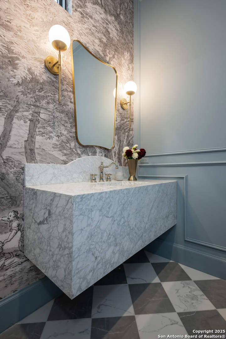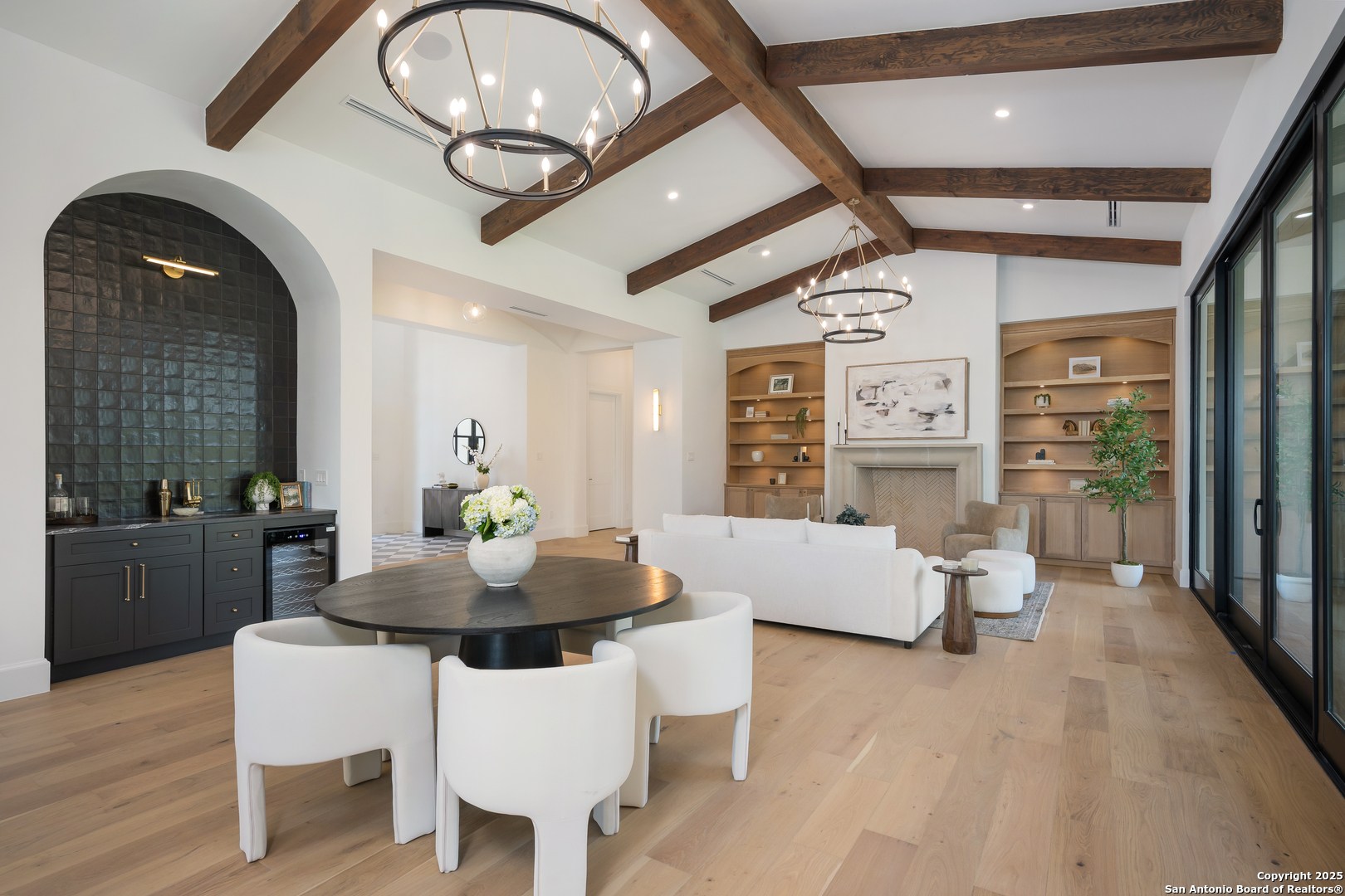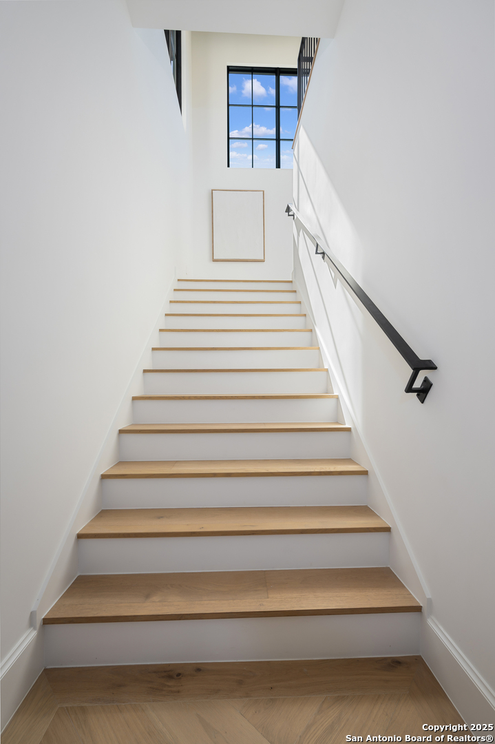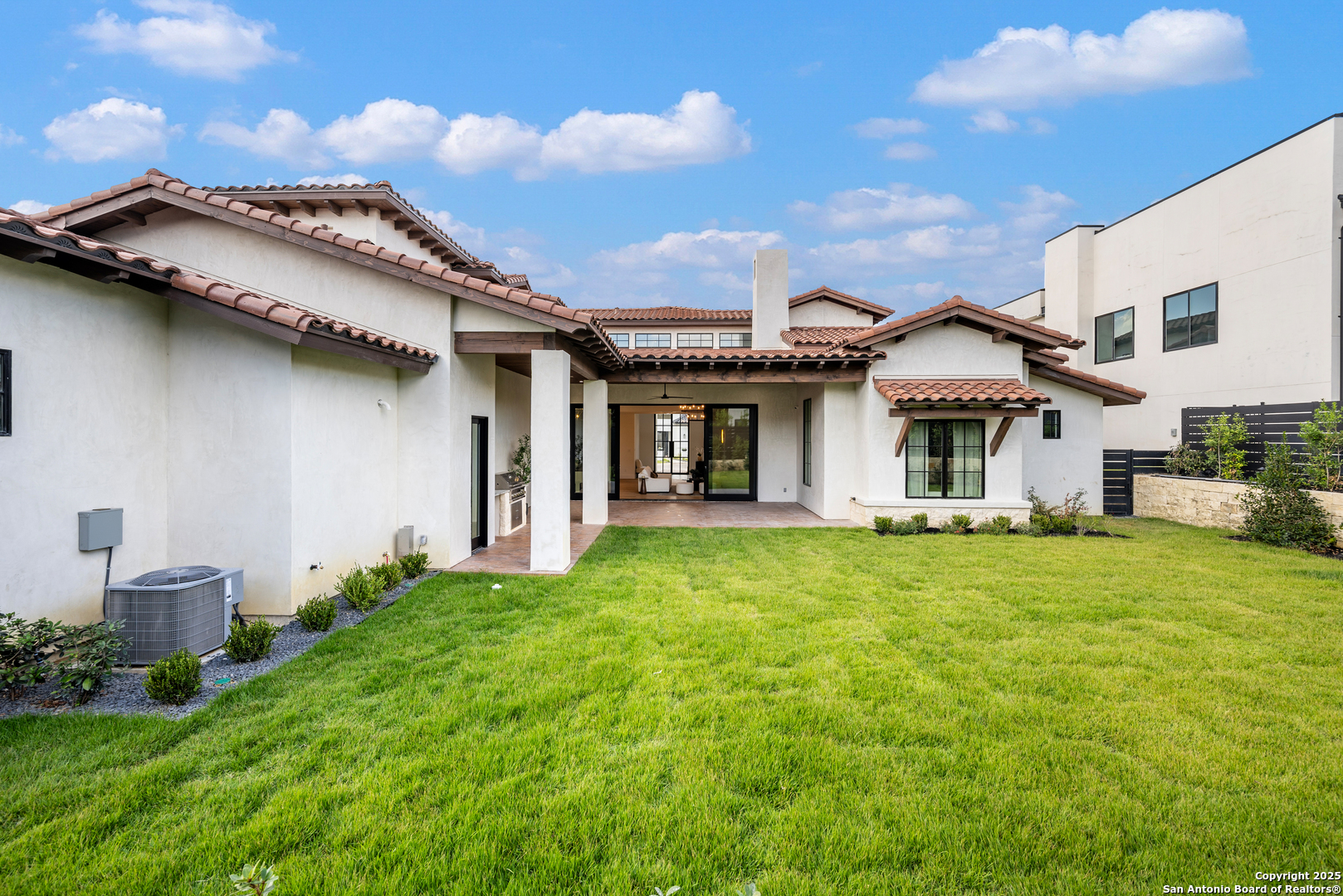 Meticulously designed by award-winning architect Oscar E. Flores and masterfully constructed by Magnolia Custom Homes, this Spanish architectural gem in The Bluffs Dominion is a rare expression of timeless elegance and modern luxury. Rising from a private corner lot, the residence stuns with its unique stucco facade, complemented by natural stone and metal accents. The grand entrance boats a brick-paved walkway and porch, a solid architectural cast-stone entry, 11 foot wrought-iron French doors crowned by Spanish tile roof with exposed rafter tails. The limestone and landscaping complete its commanding exterior presence. Beyond the grand entry, interiors unfold with soaring ceilings, Douglas Fir beams, white oak flooring in herringbone pattern, marble tile accents and smooth plastered walls enriched by alabaster, brass, and glass lighting. A custom bar with floating shelves, bold wall treatments, and coffered ceilings with integrated lighting throughout elevate every space with refinement. The chef's kitchen is a showpiece with reeded white oak cabinetry, a Taj Mahal quartzite island, matching stone backsplash, fluted glass cabinets, plastered vent hood, and a hidden butler's pantry with sink, counter space, and room for an additional refrigerator. Outfitted with professional-grade Thermador appliances- including a WiFi-enabled built in 48-inch refrigerator/ freezer columns, six-burner range with griddle and double gas oven, plus an additional built-in electrical wall oven, microwave, and paneled dishwasher. An apron sink, adorned with antique brass fixtures, frames a picturesque view into the living room, where a stately fire place and exquisite architectural detailing harmoniously tie the living room together. Retreat to the primary suite, a sanctuary of exposed beams, dual custom closets including secondary washer/dryer, a spa-worthy tub and high-design frame-less glass shower and custom floating vanities. Designated for seamless indoor/outdoor entertaining, the oversized sliding doors lead to a beautifully tiled sizable patio with Douglas Fir ceiling and beams, stone-clad BBQ grill, and an elegant exterior half bath. The generous square footage of the private level backyard with stone-tiered garden terraces and extensive landscaping provide and idyllic canvas for a custom swimming pool or resort-style retreat. The luxurious office features classic wall panel moldings, rich moody paint and custom lighting, plus a built-in 'secret' murphy book shelf leading to an substantially sized closet with room for a safe that adds a touch of modern sophistication. The downstairs guest suite indulges in serene views of the front courtyard, complemented by a show-stopping en-suite bathroom adorned with intricate marble mosaic tile, generous walk-in closet, and bespoke nickel fixtures that exude timeless sophistication. The second living upstairs showcase a stunning display of floor to ceiling windows and a Spanish-tiled balcony offers sweeping hilltop views. Two large upstairs bedrooms are accompanied by private walk-in closets and bathrooms, each thoughtfully finished with its own signature mix of marble, tile, and floating vanities- spaces as unique as the rooms they serve. The expansive three-car garage boats soaring ceilings, a built-in work bench and custom cabinetry, an additional storage closet, plus two electric car enabled charging outlets in total to offer maximum functionality and potential. Smart home features, Sonos sound systems, CAT-6 wiring, three HVAC units, and tankless water heaters ensure modern convenience throughout this brand new construction residence. With every detail curated to embody the romance of Spanish architecture combined with sophistication of contemporary luxury, this estate is a crown jewel within the gates of the Dominion.