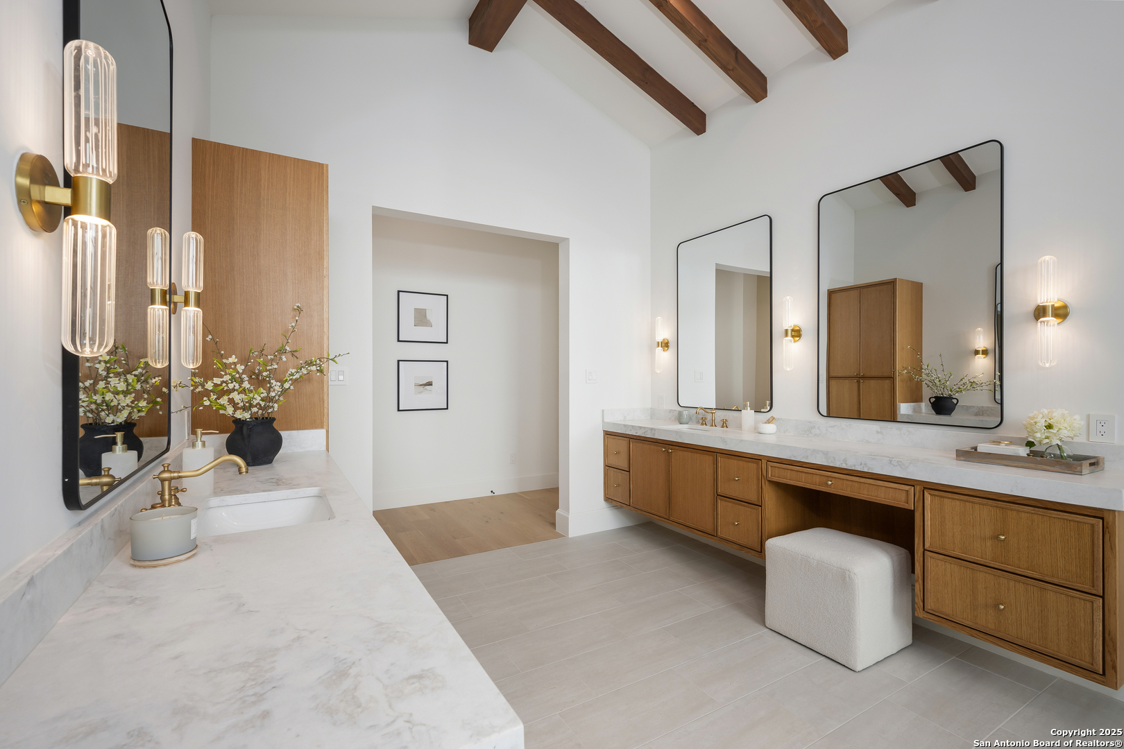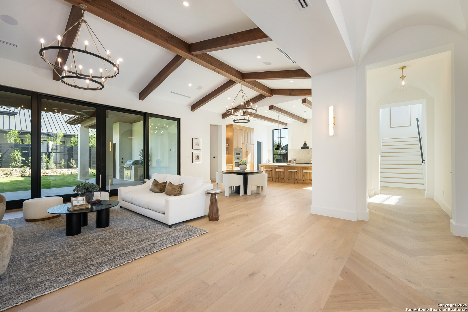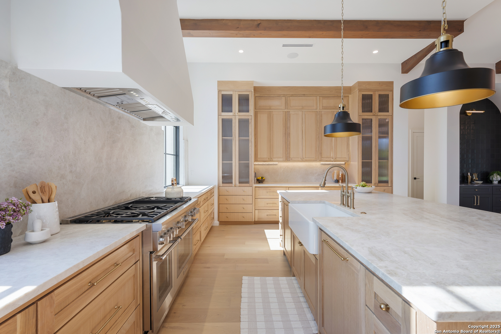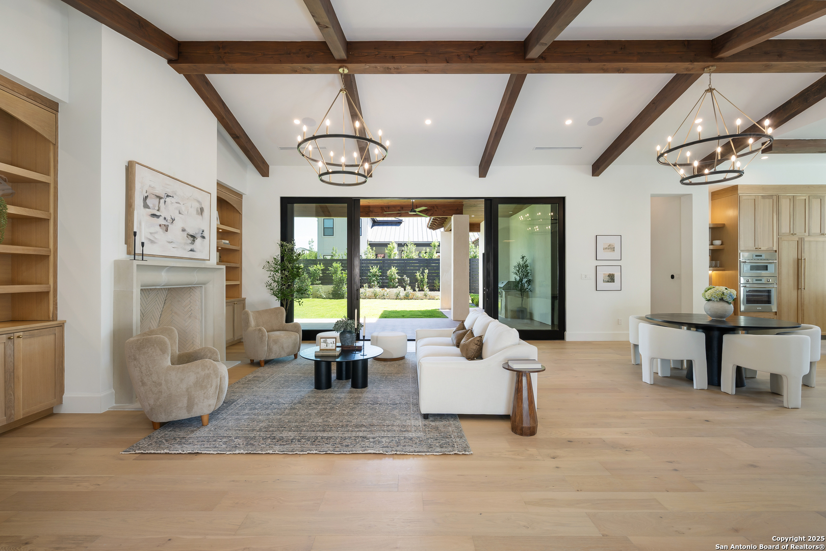 Meticulously designed by award-winning architect Oscar E. Flores and masterfully constructed by Magnolia Custom Homes, this Spanish architectural gem in The Bluffs Dominion is a rare expression of timeless elegance and modern luxury. Rising from a private corner lot, the residence stuns with its unique stucco facade, complemented by natural stone and metal accents. The grand entrance boats a brick-paved walkway and porch, a solid architectural cast-stone entry, 11 foot wrought-iron French doors crowned by Spanish tile roof with exposed rafter tails. The limestone and landscaping complete its commanding exterior presence. Beyond the grand entry, interiors unfold with soaring ceilings, Douglas Fir beams, white oak flooring in herringbone pattern, marble tile accents and smooth plastered walls enriched by alabaster, brass, and glass lighting. A custom bar with floating shelves, bold wall treatments, and coffered ceilings with integrated lighting throughout elevate every space with refinement. The chef's kitchen is a showpiece with reeded white oak cabinetry, a Taj Mahal quartzite island, matching stone backsplash, fluted glass cabinets, plastered vent hood, and a hidden butler's pantry with sink, counter space, and room for an additional refrigerator. Outfitted with professional-grade Thermador appliances- including a WiFi-enabled built in 48-inch refrigerator/ freezer columns, six-burner range with griddle and double gas oven, plus an additional built-in electrical wall oven, microwave, and paneled dishwasher. An apron sink, adorned with antique brass fixtures, frames a picturesque view into the living room, where a stately fire place and exquisite architectural detailing harmoniously tie the living room together. Retreat to the primary suite, a sanctuary of exposed beams, dual custom closets including secondary washer/dryer, a spa-worthy tub and high-design frame-less glass shower and custom floating vanities. Designated for seamless indoor/outdoor entertaining, the oversized sliding doors lead to a beautifully tiled sizable patio with Douglas Fir ceiling and beams, stone-clad BBQ grill, and an elegant exterior half bath. The generous square footage of the private level backyard with stone-tiered garden terraces and extensive landscaping provide and idyllic canvas for a custom swimming pool or resort-style retreat. The luxurious office features classic wall panel moldings, rich moody paint and custom lighting, plus a built-in 'secret' murphy book shelf leading to an substantially sized closet with room for a safe that adds a touch of modern sophistication. The downstairs guest suite indulges in serene views of the front courtyard, complemented by a show-stopping en-suite bathroom adorned with intricate marble mosaic tile, generous walk-in closet, and bespoke nickel fixtures that exude timeless sophistication. The second living upstairs showcase a stunning display of floor to ceiling windows and a Spanish-tiled balcony offers sweeping hilltop views. Two large upstairs bedrooms are accompanied by private walk-in closets and bathrooms, each thoughtfully finished with its own signature mix of marble, tile, and floating vanities- spaces as unique as the rooms they serve. The expansive three-car garage boats soaring ceilings, a built-in work bench and custom cabinetry, an additional storage closet, plus two electric car enabled charging outlets in total to offer maximum functionality and potential. Smart home features, Sonos sound systems, CAT-6 wiring, three HVAC units, and tankless water heaters ensure modern convenience throughout this brand new construction residence. With every detail curated to embody the romance of Spanish architecture combined with sophistication of contemporary luxury, this estate is a crown jewel within the gates of the Dominion.