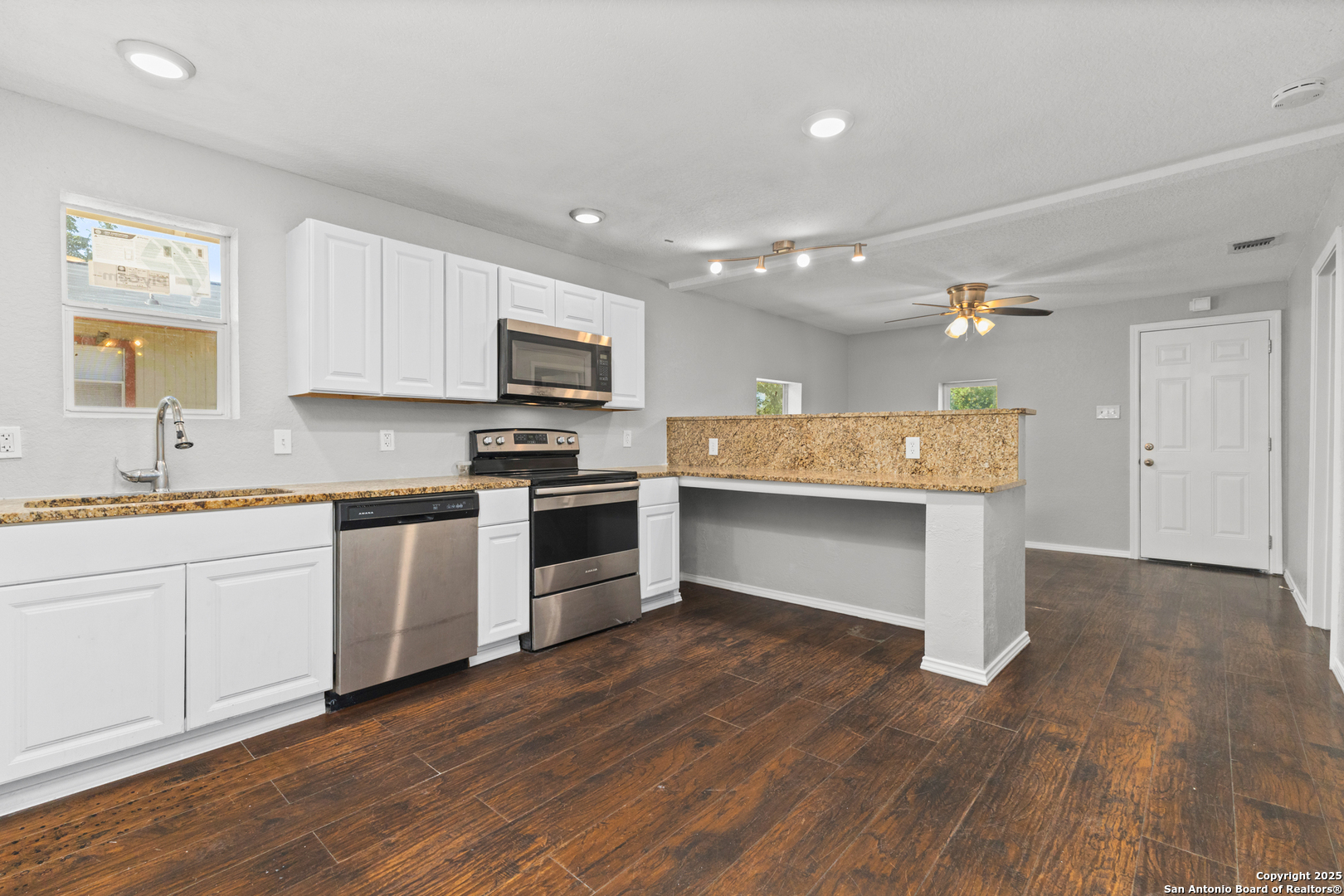 *Owner Financing available*Fresh interior paint!! Just minutes from downtown San Antonio, this updated 3-bedroom, 2-bath home offers 1,306 square feet of comfortable living with an open floor plan. The kitchen features granite countertops, stainless steel appliances, and generous cabinet space, while both bathrooms feature matching granite finishes for a cohesive design. The primary suite includes a walk-in closet and a private bathroom with a shower. A 2-car attached carport provides convenient covered parking, and the low-maintenance yard features a spacious patio slab, perfect for entertaining or future expansion. Ideally located near major highways, the airport, shopping, dining, and entertainment.
