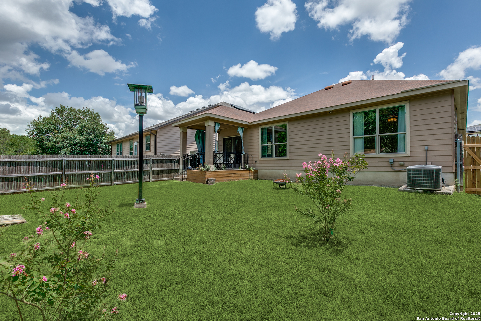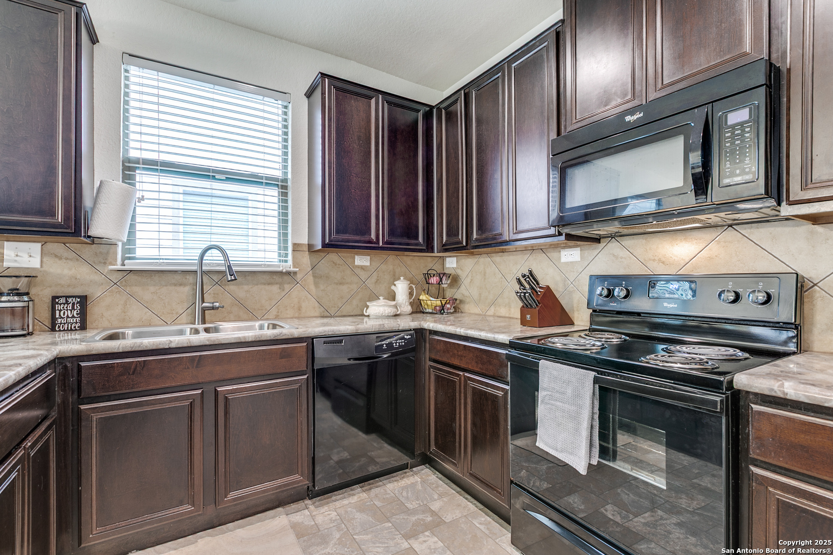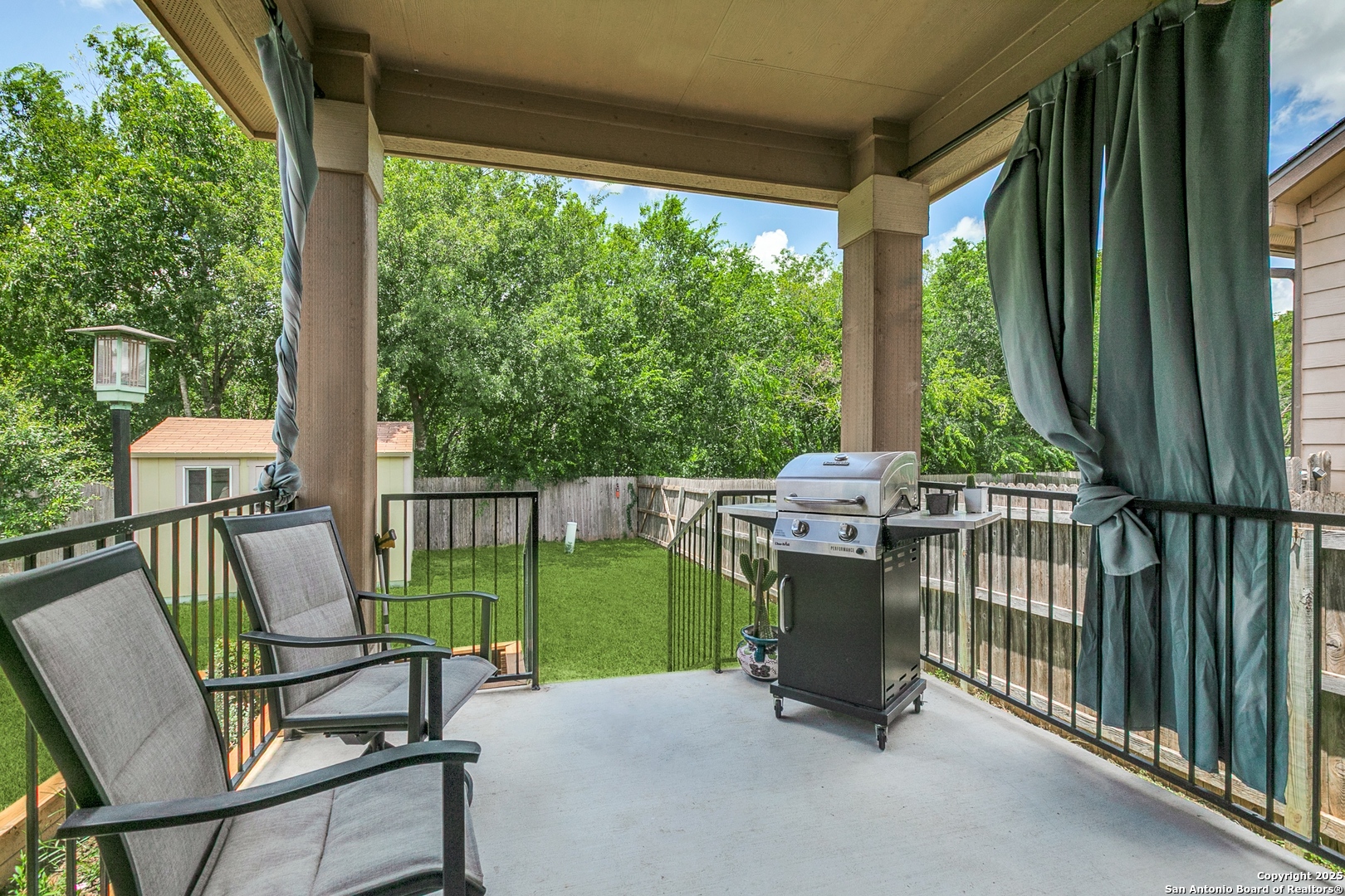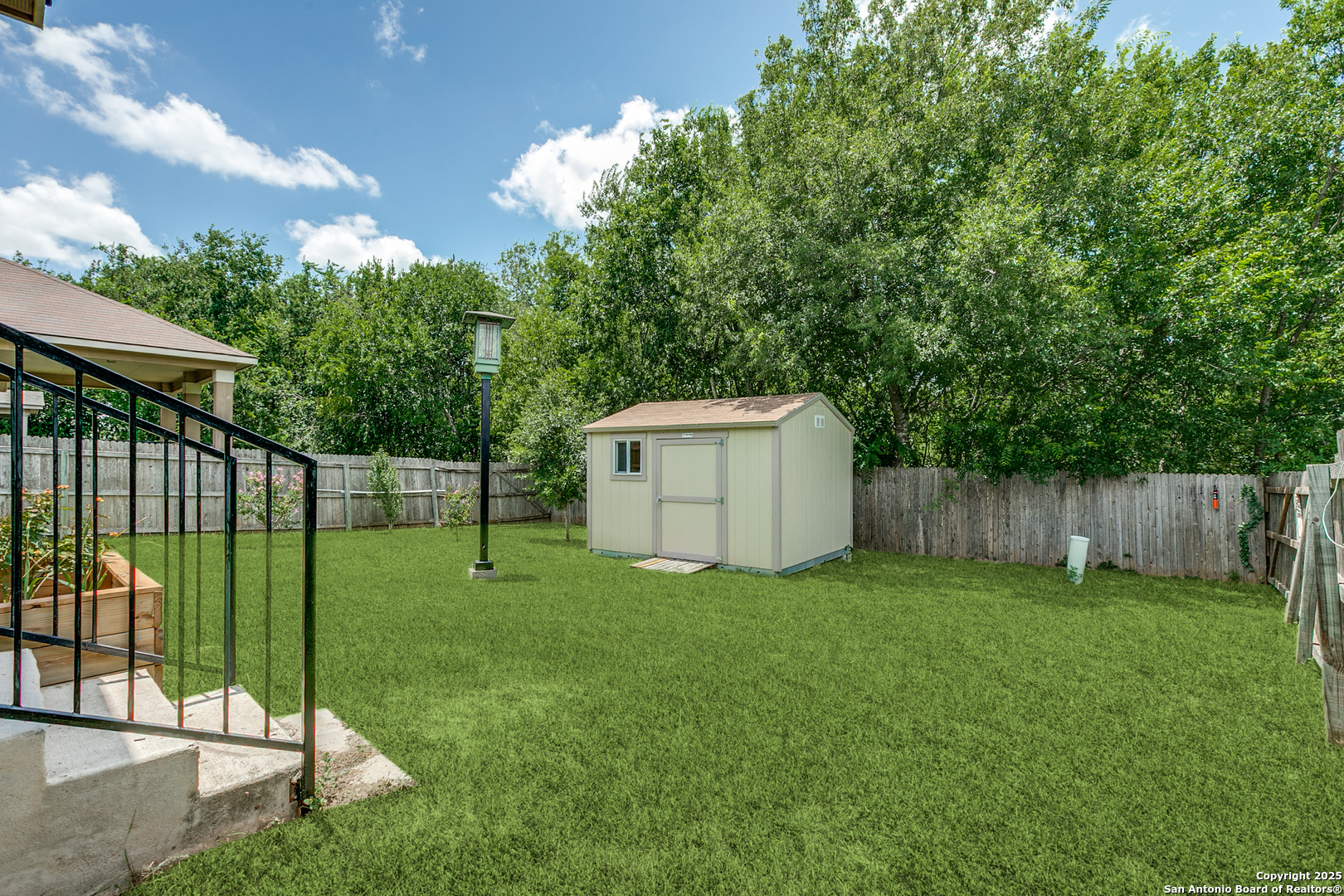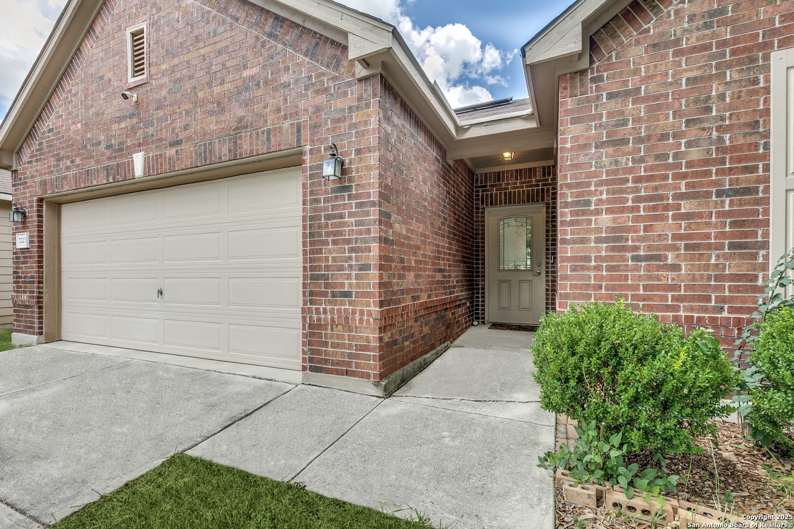 Welcome to this beautiful one story home, privately situated on a greenbelt in the Northeast Crossing community. This floorplan features 3 bedrooms, 2 bathrooms, and a versatile flex room that can be used as an office or game room. The open layout feels both spacious and inviting - perfect for entertaining, and complete with a surround sound system and built-in ceiling speakers. The kitchen offers ample storage and counter space, with a walk-in pantry, 42" espresso cabinets, a large island, and matching appliances...refrigerator included! Carpet was replaced in 2024, along with updated bathroom flooring, fresh paint throughout, and a new roof in 2023. The laundry room conveniently includes the washer and dryer, and the home also comes equipped with a security system featuring front and back cameras, plus solar panels for utility cost savings. Relax and unwind outside on the covered patio and enjoy the added privacy of no backyard neighbors, along with a backyard shed for extra storage space. This home is move-in ready, schedule your showing today!