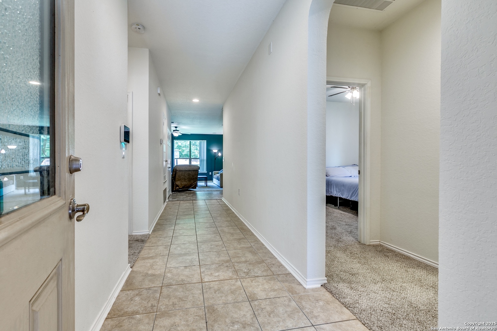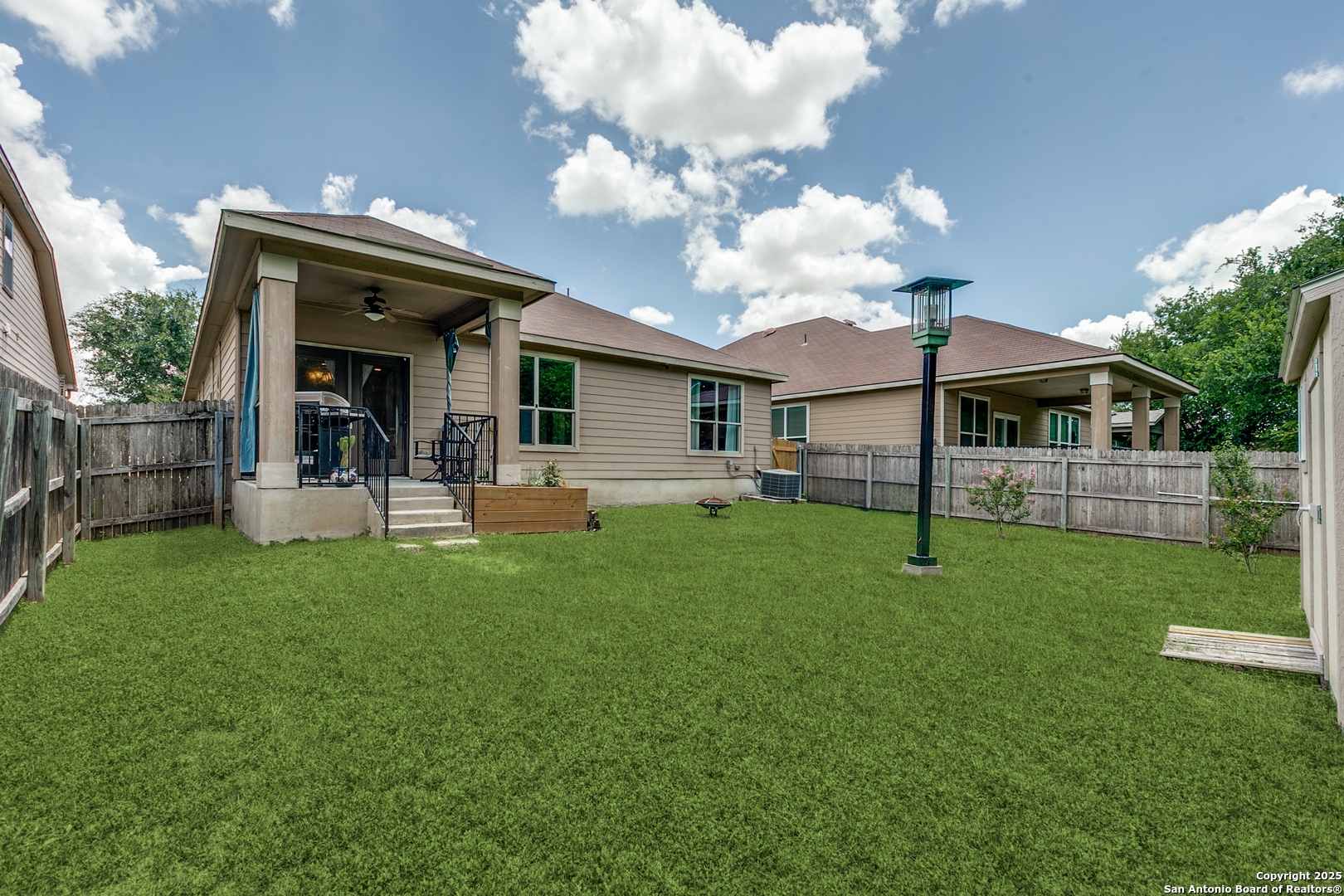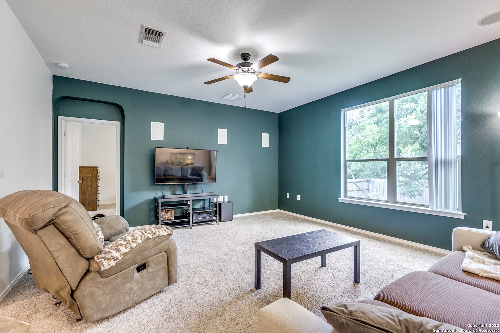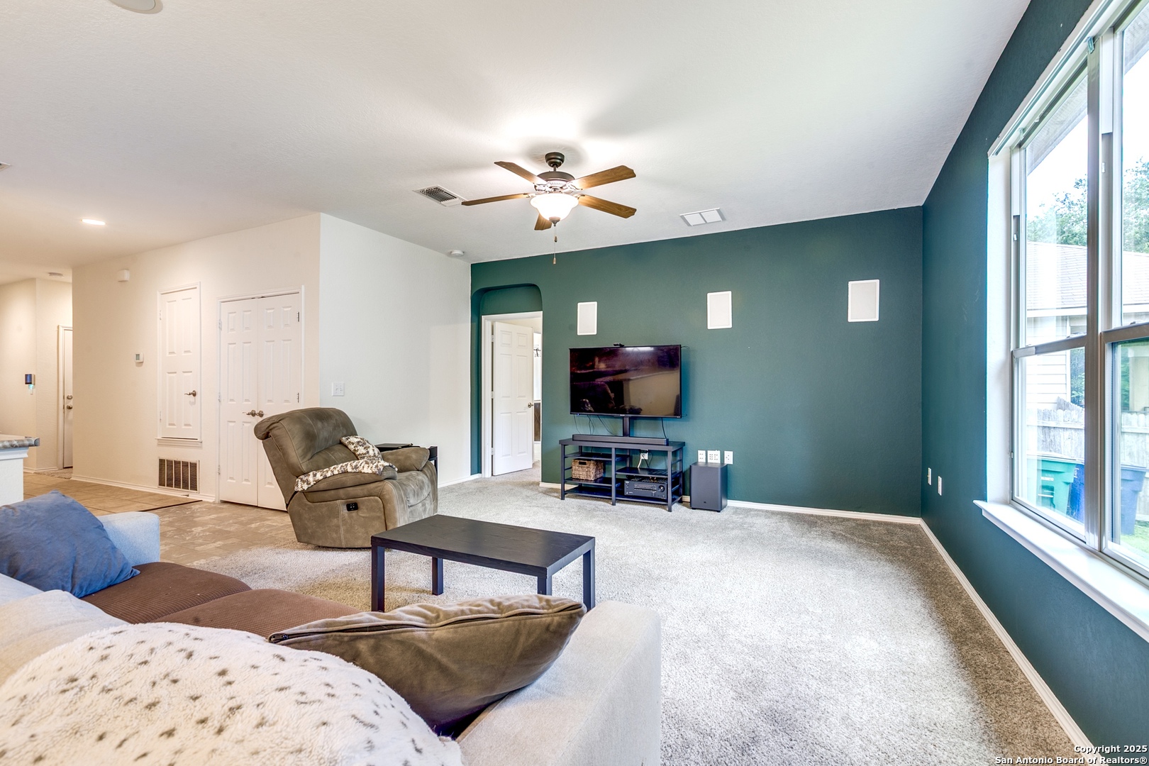 Welcome to this beautiful one story home, privately situated on a greenbelt in the Northeast Crossing community. This floorplan features 3 bedrooms, 2 bathrooms, and a versatile flex room that can be used as an office or game room. The open layout feels both spacious and inviting - perfect for entertaining, and complete with a surround sound system and built-in ceiling speakers. The kitchen offers ample storage and counter space, with a walk-in pantry, 42" espresso cabinets, a large island, and matching appliances...refrigerator included! Carpet was replaced in 2024, along with updated bathroom flooring, fresh paint throughout, and a new roof in 2023. The laundry room conveniently includes the washer and dryer, and the home also comes equipped with a security system featuring front and back cameras, plus solar panels for utility cost savings. Relax and unwind outside on the covered patio and enjoy the added privacy of no backyard neighbors, along with a backyard shed for extra storage space. This home is move-in ready, schedule your showing today!