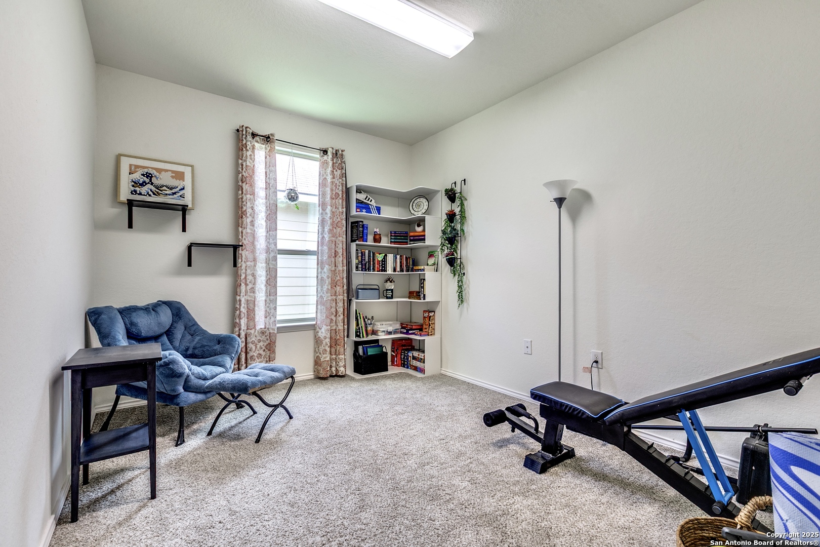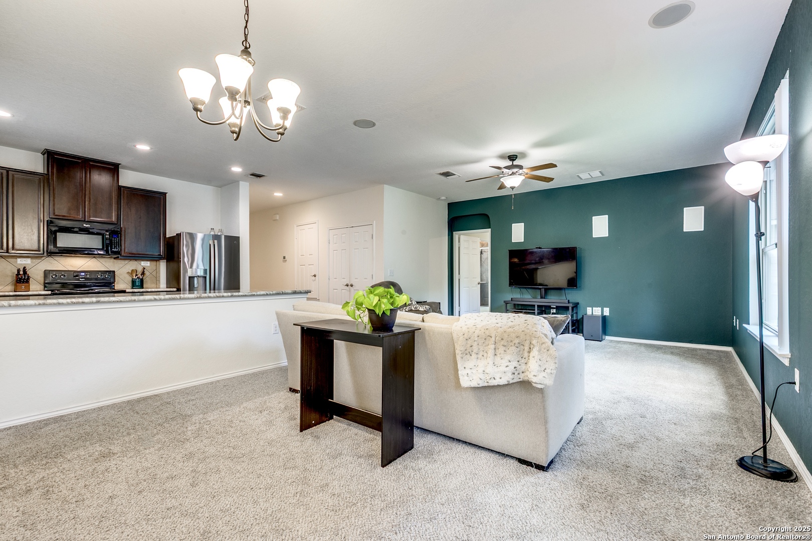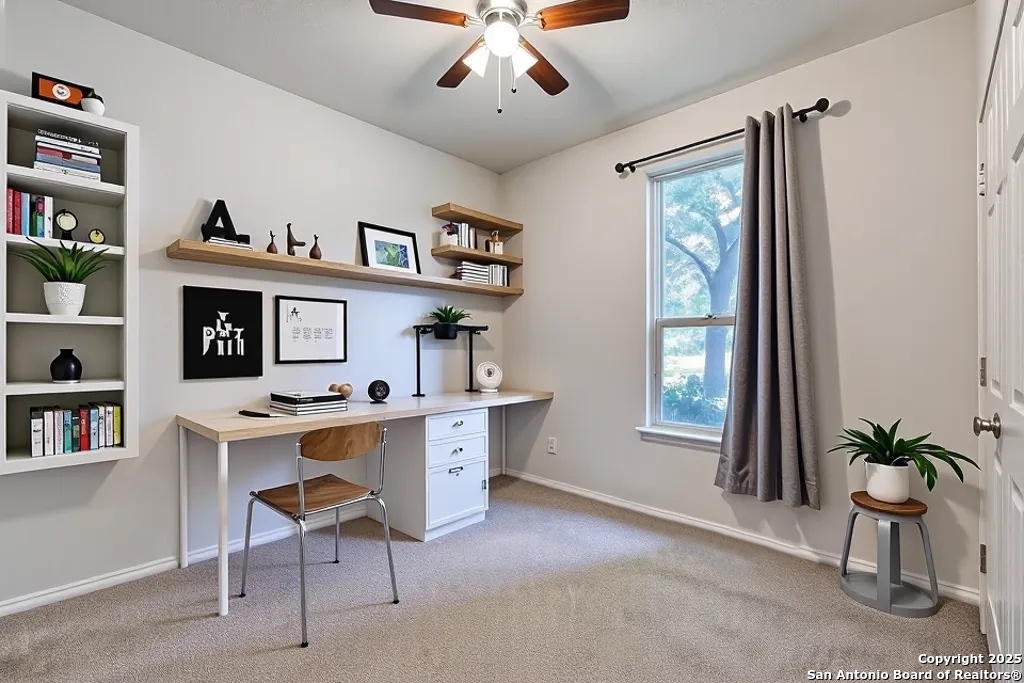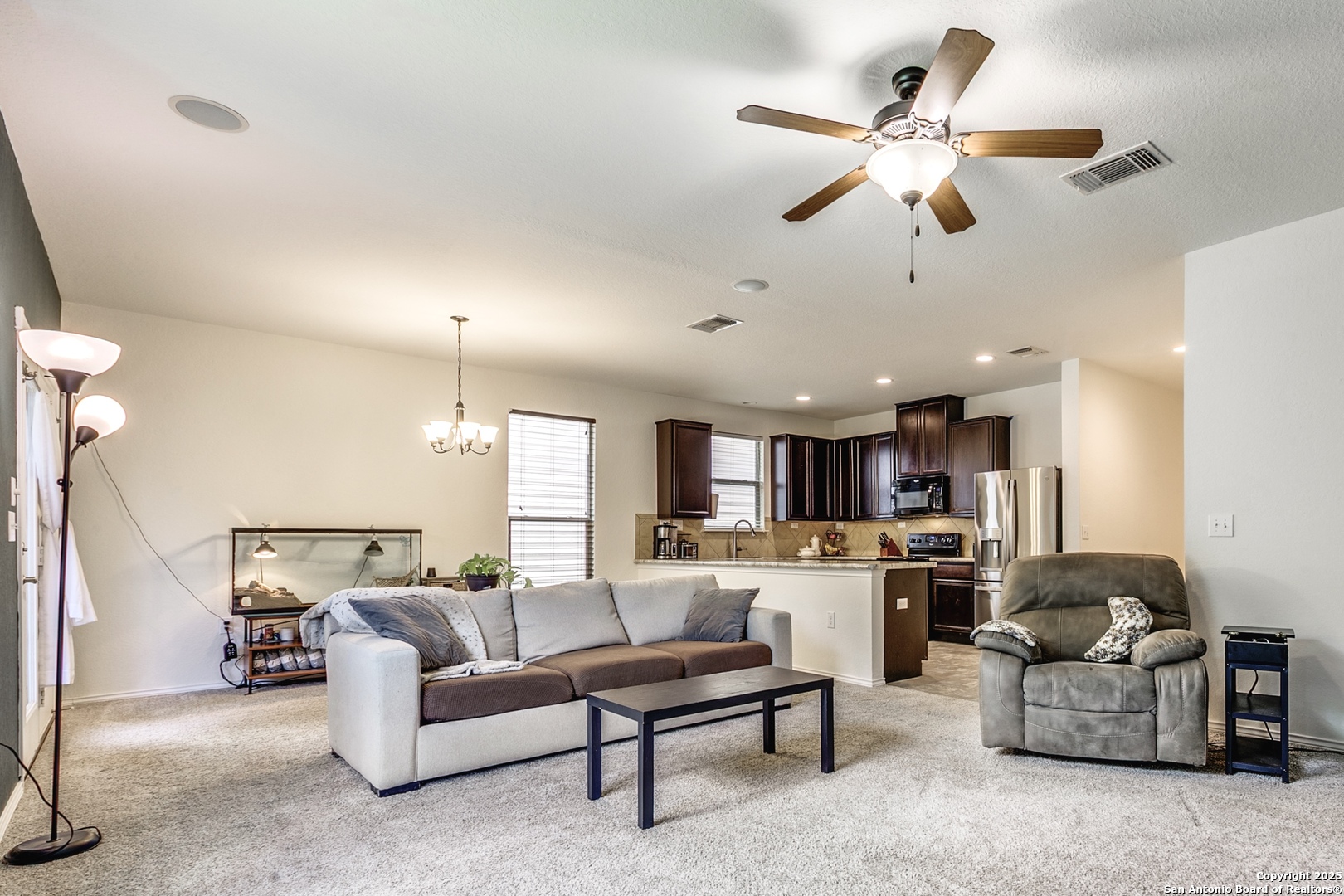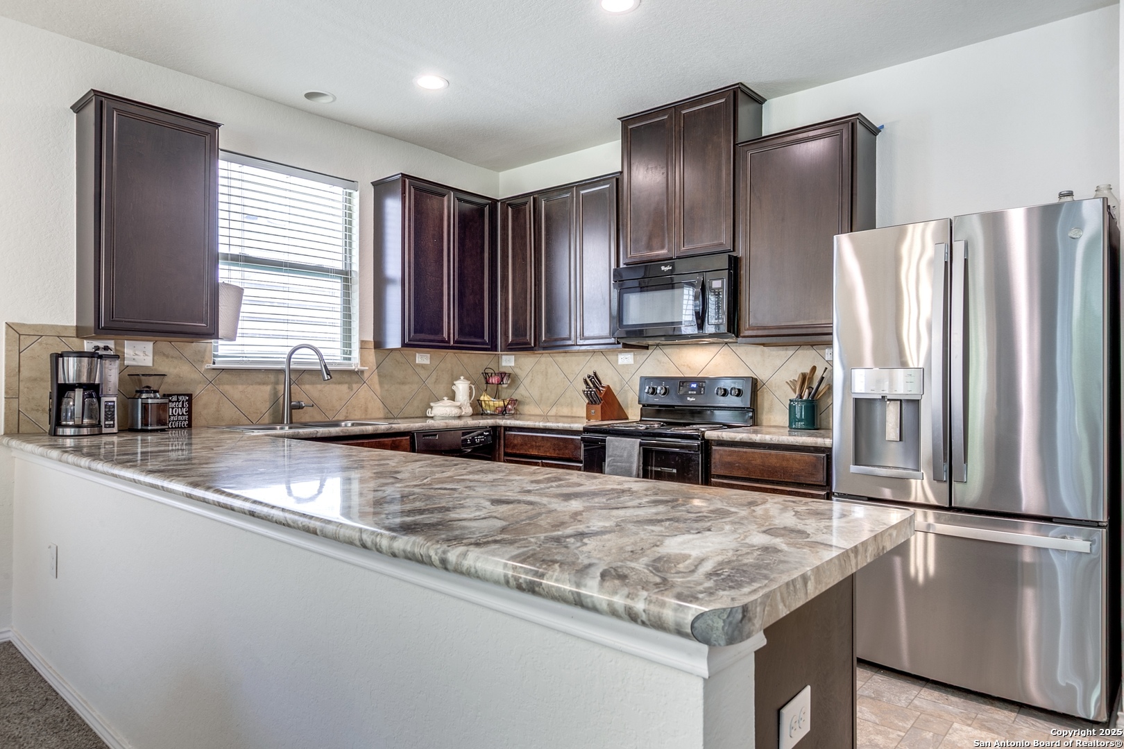 Welcome to this beautiful one story home, privately situated on a greenbelt in the Northeast Crossing community. This floorplan features 3 bedrooms, 2 bathrooms, and a versatile flex room that can be used as an office or game room. The open layout feels both spacious and inviting - perfect for entertaining, and complete with a surround sound system and built-in ceiling speakers. The kitchen offers ample storage and counter space, with a walk-in pantry, 42" espresso cabinets, a large island, and matching appliances...refrigerator included! Carpet was replaced in 2024, along with updated bathroom flooring, fresh paint throughout, and a new roof in 2023. The laundry room conveniently includes the washer and dryer, and the home also comes equipped with a security system featuring front and back cameras, plus solar panels for utility cost savings. Relax and unwind outside on the covered patio and enjoy the added privacy of no backyard neighbors, along with a backyard shed for extra storage space. This home is move-in ready, schedule your showing today!