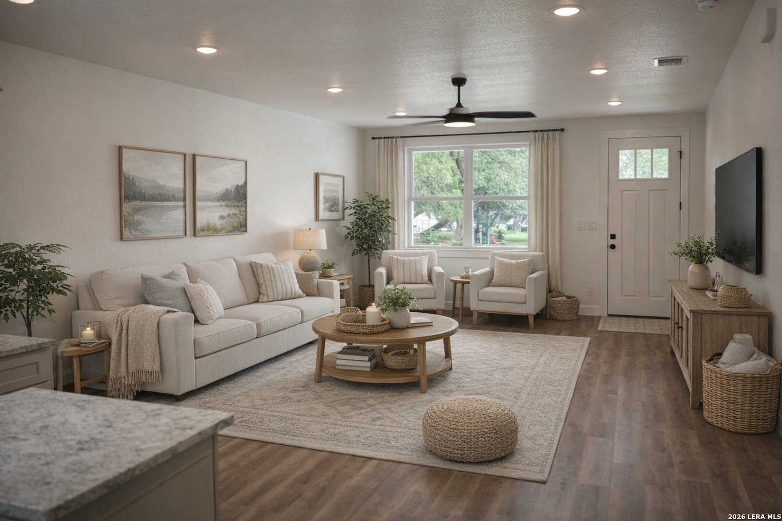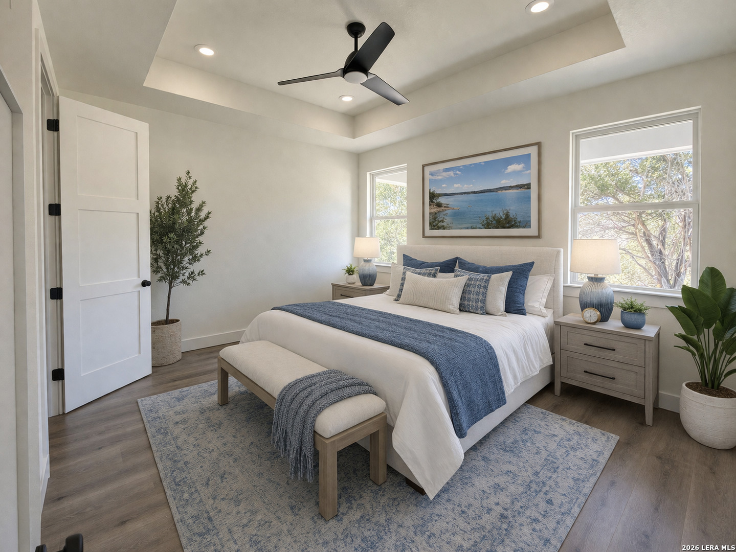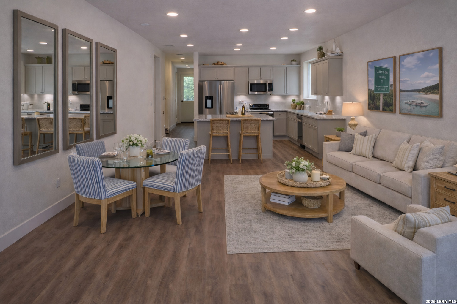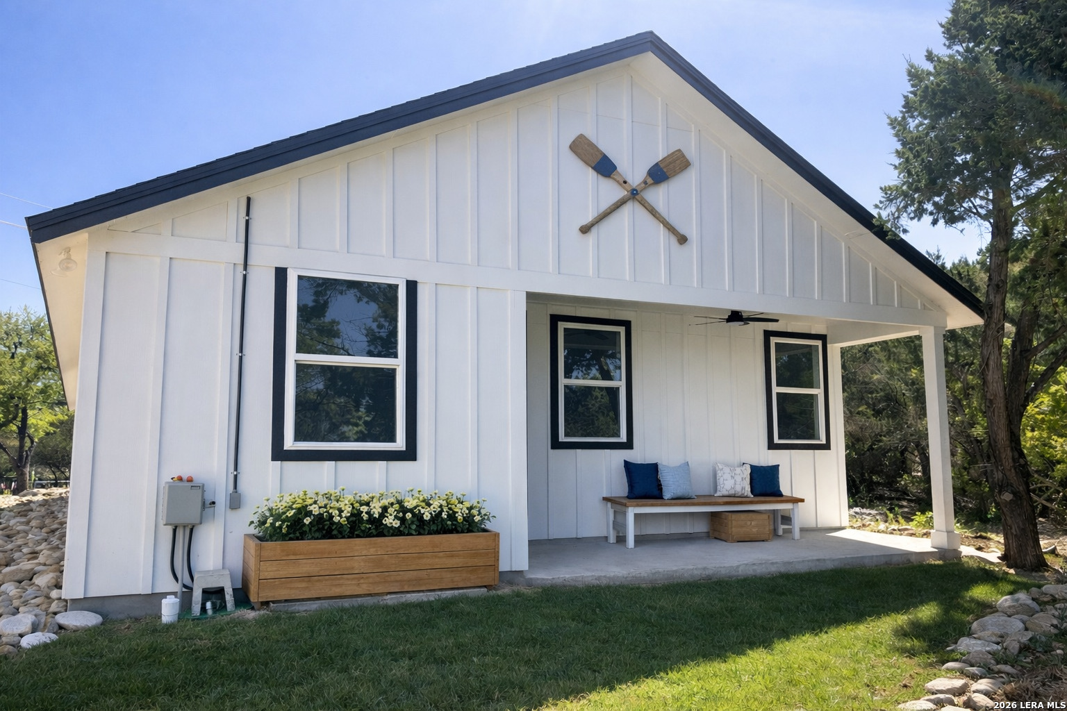 A rare opportunity to own this move-in-ready home that combines comfort, style, and location. Light, bright, and beautifully designed single-story Craftsman-Style lake cottage in the heart of the Texas Hill Country perfectly positioned between San Antonio and Austin near Canyon Lake. Thoughtfully styled with a clean, airy feel and designer touches throughout, this home offers easy, low-maintenance living ideal for downsizers, investors, second-home buyers, or first-time homeowners. The open-concept layout features a spacious kitchen with new stainless steel appliances, ample cabinet storage, a walk-in pantry, and a large island with breakfast bar seating perfect for everyday living or casual entertaining. Upgraded gold fixtures add a warm and modern touches throughout the kitchen and baths, while the primary suite includes a walk-in shower with a rain head, granite countertops, and dual vanities. Function meets convenience with an interior laundry room, a dedicated drop zone with built-in seating and storage, and an insulated attached garage wired for a mini-split system. The home is also pre-wired for security cameras. Enjoy peaceful Hill Country living from both the covered front and rear porches. The private backyard backs to mature trees and seasonal creek with no rear neighbor, creating a quiet tranquil setting. Located in the Canyon Lake Forest community with low POA dues of just $75 per year include access to a clubhouse, pool, playground, and BBQ/picnic areas.