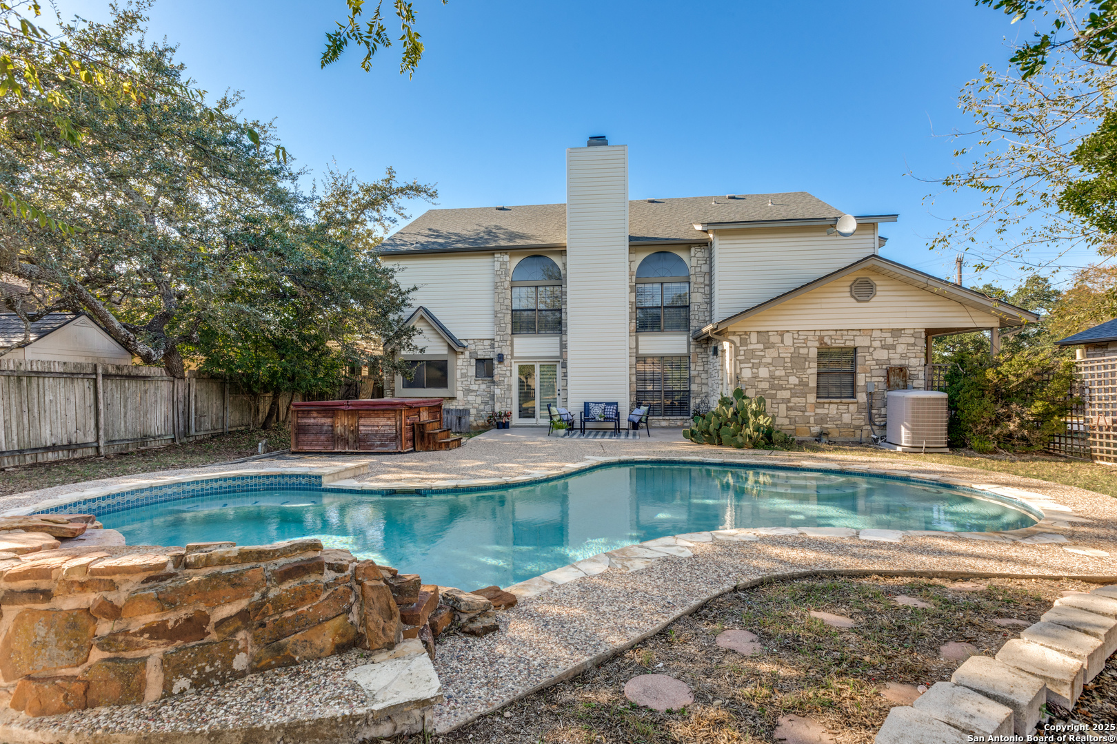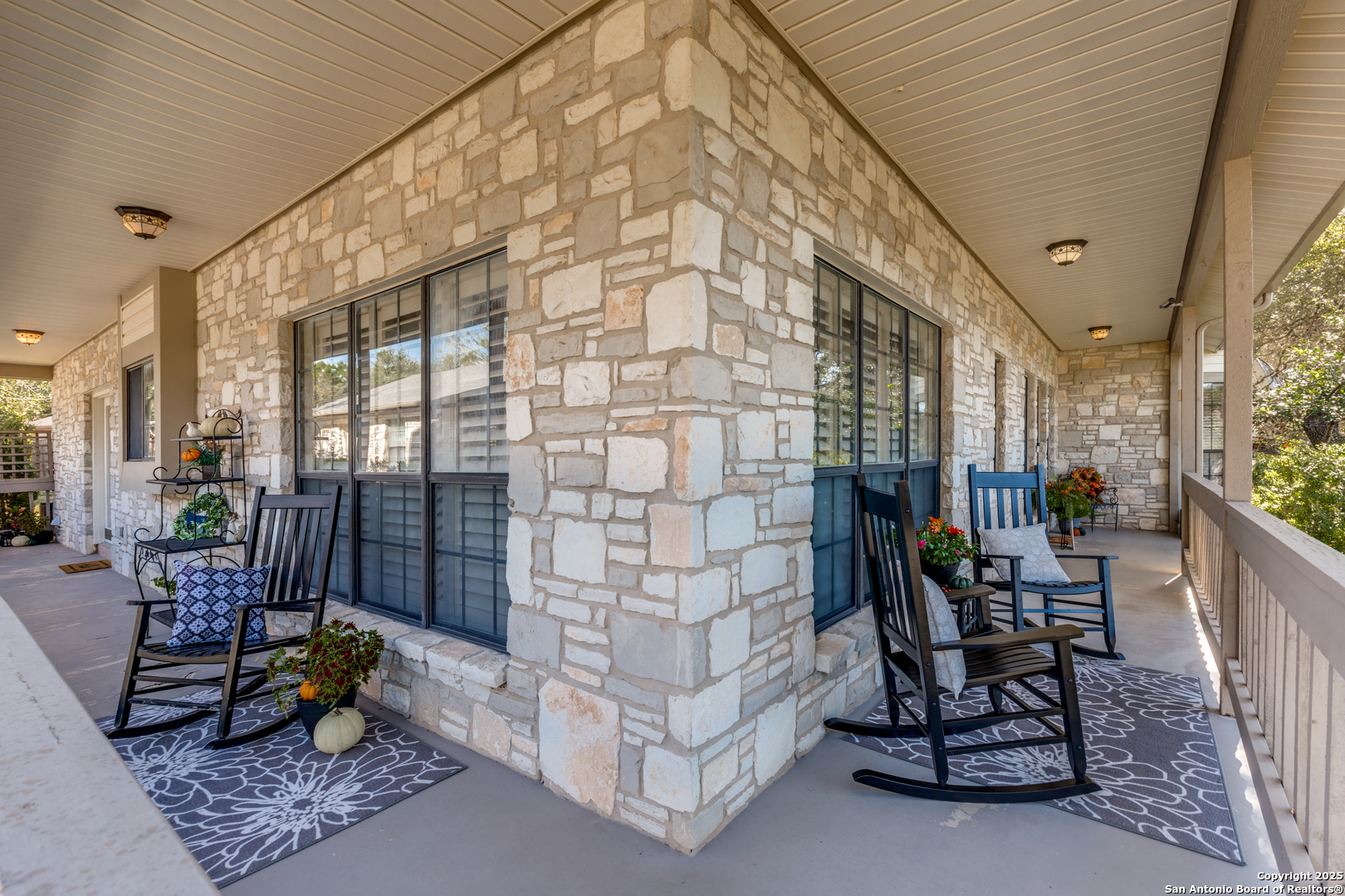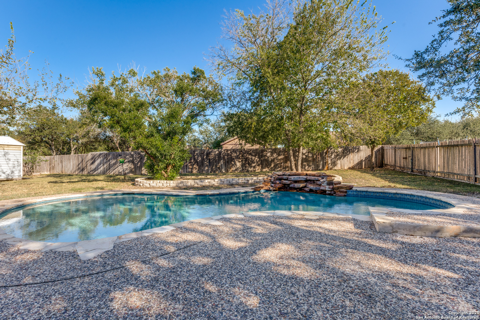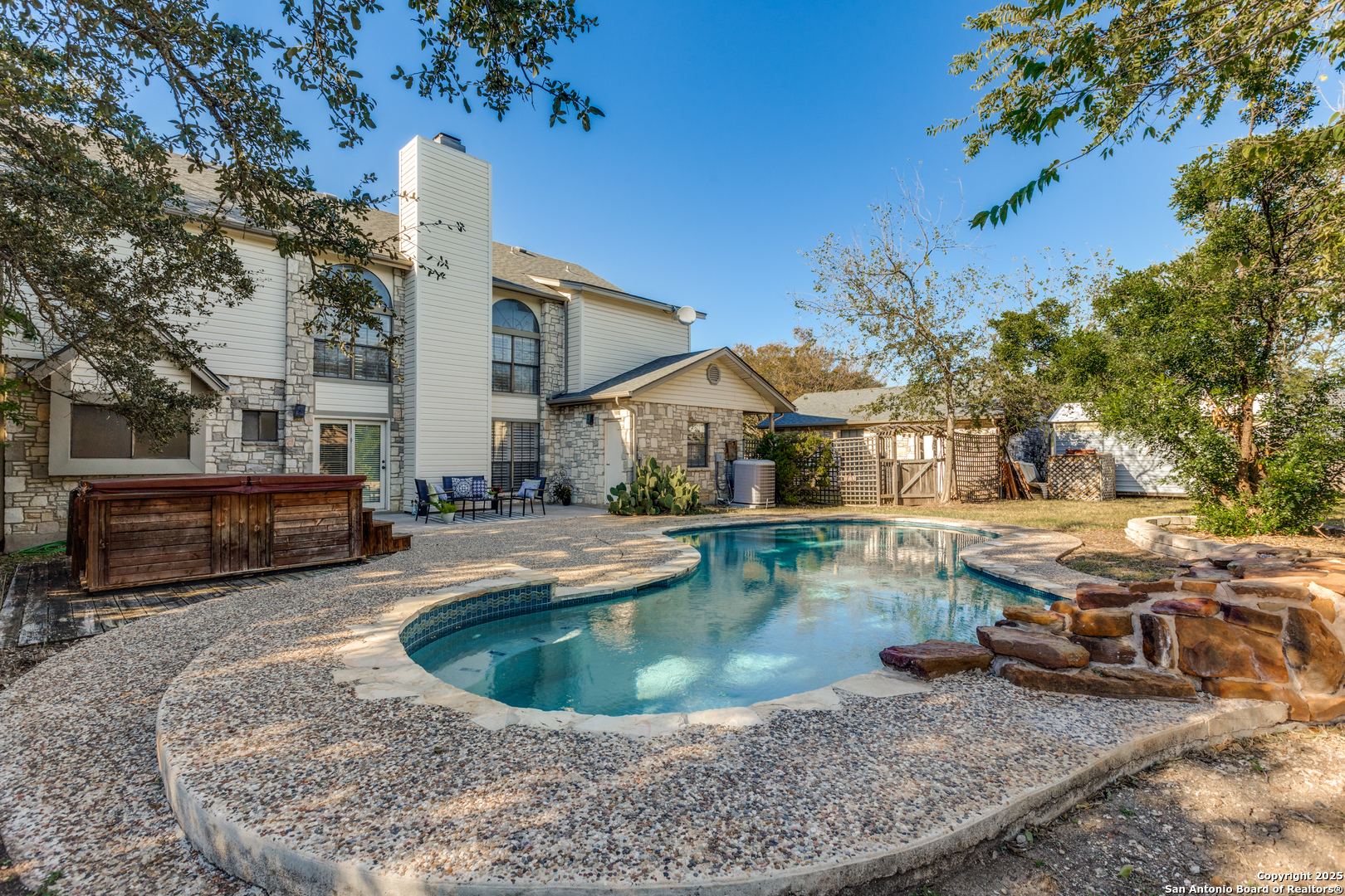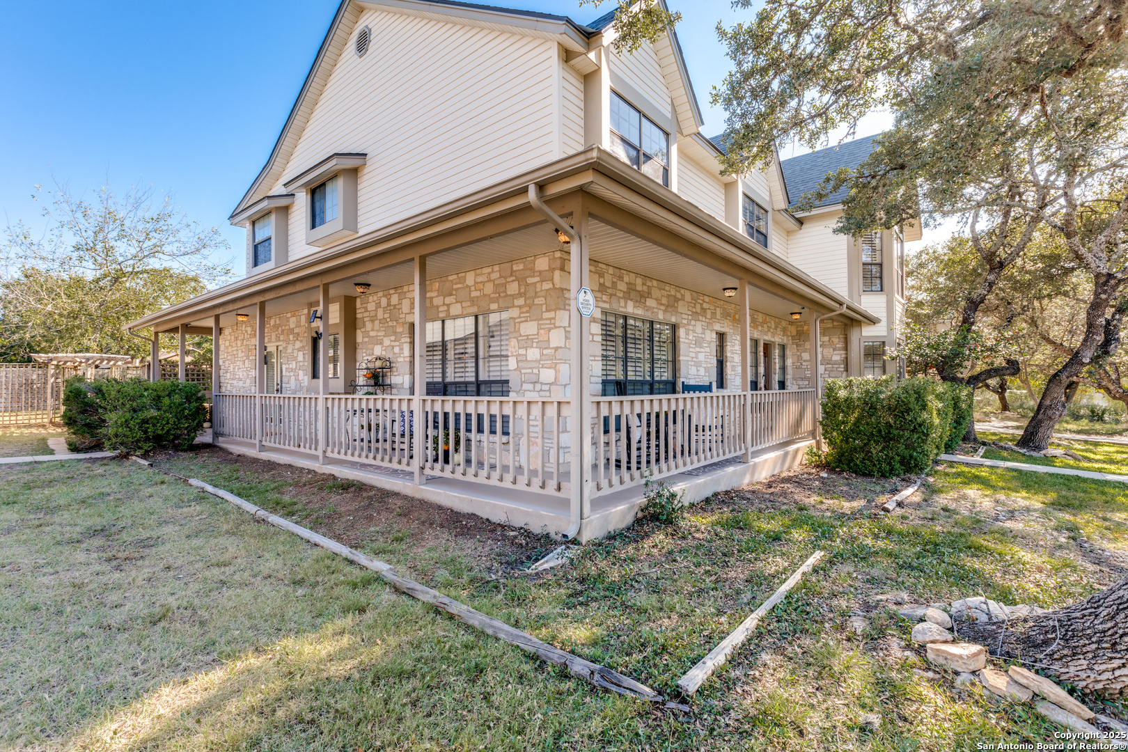 Nestled in the sought-after Timberwood Park neighborhood, this stunning home offers a perfect blend of Hill Country charm & peaceful suburban living-all w/ no city taxes! Resting on nearly half an acre (.47 acres), this spacious 4-bedroom, 2.5-bath home spans 3,053 sq.ft. & features a warm, inviting design both inside & out, accented w/a welcoming wraparound porch. Step inside to an oversized open living room anchored by a beautiful rockfireplace & enhanced by architectural details. Plantation shutters & custom woodwork throughout the home adds to its warmth and appeal.The large island kitchen is a chef's delight, complete w/expansive countertops, custom cabinetry, a breakfast nook, & walk-in pantry. A separate dining room just off the kitchen provides the perfect setting for family gatherings.The spacious primary suite, located on the main floor, includes a private bath w/ separate walk-in shower, garden tub, & a generous closet. Upstairs, you'll find 3 additional bedrooms, including one of the oversized bedrooms w/ an attached bonus room-ideal for a playroom, office, gym. Custom built-in bookcases located in a wide hallway w/open railing overlooks the living area and adds to the home's distinctive character.The backyard retreat features an in-ground pool w/ waterfall, a freestanding hot tub, storage shed and plenty of space for entertaining or relaxing under the Texas sky. Residents of Timberwood Park enjoy a host of neighborhood amenities,including swimming pool, golf course, stocked catch-and-release lake, pickleball courts,and community events such as open-air concerts in the park...just to name a few. Experience the best of Hill Country serenity w/city conveniences near by.