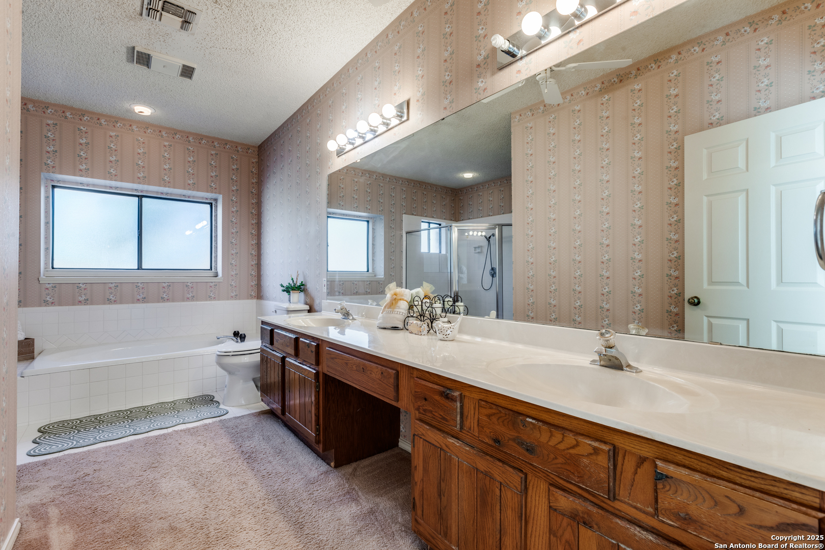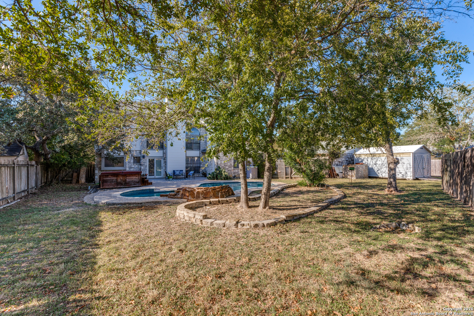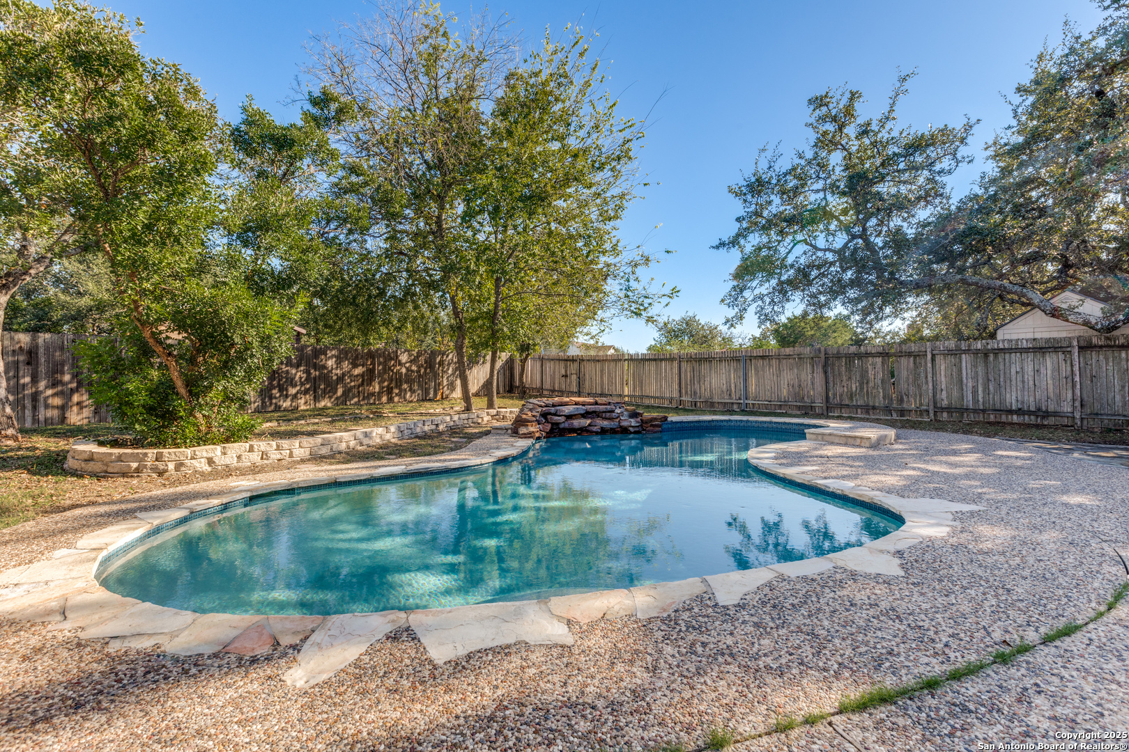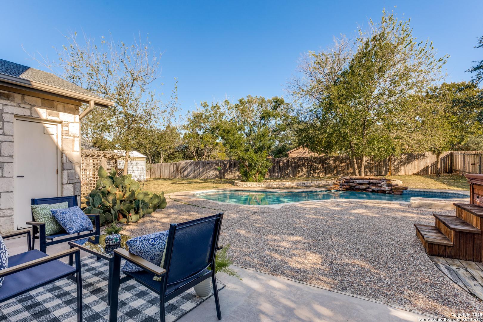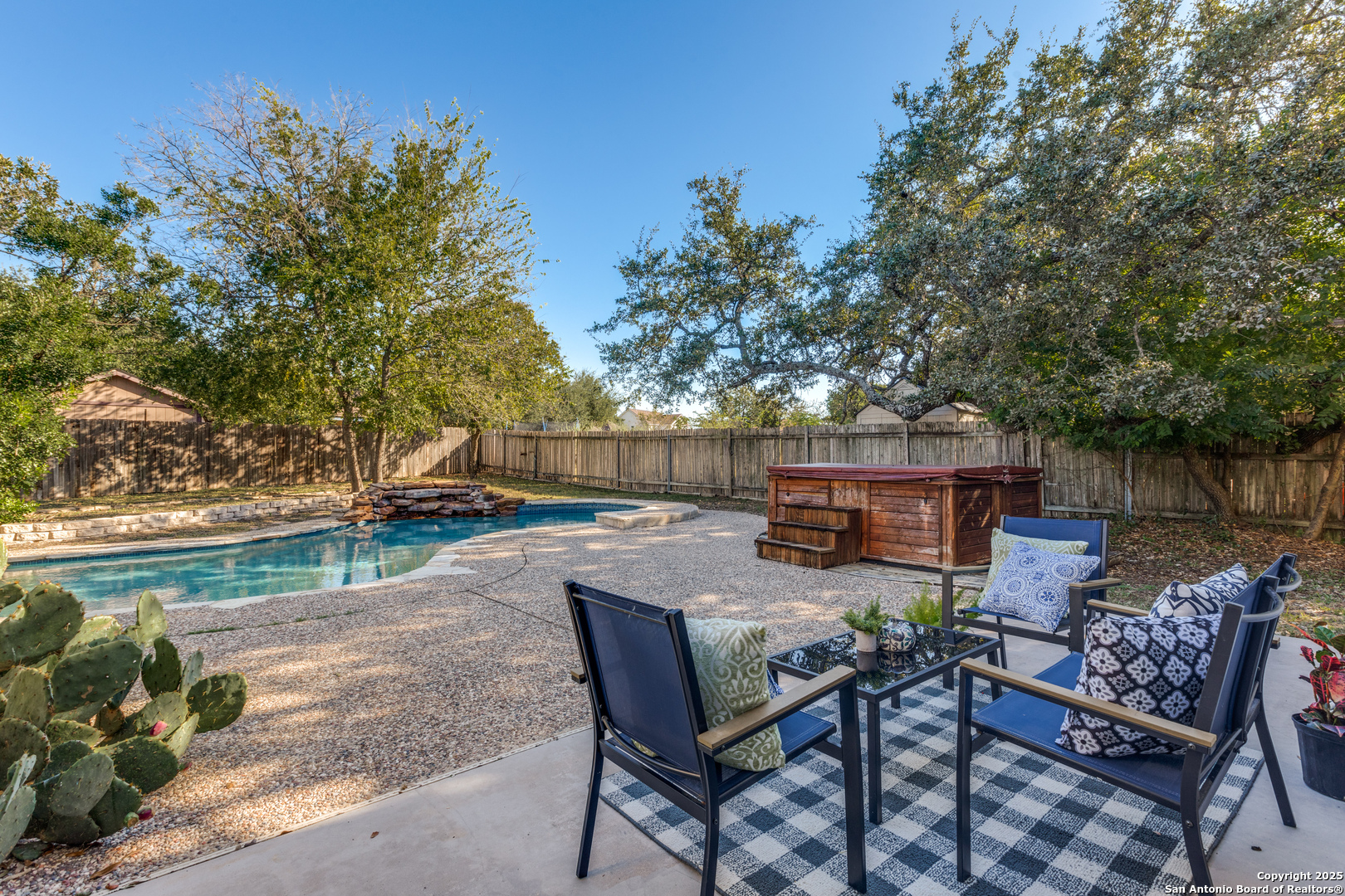 Nestled in the sought-after Timberwood Park neighborhood, this stunning home offers a perfect blend of Hill Country charm & peaceful suburban living-all w/ no city taxes! Resting on nearly half an acre (.47 acres), this spacious 4-bedroom, 2.5-bath home spans 3,053 sq.ft. & features a warm, inviting design both inside & out, accented w/a welcoming wraparound porch. Step inside to an oversized open living room anchored by a beautiful rockfireplace & enhanced by architectural details. Plantation shutters & custom woodwork throughout the home adds to its warmth and appeal.The large island kitchen is a chef's delight, complete w/expansive countertops, custom cabinetry, a breakfast nook, & walk-in pantry. A separate dining room just off the kitchen provides the perfect setting for family gatherings.The spacious primary suite, located on the main floor, includes a private bath w/ separate walk-in shower, garden tub, & a generous closet. Upstairs, you'll find 3 additional bedrooms, including one of the oversized bedrooms w/ an attached bonus room-ideal for a playroom, office, gym. Custom built-in bookcases located in a wide hallway w/open railing overlooks the living area and adds to the home's distinctive character.The backyard retreat features an in-ground pool w/ waterfall, a freestanding hot tub, storage shed and plenty of space for entertaining or relaxing under the Texas sky. Residents of Timberwood Park enjoy a host of neighborhood amenities,including swimming pool, golf course, stocked catch-and-release lake, pickleball courts,and community events such as open-air concerts in the park...just to name a few. Experience the best of Hill Country serenity w/city conveniences near by.