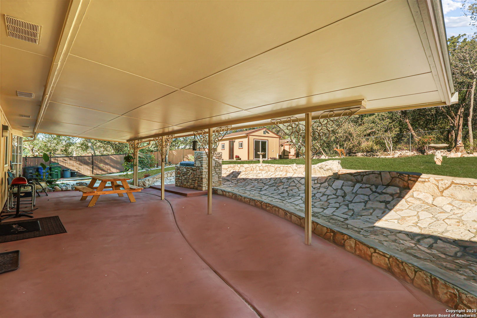 This beautifully remodeled 3-bedroom, 2-bathroom home, completed in the beginning of 2025, is set on a generous 0.4-acre lot. With 1,866 square feet of thoughtfully designed living space. Plus a detached quarters of 288 sqft equipped with electric and AC/heat , perfect for an office or game room. The spacious master suite features double closets and an elegantly updated bathroom. The dream kitchen boasts modern appliances with gas cooking, solid surface countertops, and open to the breakfast and dinning room allowing for great entertainment. Lastly the kitchen is complemented by a lovely large window overlooking the serene backyard. Luxury laminate added through out the home. The exterior showcases a nice landscaped yard with a rock retaining wall and a built-in barbecue, ideal for outdoor entertaining. Additionally, there's two sheds. Retractable fence good for a dog run. Parking is convenient with a covered carport alongside a spacious two-car garage featuring AC/heat and an epoxy floor. A privacy fence on one side and a rod iron fence for the rest with an electric rod iron gate at the front to ensure a secluded atmosphere. The home also benefits from a voluntary HOA offering access to a community pool and park with a playground, all while being centrally located near shopping areas like La Cantera and The Rim, as well as restaurants. This sought-after area is known for its tranquil environment and convenient amenities, making this home truly impressive.