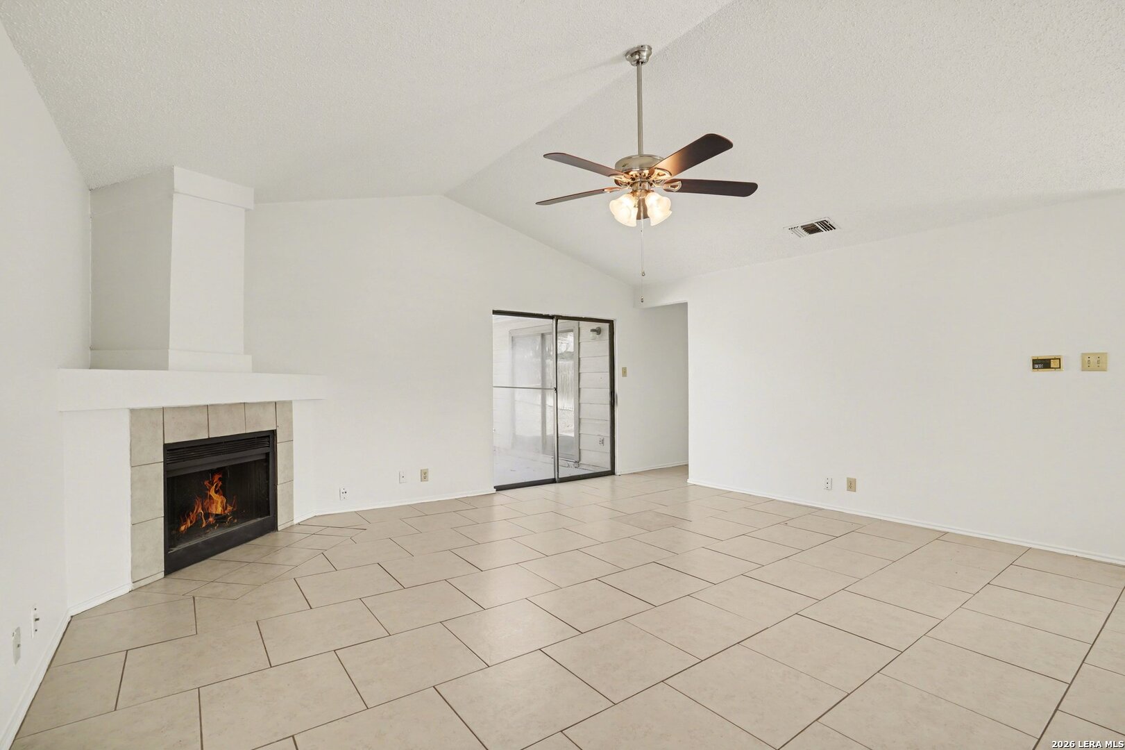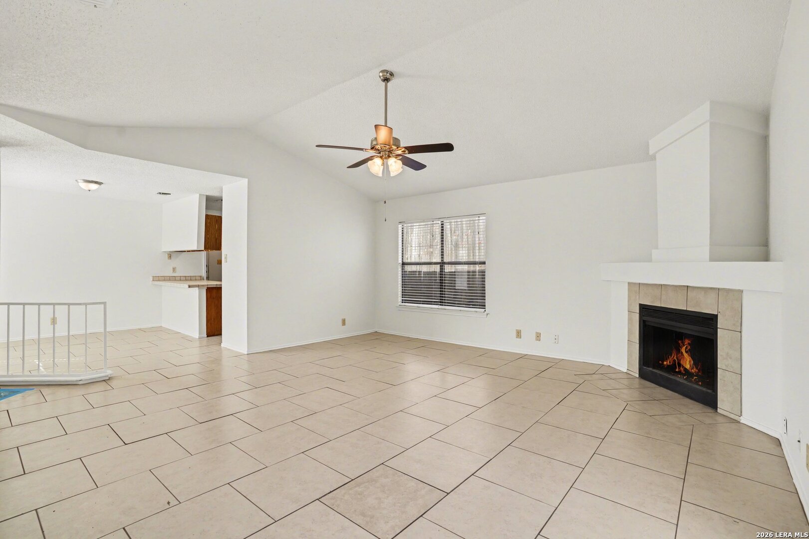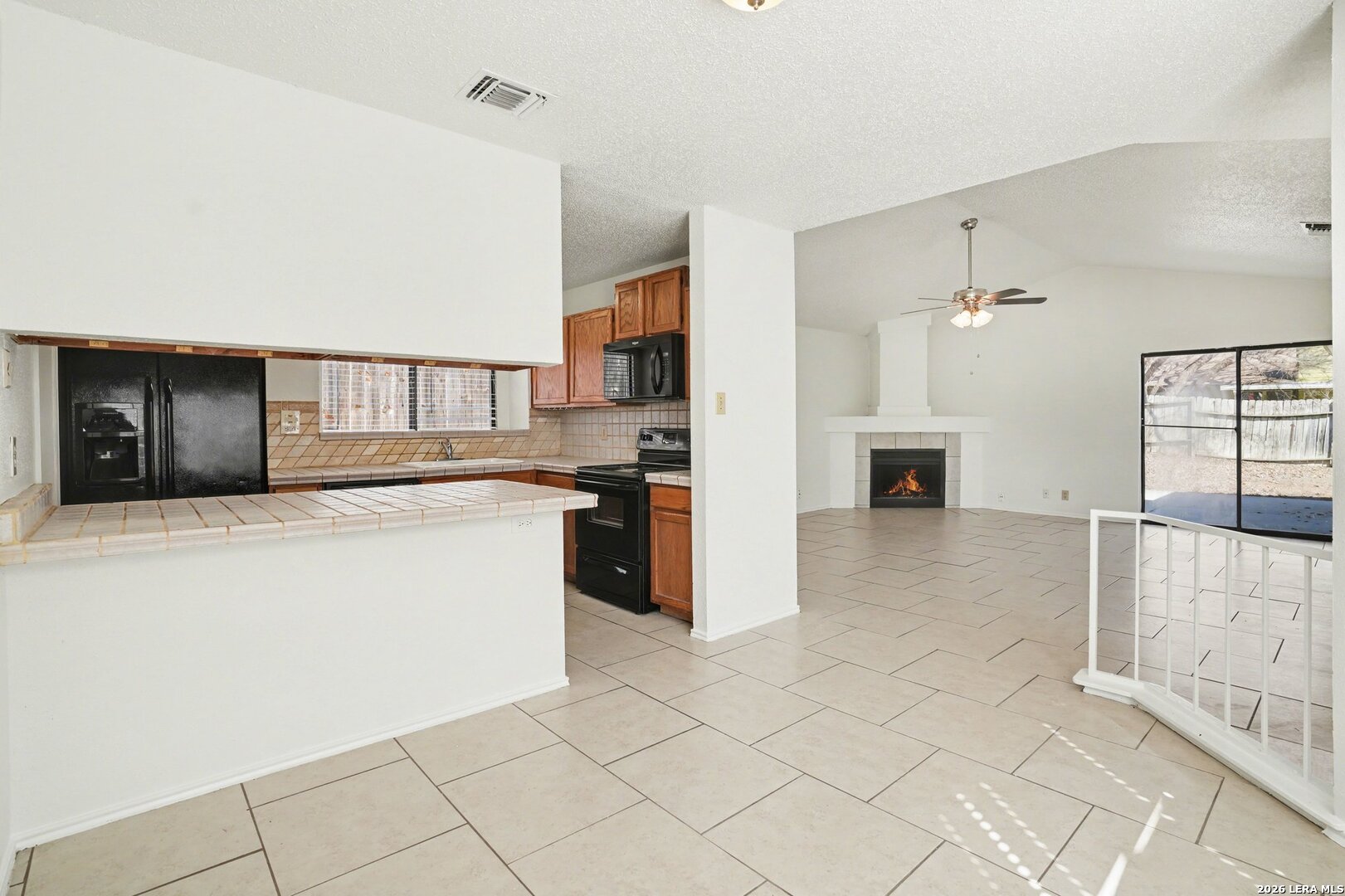This 3-bedroom, 2-bathroom single-story home features a classic brick and hardy exterior, an attached two-car garage, and a relaxing back porch patio. The interior offers an inviting open-concept layout defined by vaulted ceilings and a cozy wood-burning fireplace in the family room, which flows seamlessly into the dining area and kitchen. While the home boasts a functional floor plan with a private primary en suite and a kitchen equipped with black appliances in good working condition, it requires some repairs to restore its full charm. Finished with a blend of tile and carpeting, this residence represents an excellent opportunity for a buyer or investor to add personal touches and build immediate equity in a home with strong architectural bones.
