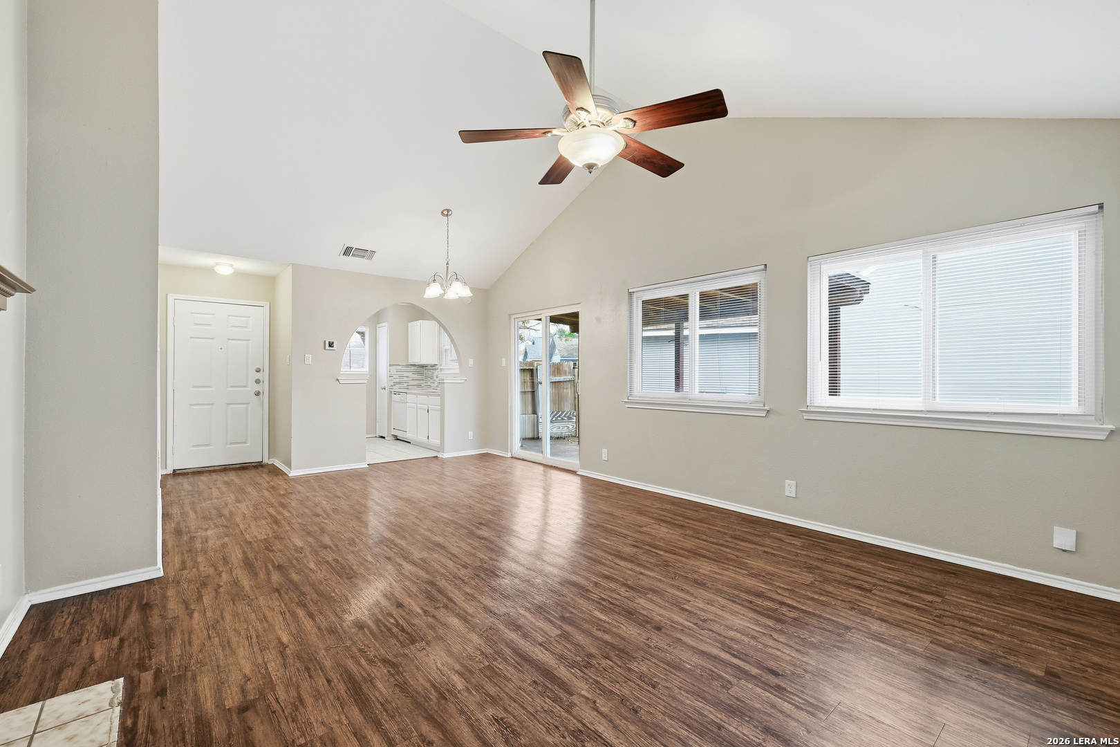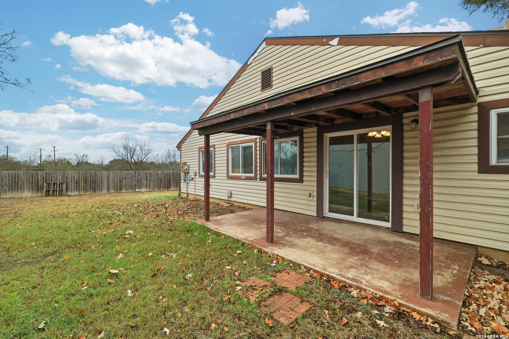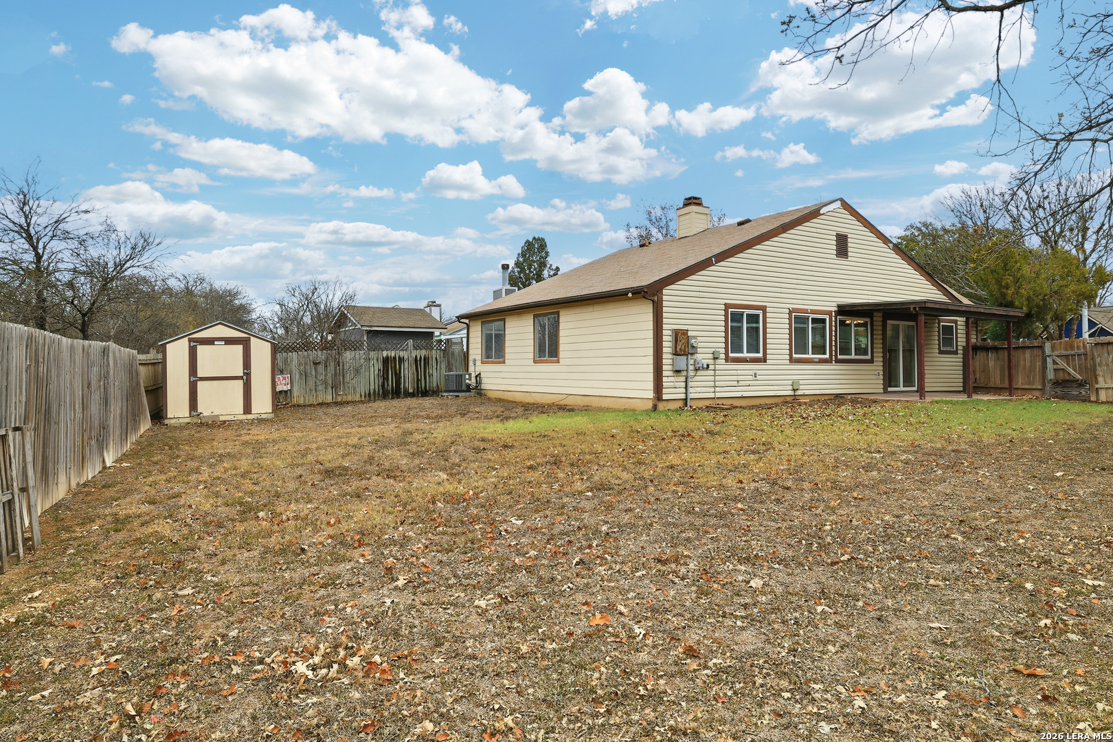 Single-story residence located in the Northwest Crossing subdivision with convenient access to Loop 1604, Culebra Road, the 151 Business Corridor, and I-10. Step inside to vaulted ceilings in the main living space, creating an open and airy atmosphere. The tiled, wood-burning fireplace serves as a striking focal point in the living room. The kitchen comes complete with a refrigerator for easy move-in, and durable vinyl flooring flows throughout the main living areas and all bedrooms-there is no carpet anywhere in this beautifully maintained home. Each of the three bedrooms features its own walk-in closet, offering excellent storage throughout. The primary bedroom includes a ceiling fan and a full en suite bath for added comfort. Outside is where this home truly stands out. Relax on the covered patio and take in the extra-large backyard, complete with a storage shed and serene greenbelt views for added privacy. This inviting retreat is move-in ready and waiting for its next resident.