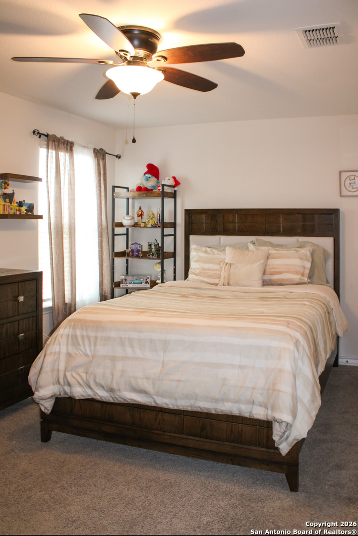 WELCOME TO THIS BEAUTIFUL MAINTAINED HOME! This home perfectly blends, comfort, functionality, and timeless appeal. Here in San Antonio, this home has a spacious and inviting-5-bedroom, 2.5 bath home. Designed for comfort and entertaining. This beautiful property features a sparkling swimming pool, with a deep-set, covered porch. An entrance that opens to a foyer, a formal dining room, and spacious kitchen lined with abundant cabinet counterspace. Classic white subway tile backsplash is a perfect accent. The large kitchen island faces the family room. The private main bedroom suite is located off the family room and features a separate tub and shower, double vanity sinks, ceramic tile flooring, private water closet and large walk-in closet. A downstairs utility room is located off the entry foyer and storage space is located under the stairs. The second floor includes a versatile loft area with plenty of features include 9-foot ceilings, 2-inch blinds throughout the home, luxury vinyl plank flooring in entryway, family room, kitchen, and dining room, ceramic tile at all bathrooms and utility room, pre-plumb for water softener loop, and full backyard with a newly put swimming pool, also with a two-car garage, and plenty of room for family, guests to host, or a space for a home office setup. Enjoy two open living spaces, and this home has a loft upstairs for entertaining, and a backyard perfect for relaxing or hosting gatherings. Don't miss the opportunity to make this incredible home yours! The Community Features: Playground, Jogging trails, Bike trails, BBQ/Grill, & Basketball court.