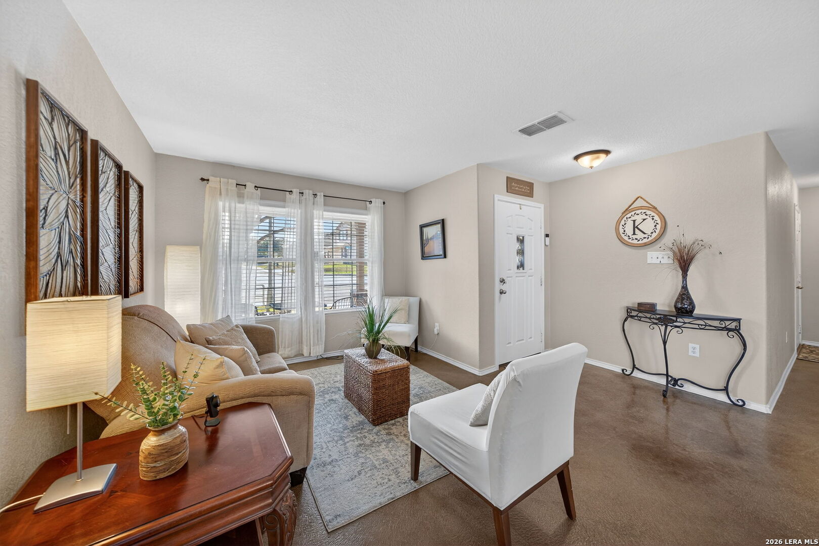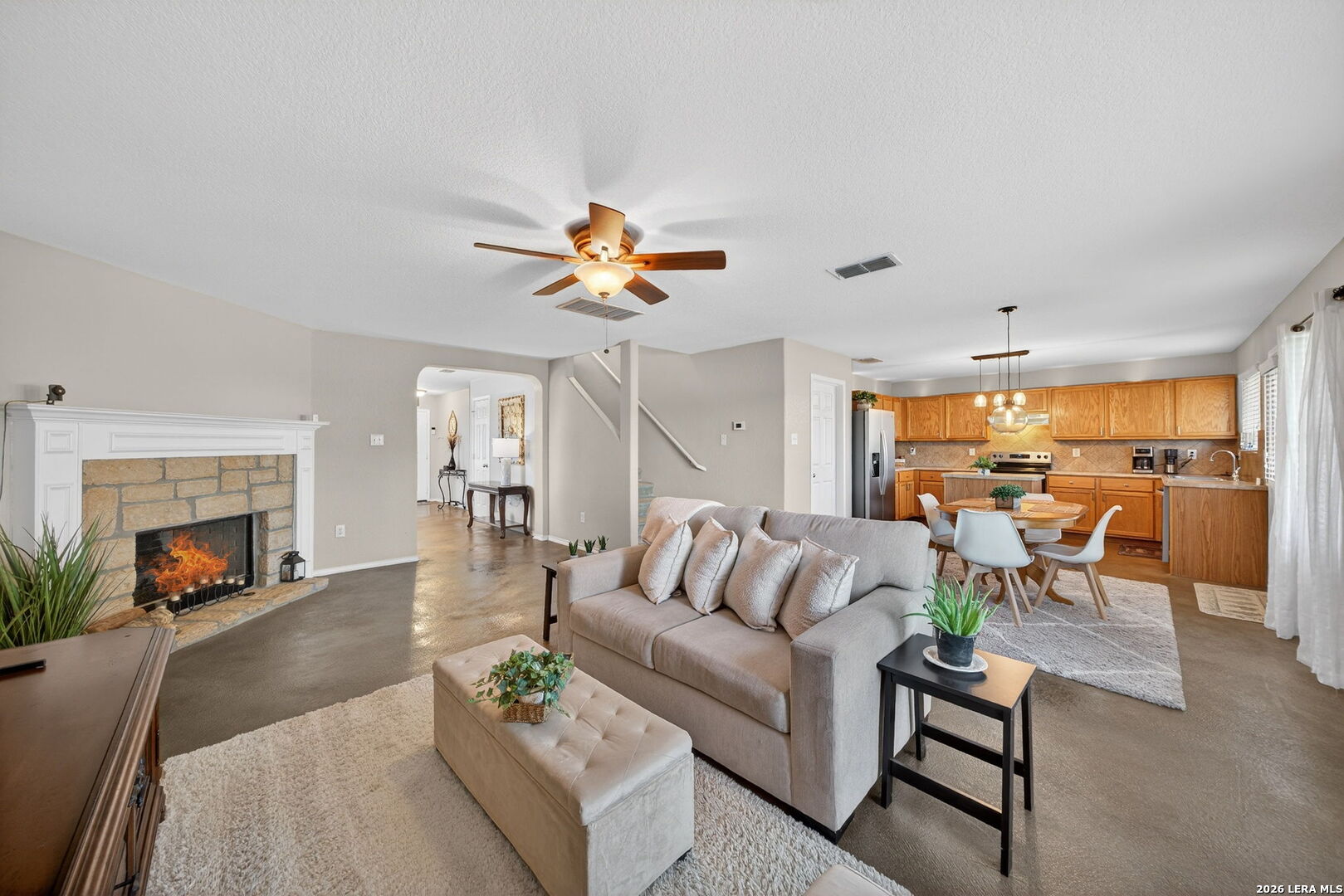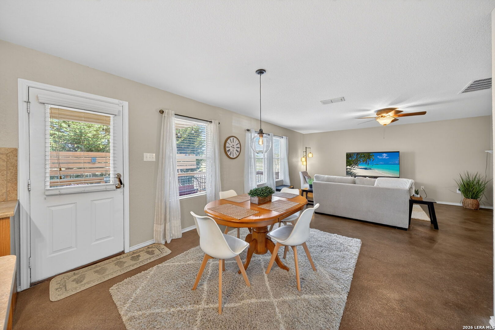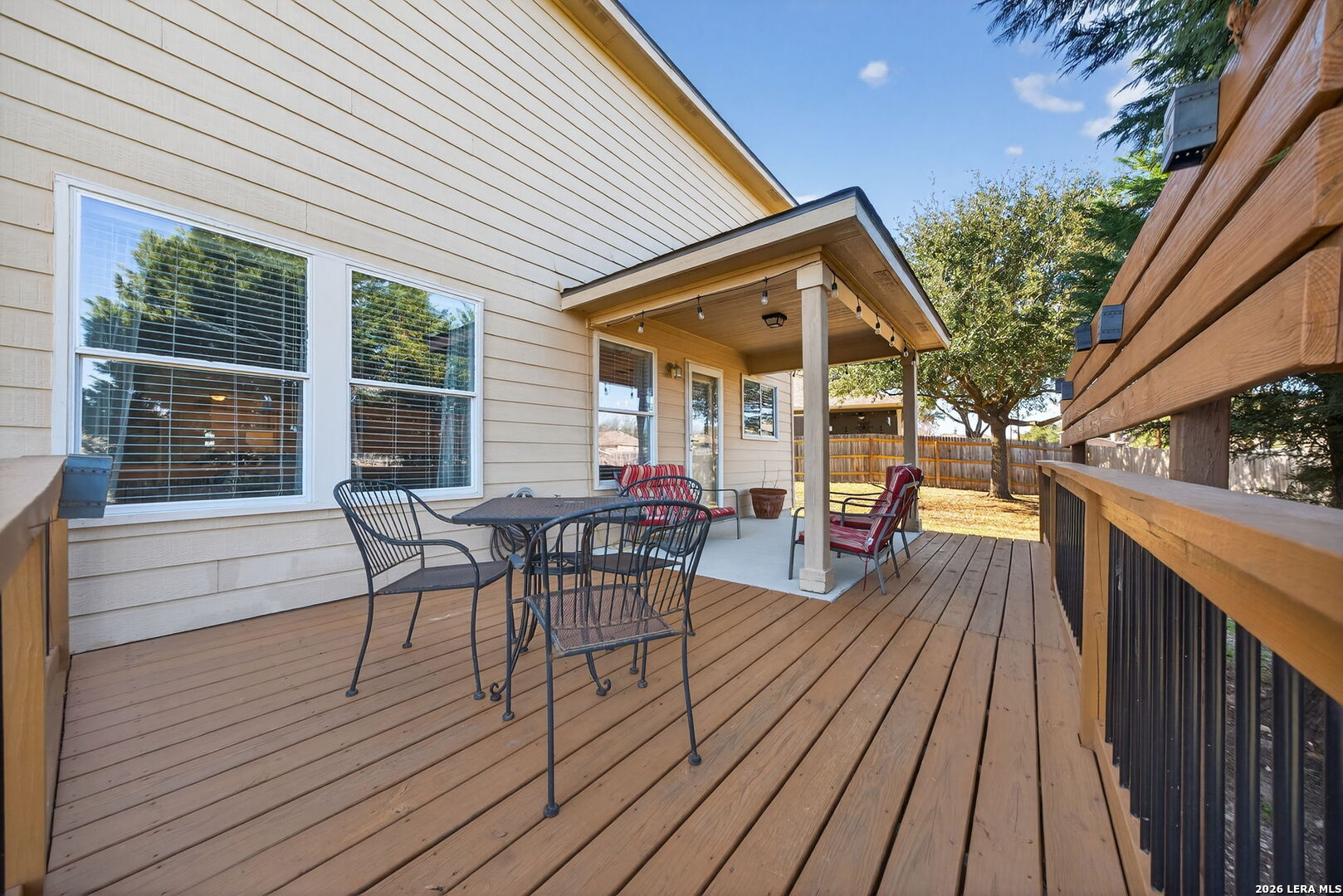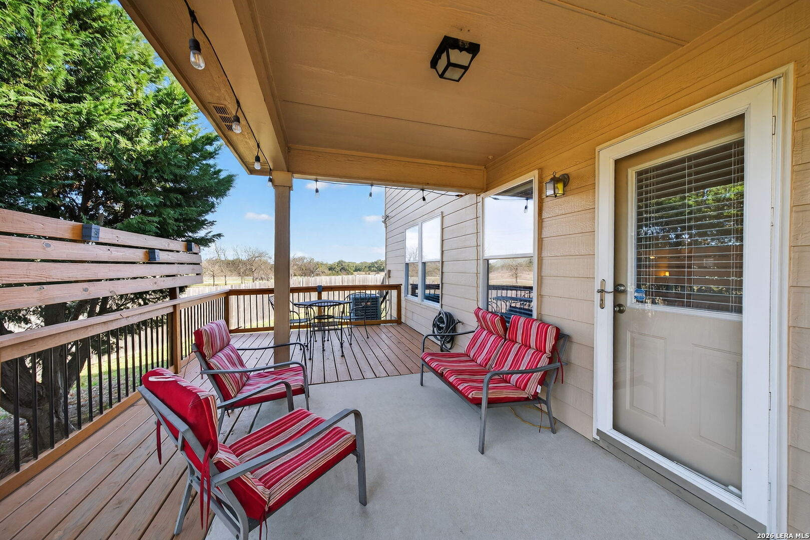 Tucked away on an oversized greenbelt lot, this 4 bedroom, 3 full bath home is conveniently located near Boerne just beyond Fair Oaks Ranch, in a quiet low traffic neighborhood that offers space, privacy, and a peaceful Hill Country setting. Upon entering, you are welcomed by a living and dining room combination that works beautifully for entertaining or flexible everyday use. The home opens into a large comfortable family room and a spacious kitchen featuring stained concrete floors, an open concept layout, an oversized pantry, and new kitchen appliances, with the refrigerator negotiable. A downstairs bedroom paired with a full bathroom just steps away creates a comfortable and functional setup for a mother in law, long term guests, or multigenerational living. Having this flexible space downstairs adds both practicality and long term value. The extra large primary bedroom upstairs offers a relaxing retreat with plenty of room to unwind. Step outside to the covered patio overlooking the greenbelt, where the setting invites you to relax, entertain, or simply enjoy the surrounding nature. The home has been well cared for and thoughtfully maintained, offering a warm inviting feel throughout. Located in Boerne ISD with no city taxes, this home blends quiet spacious living with convenient access to Boerne's shops, dining, and everyday amenities.