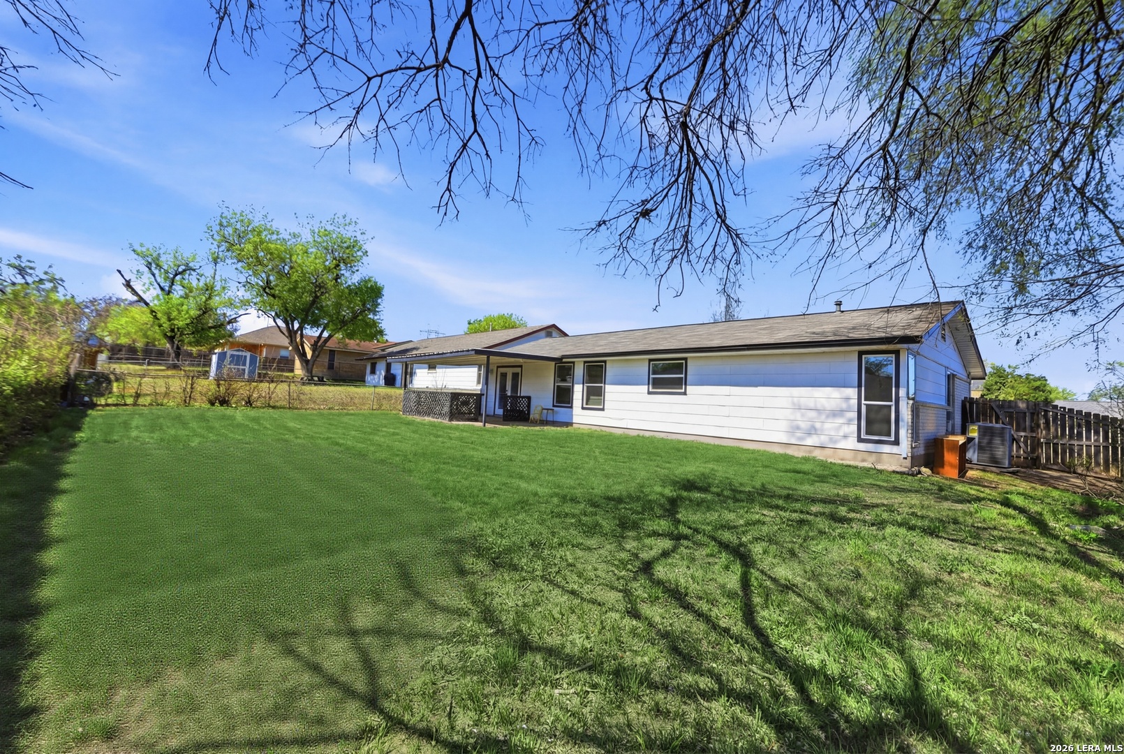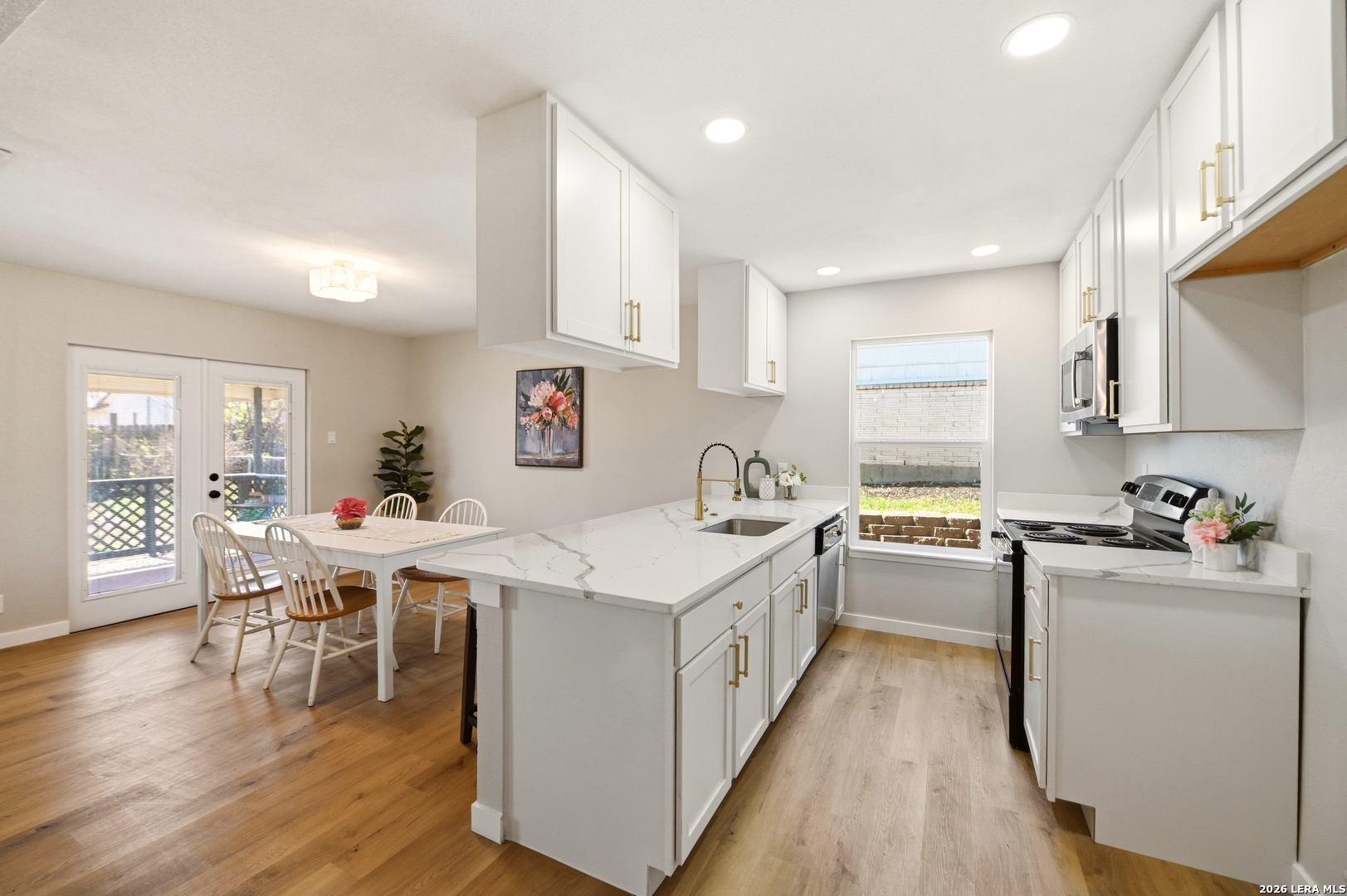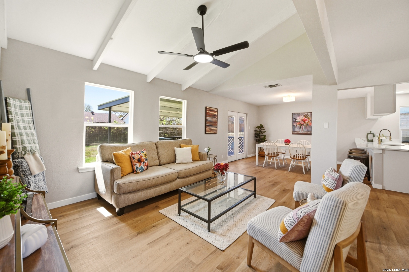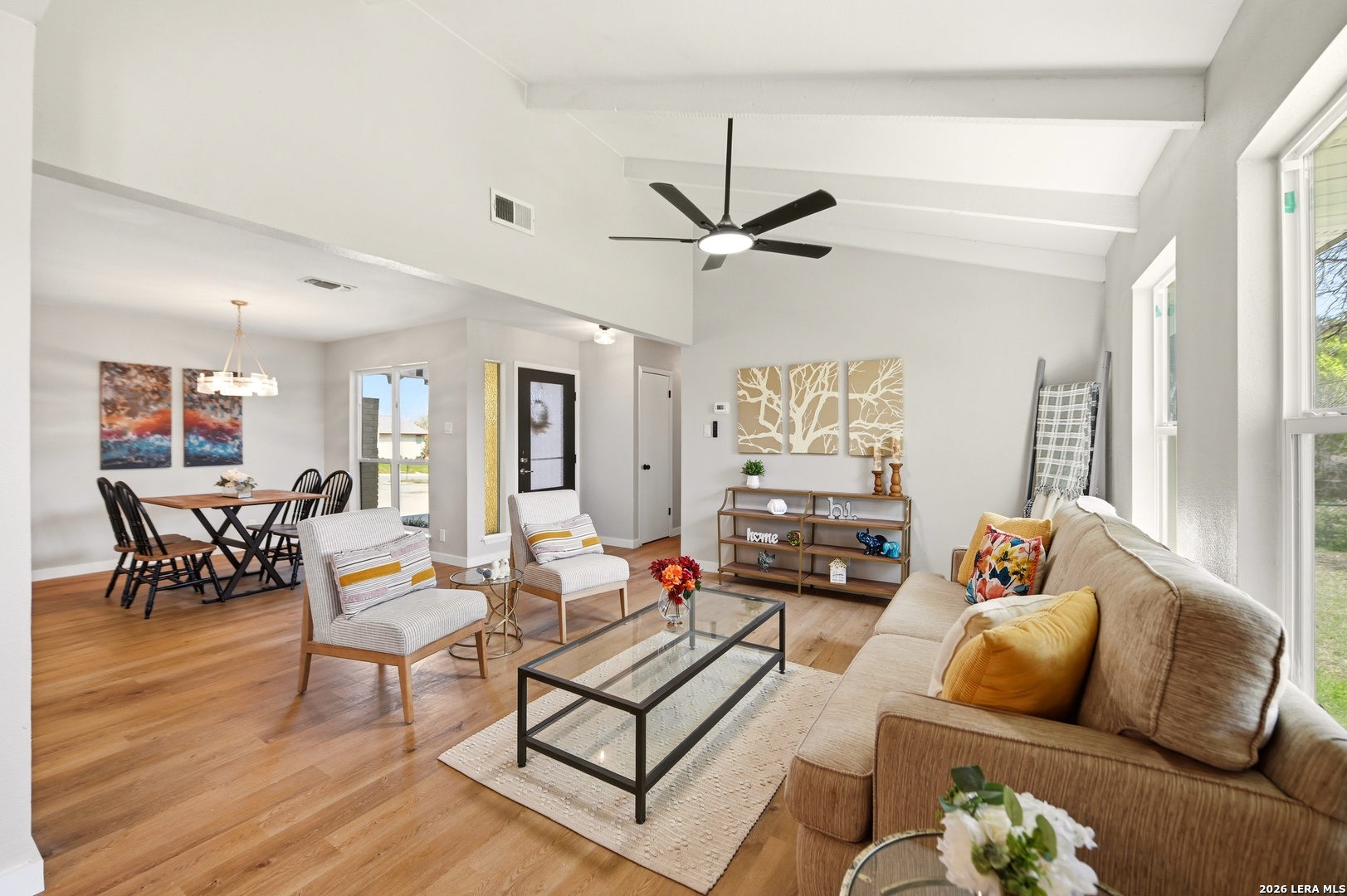 Better than new and beautifully reimagined from top to bottom, this light-filled home offers beautiful updates, soaring ceilings, a seamless open-concept layout designed for both everyday living and effortless entertaining. Fresh interior paint and brand-new flooring flow throughout the home, creating a clean, modern feel from top to bottom. The fully updated kitchen features brand-new cabinetry, sleek quartz countertops, stainless steel appliances, a new sink and faucet, and a spacious peninsula with counter-height seating. With two spacious dining areas, enjoy flexible use for dining, entertaining, or a bonus room/office setup. Major system upgrades provide peace of mind, including a brand-new roof, new HVAC system, and all new windows. Making this home as efficient as it is beautiful. Step outside to enjoy a generously sized yard shaded by mature trees...perfect for relaxing, entertaining, or creating your own outdoor oasis. The home also features fresh exterior paint, enhancing its curb appeal and giving it a crisp, updated look. Tucked away on a quiet street, yet just minutes from I-35, Loop 1604, and Wurzbach Parkway, this home offers the ideal blend of peaceful living with unbeatable convenience to shopping, dining, and schools. Grass virtually enhanced.