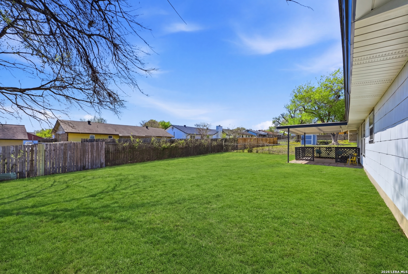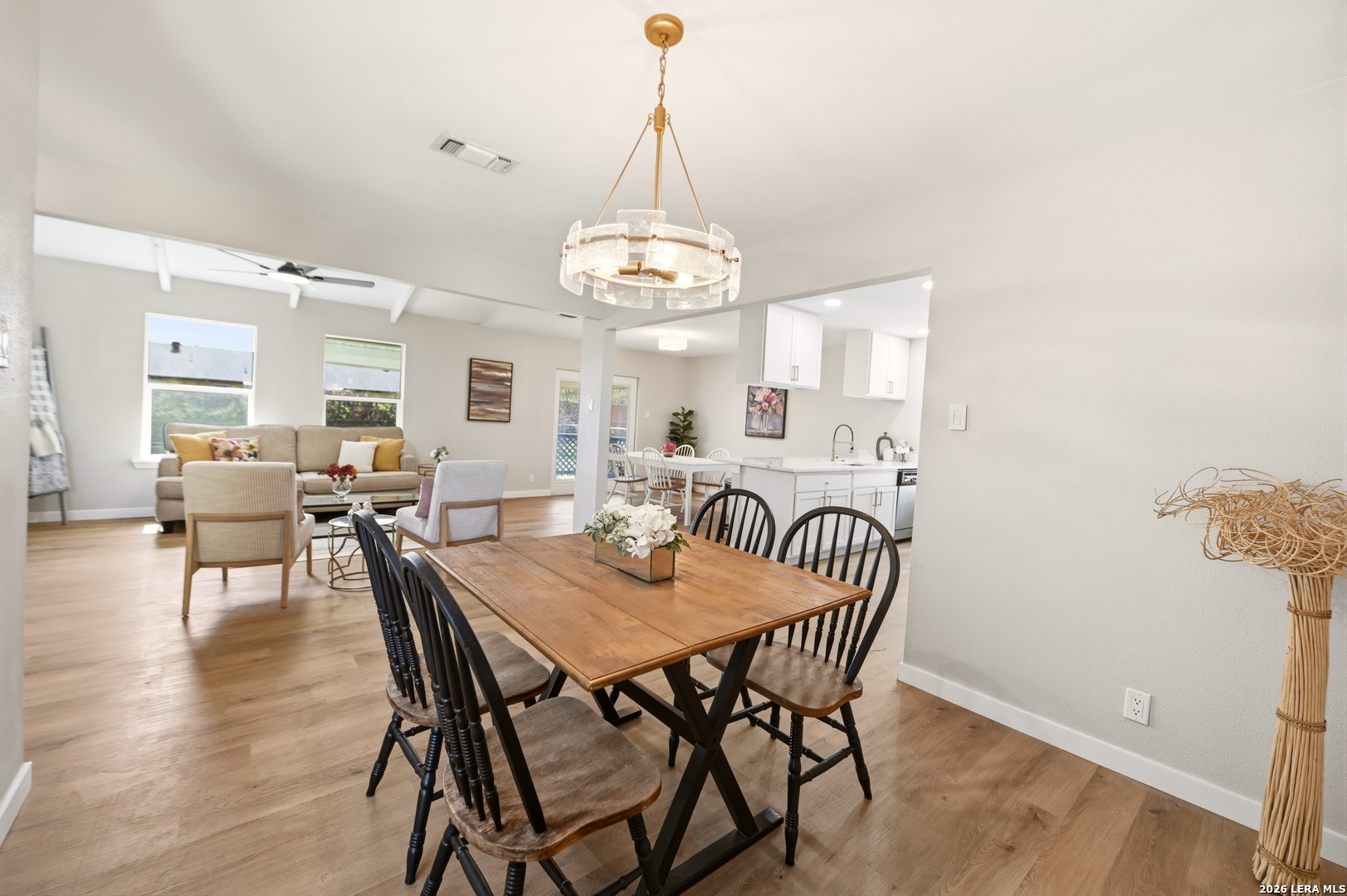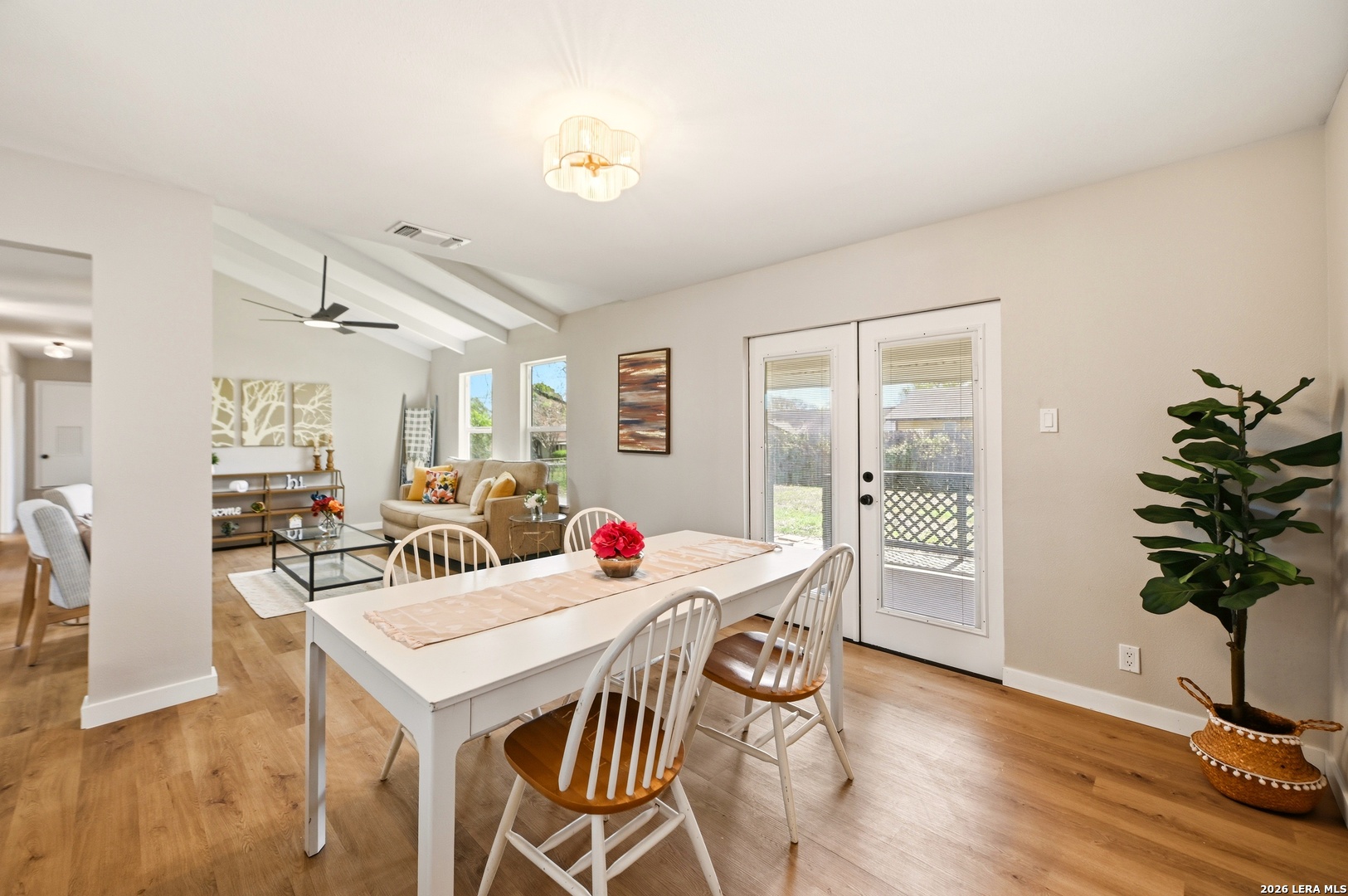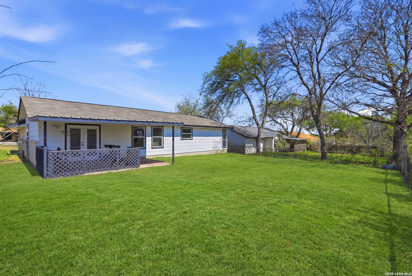 Better than new and beautifully reimagined from top to bottom, this light-filled home offers beautiful updates, soaring ceilings, a seamless open-concept layout designed for both everyday living and effortless entertaining. Fresh interior paint and brand-new flooring flow throughout the home, creating a clean, modern feel from top to bottom. The fully updated kitchen features brand-new cabinetry, sleek quartz countertops, stainless steel appliances, a new sink and faucet, and a spacious peninsula with counter-height seating. With two spacious dining areas, enjoy flexible use for dining, entertaining, or a bonus room/office setup. Major system upgrades provide peace of mind, including a brand-new roof, new HVAC system, and all new windows. Making this home as efficient as it is beautiful. Step outside to enjoy a generously sized yard shaded by mature trees...perfect for relaxing, entertaining, or creating your own outdoor oasis. The home also features fresh exterior paint, enhancing its curb appeal and giving it a crisp, updated look. Tucked away on a quiet street, yet just minutes from I-35, Loop 1604, and Wurzbach Parkway, this home offers the ideal blend of peaceful living with unbeatable convenience to shopping, dining, and schools. Grass virtually enhanced.