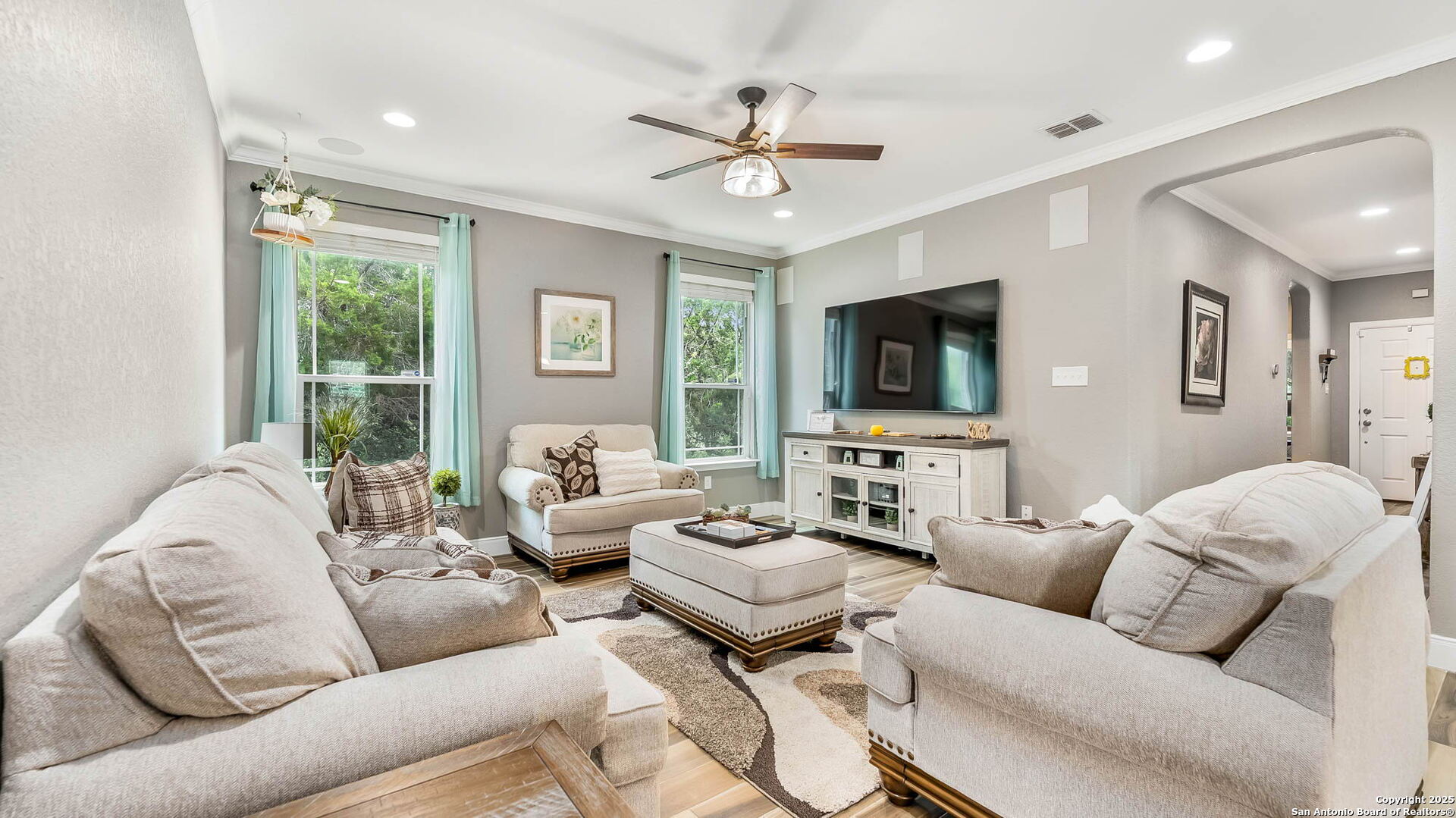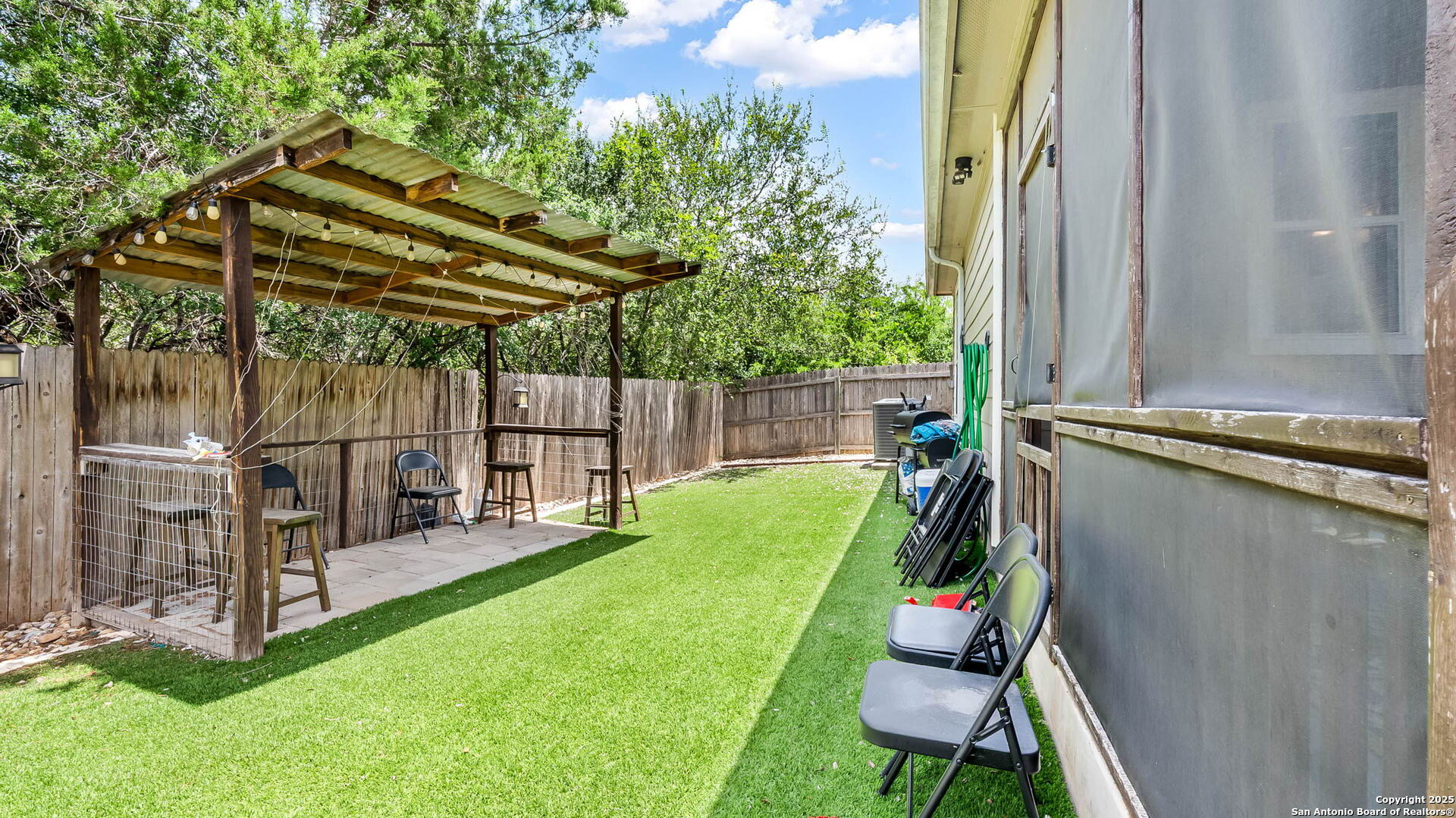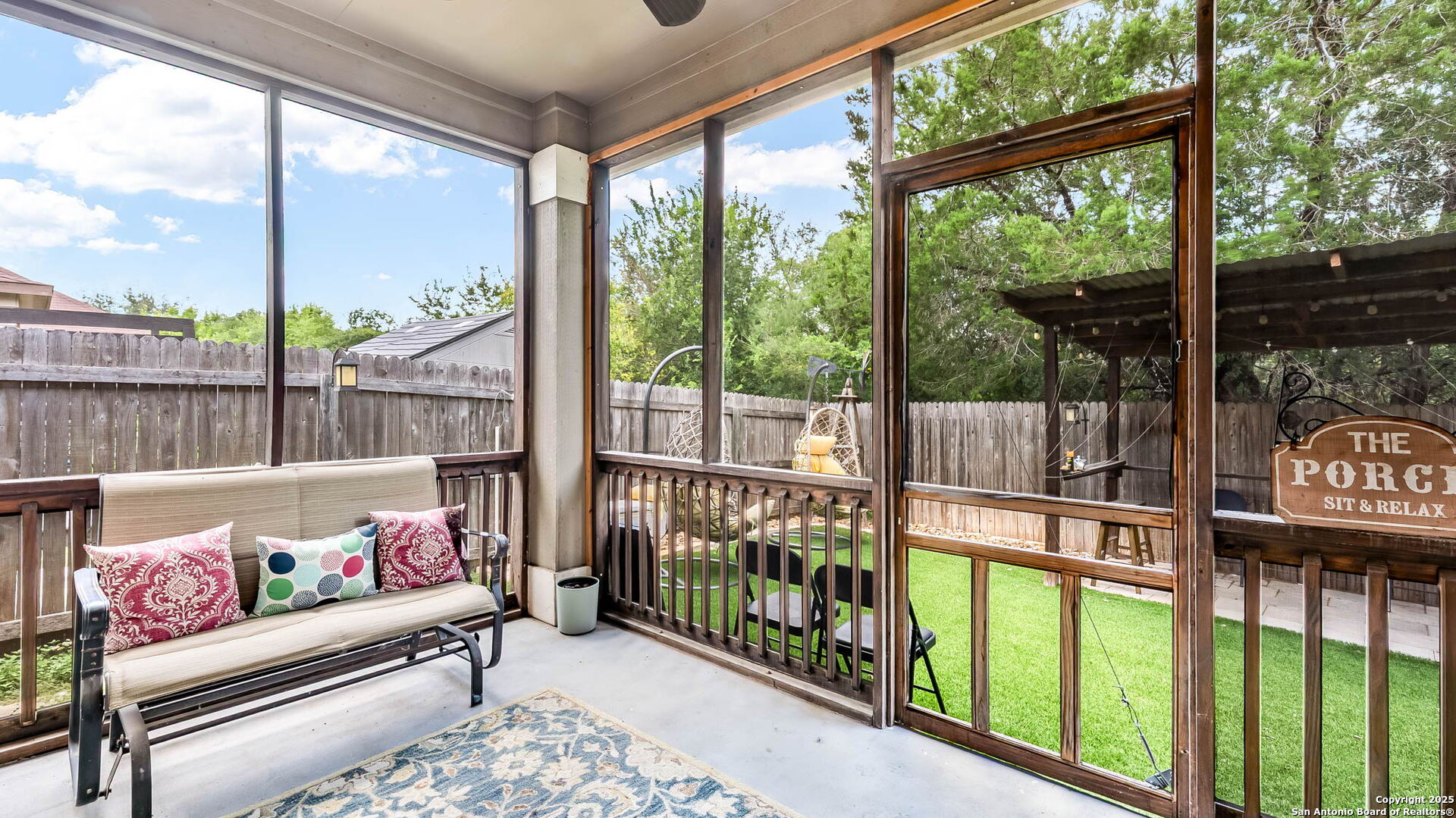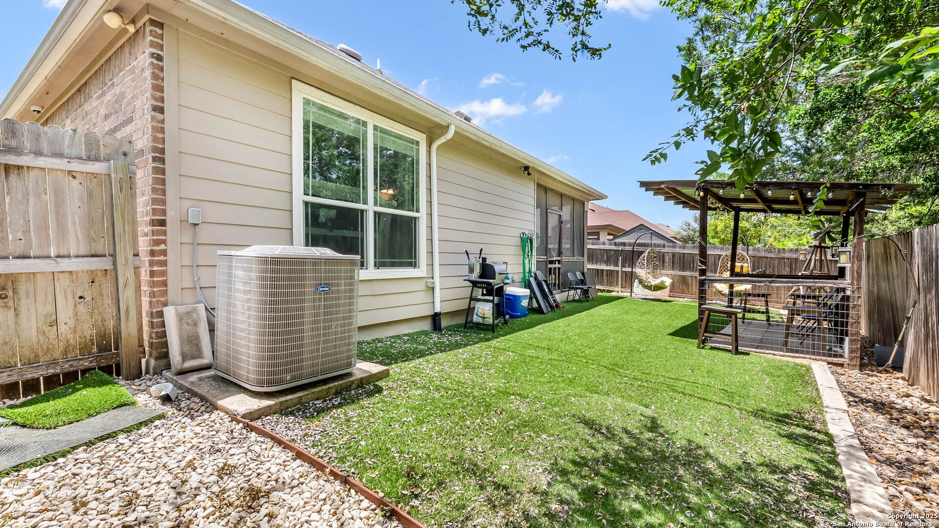 Must see this charming 3bedroom-2bath home in the highly sought after subdivision of Cross Creek in the Alamo Ranch area. It features 1646 square feet of beautiful living space with rustic wood-plank style tile floors, open spaced kitchen, open floor plan, split bedrooms, ceiling fans, 9-foot ceilings, and a screened-in back patio. The living area is Home Theater system ready! It is equipped with in-ceiling speakers and in-wall flush speakers for your 5.1 surround sound needs. Additionally, the patio area is equipped with all-weather speakers as well. The backyard features professionally installed low maintenance artificial turf and is pet/child friendly and safe. This home also features an in-ground sprinkler system and is equipped with numerous ADT Security devices/cameras. The laundry room includes a washer and dryer. The LG smart washer can be controlled by your phone or smart device and can be started remotely if you are not home. New carpet has also been installed in all bedrooms. If you're looking for privacy and a peaceful living environment, this home backs up to a green belt and is situated on a large Cul-de-sac with only one neighbor next to you. Handy access to Hwy 151, Loop 1604 and Loop 410. It is conveniently close to Helotes, Seaworld, Six Flags, various restaurants, Casa Blanca movie theater, fast food locations, La Cantera, JBSA-Lackland and many other business establishments. Do not miss seeing this beautiful home! It's move-in ready!