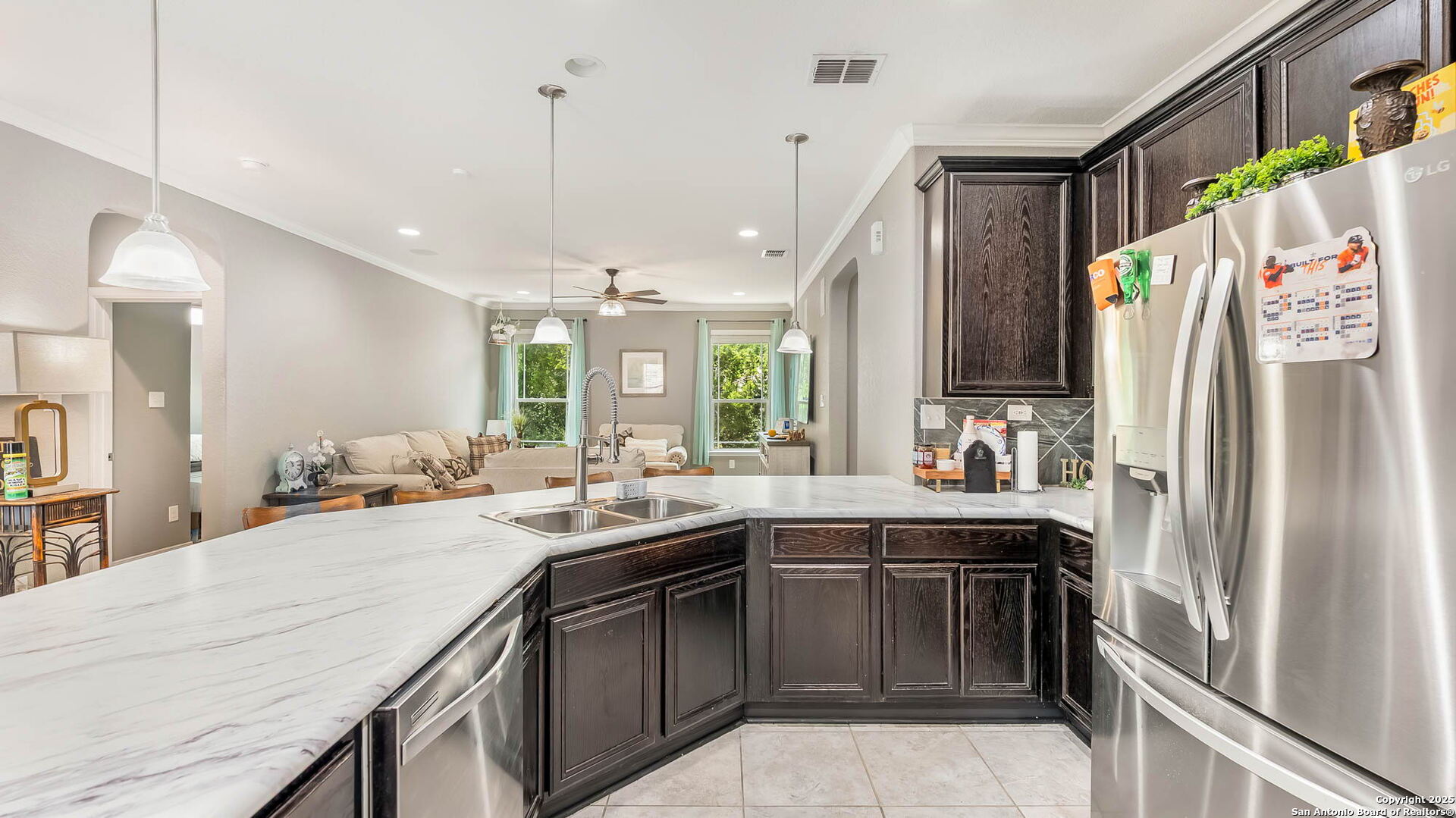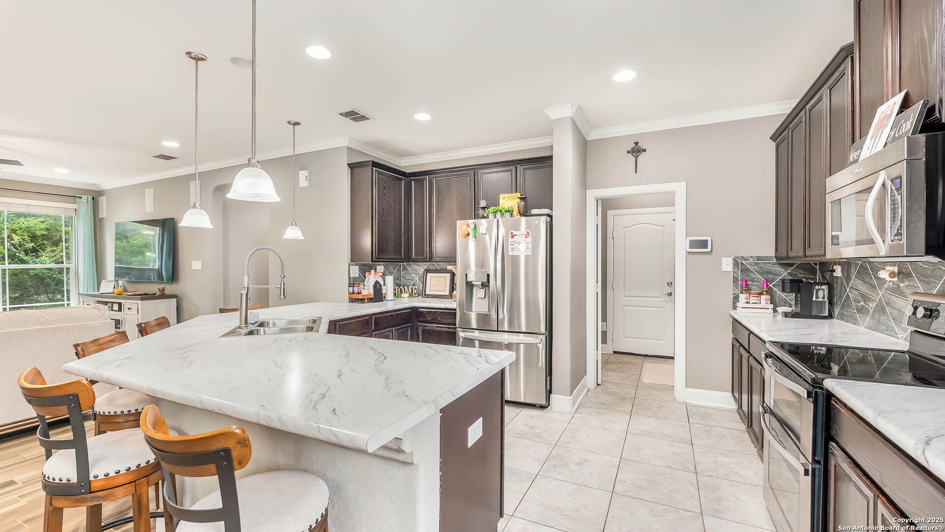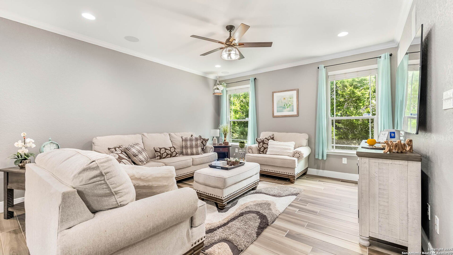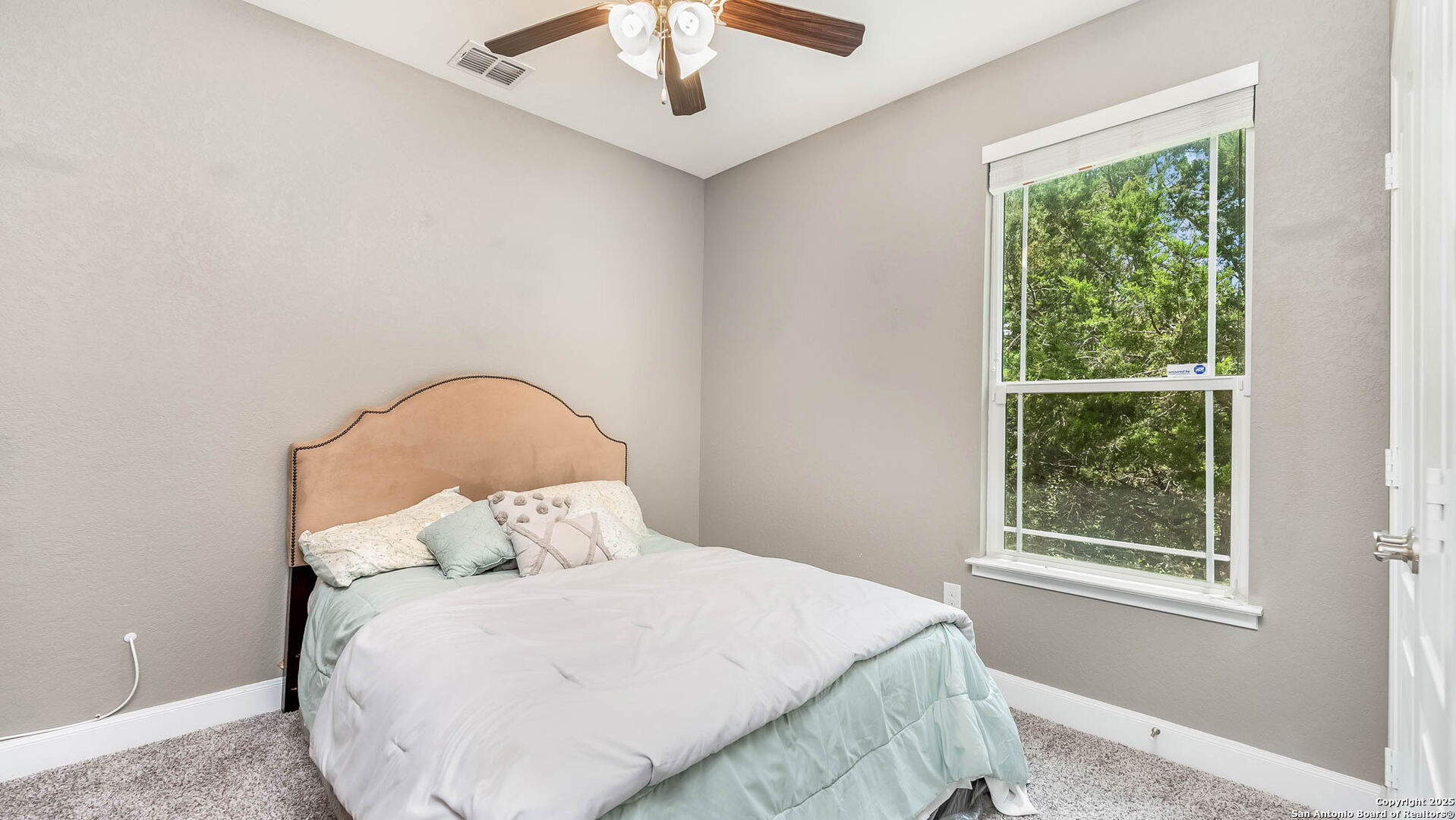 Must see this charming 3bedroom-2bath home in the highly sought after subdivision of Cross Creek in the Alamo Ranch area. It features 1646 square feet of beautiful living space with rustic wood-plank style tile floors, open spaced kitchen, open floor plan, split bedrooms, ceiling fans, 9-foot ceilings, and a screened-in back patio. The living area is Home Theater system ready! It is equipped with in-ceiling speakers and in-wall flush speakers for your 5.1 surround sound needs. Additionally, the patio area is equipped with all-weather speakers as well. The backyard features professionally installed low maintenance artificial turf and is pet/child friendly and safe. This home also features an in-ground sprinkler system and is equipped with numerous ADT Security devices/cameras. The laundry room includes a washer and dryer. The LG smart washer can be controlled by your phone or smart device and can be started remotely if you are not home. New carpet has also been installed in all bedrooms. If you're looking for privacy and a peaceful living environment, this home backs up to a green belt and is situated on a large Cul-de-sac with only one neighbor next to you. Handy access to Hwy 151, Loop 1604 and Loop 410. It is conveniently close to Helotes, Seaworld, Six Flags, various restaurants, Casa Blanca movie theater, fast food locations, La Cantera, JBSA-Lackland and many other business establishments. Do not miss seeing this beautiful home! It's move-in ready!