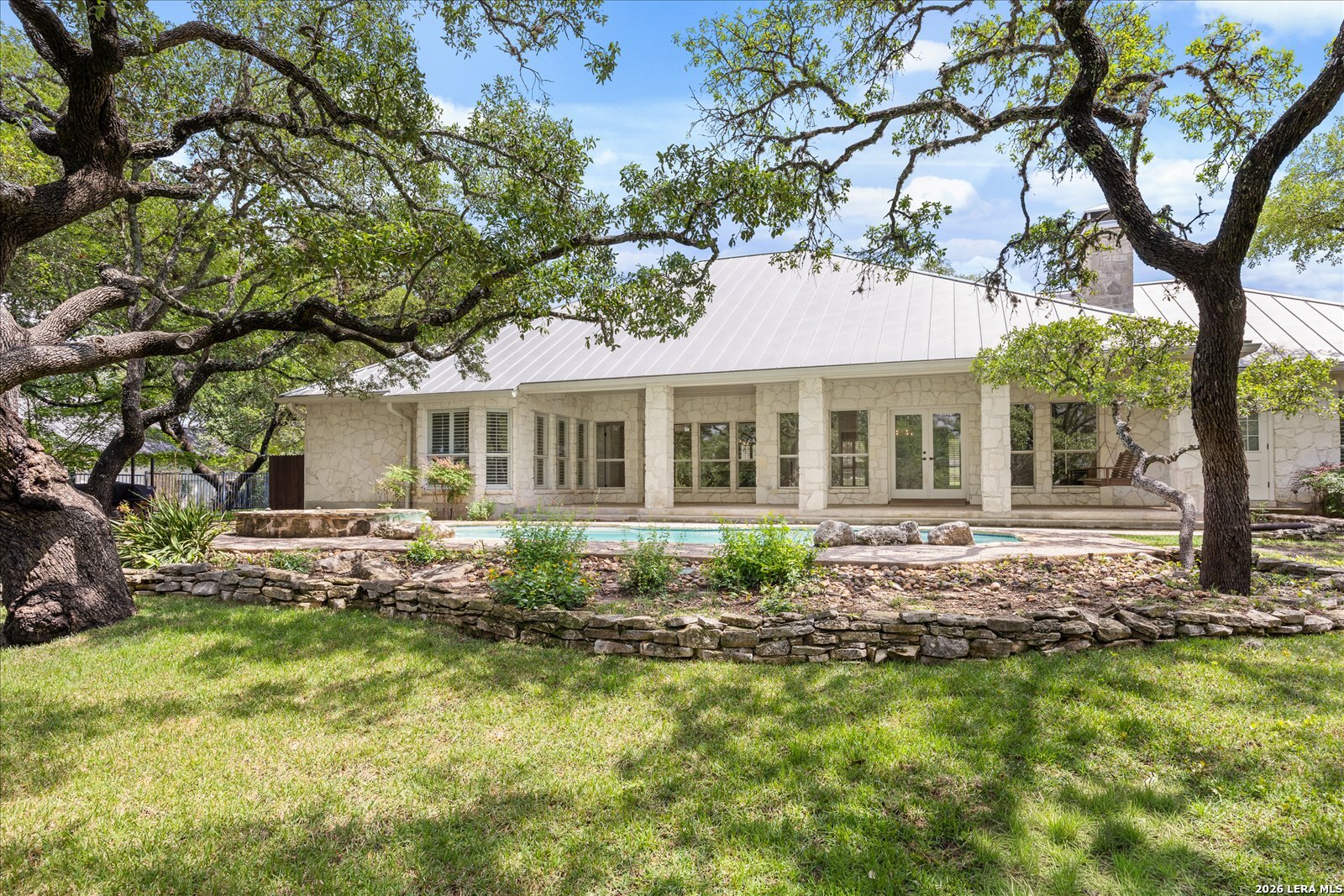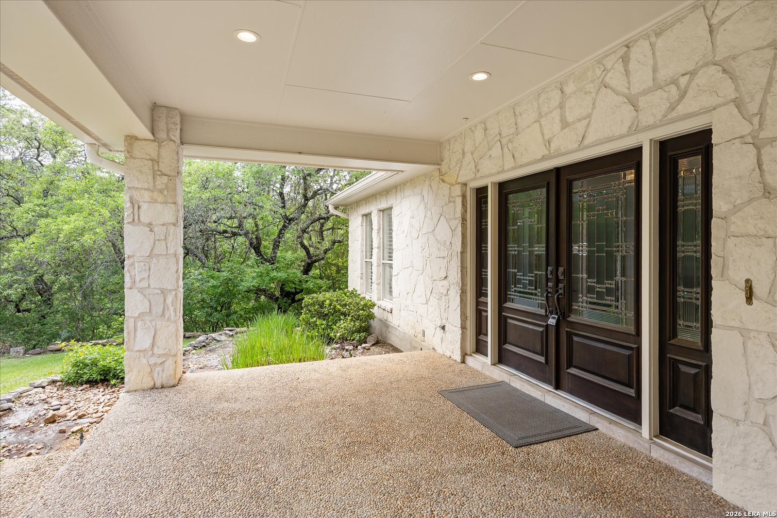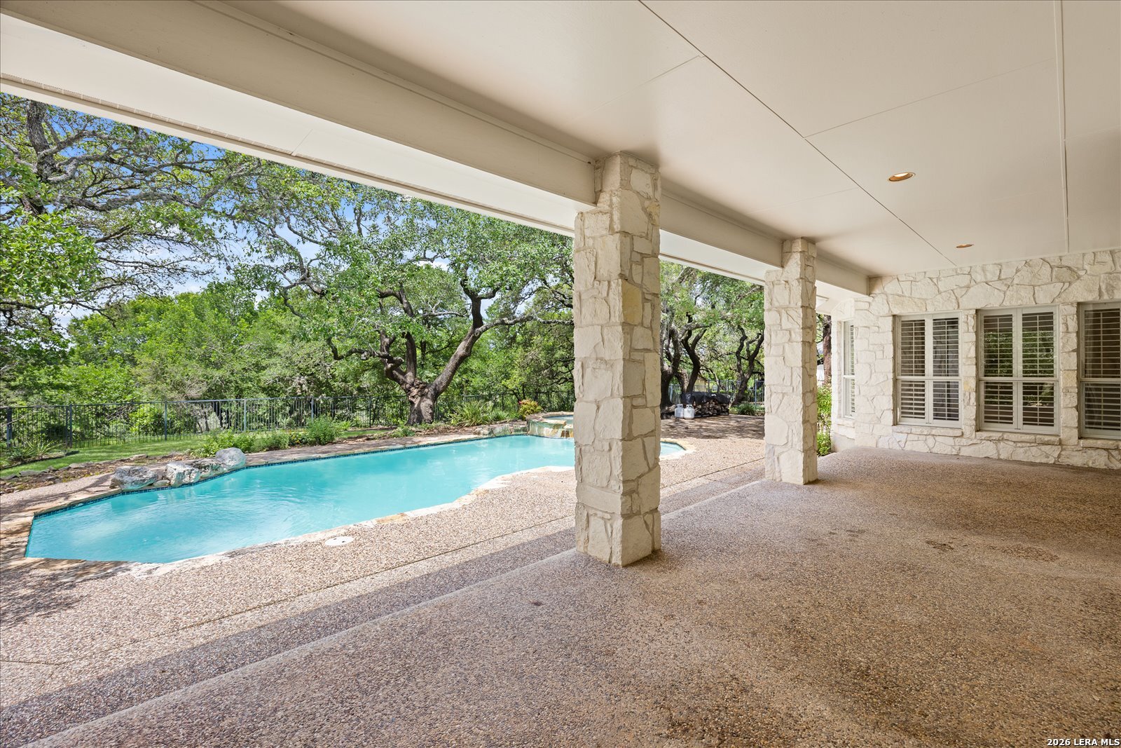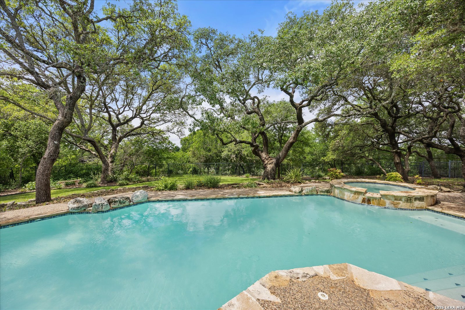 Beautifully updated single-story rock home nestled on a private 1-acre lot in Fair Oaks Ranch, backing to a wooded greenbelt along Cibolo Creek. This 3-bedroom, 3-bath residence offers 2,982 square feet of thoughtfully designed living space with no carpet throughout. The extensively remodeled interior features rich wood flooring, oversized tile, plantation shutters, and custom built-ins. The chef's kitchen is a true centerpiece, showcasing a stunning 4' x 7' granite island, stainless steel appliances, and a GE Monogram gas cooktop-perfect for both everyday living and entertaining. All bathrooms have been tastefully updated with granite and tile finishes. The spacious primary suite offers a spa-like retreat with a large custom closet, walk-in shower, and direct access to the backyard. Additional highlights include an oversized utility room and a climate-controlled flex space in the garage-ideal for a gym, office, or hobby room. Step outside to enjoy the covered patio overlooking a sparkling heated pool and spa, surrounded by mature oak trees and peaceful Hill Country views. With no rear neighbors and direct access to the natural beauty of Cibolo Creek, this property offers exceptional privacy and tranquility. Conveniently located just minutes from the Fair Oaks Ranch Country Club and zoned to highly acclaimed Boerne ISD, this home seamlessly blends luxury, comfort, and location.
