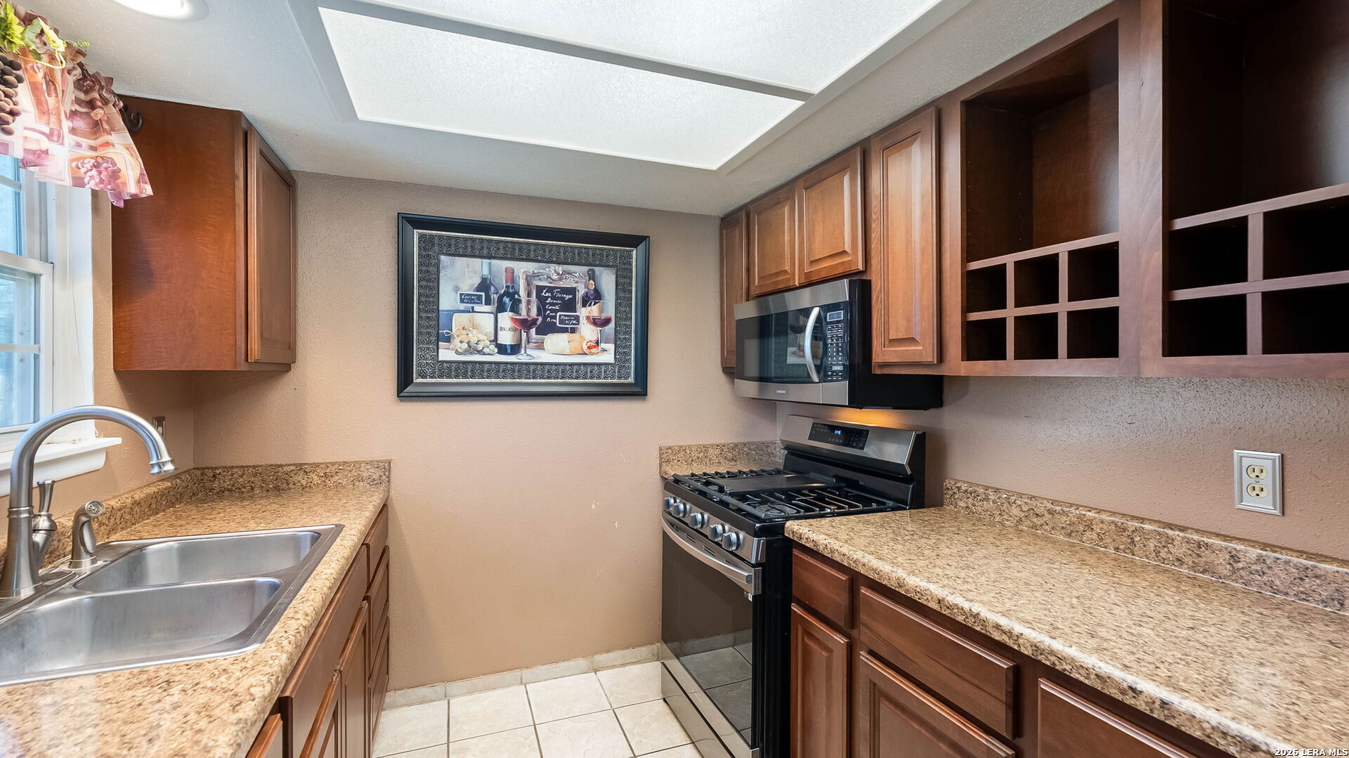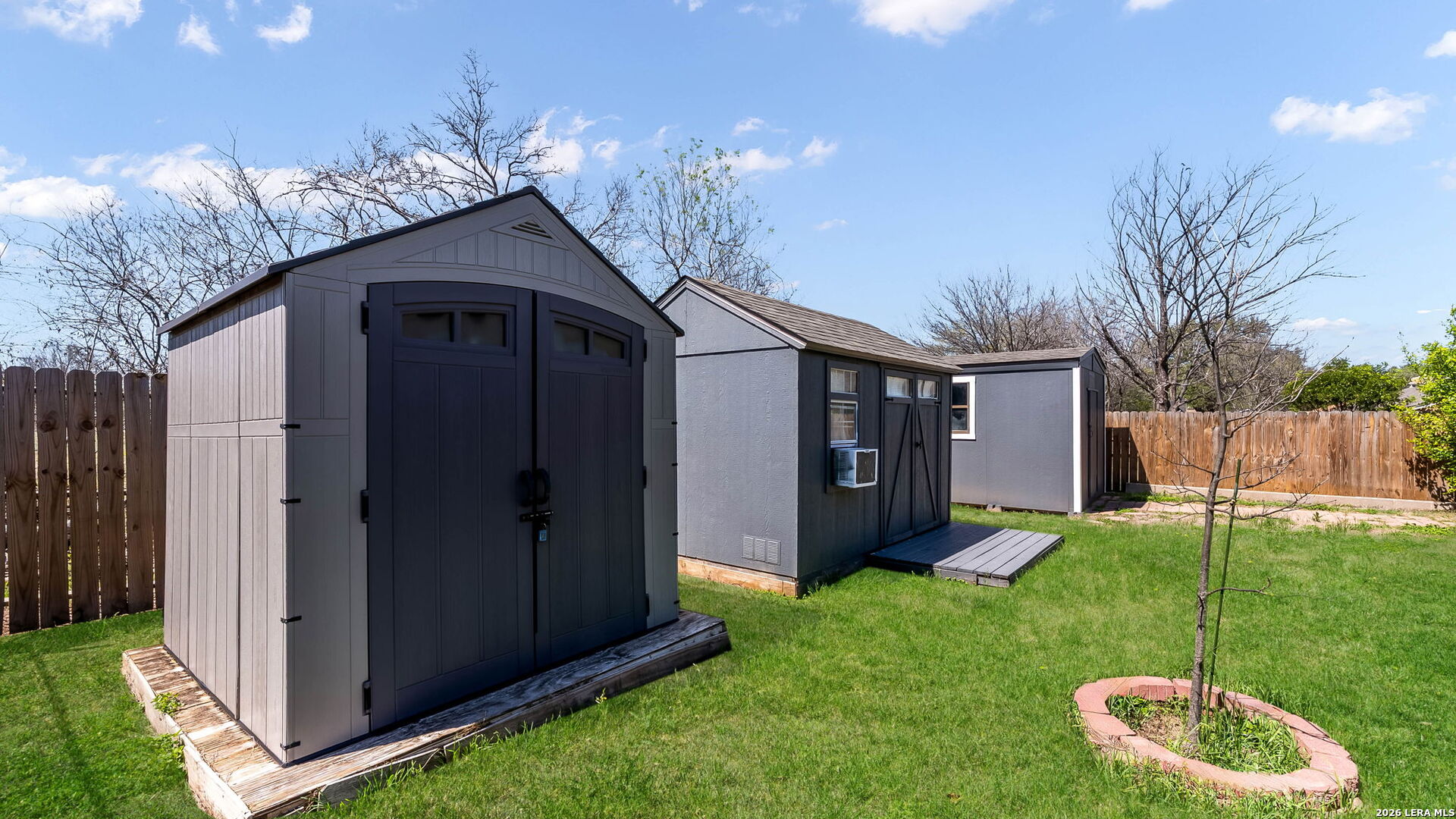 This house is well maintained and cozy.Single story. Close to restaurants and stores. Beautiful iron fencing in front for privacy with a huge driveway. The garage has been enclosed and has a fireplace for a theater room, family room or a large study. Large covered patio for BBQ gatherings and outdoor fun. There are 3 sheds out back and 2 of them have electricity and are climate controlled. There is also a dog/cat house in the back with ac and heater and is cross fenced to keep your pets contained. Large laundry room can be used as an indoor pet area. Located just outside NW Loop 410. Make this gem your home. Photos enhanced to show lawn with green grass.